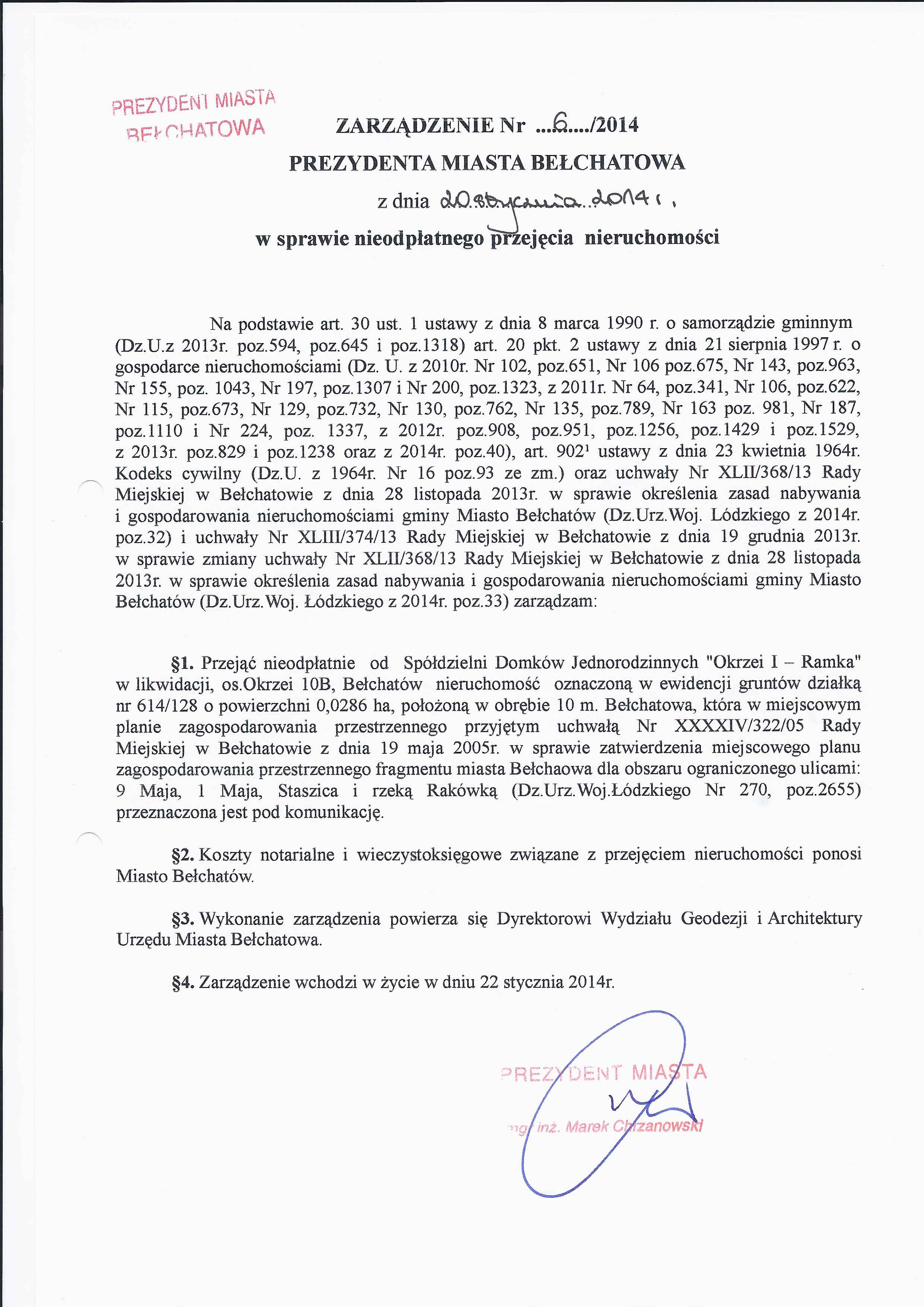 Zarządzenie Nr 6 z dnia 20 stycznia 2014 r. w/s nieodpłatnego przejęcia nieruchomości