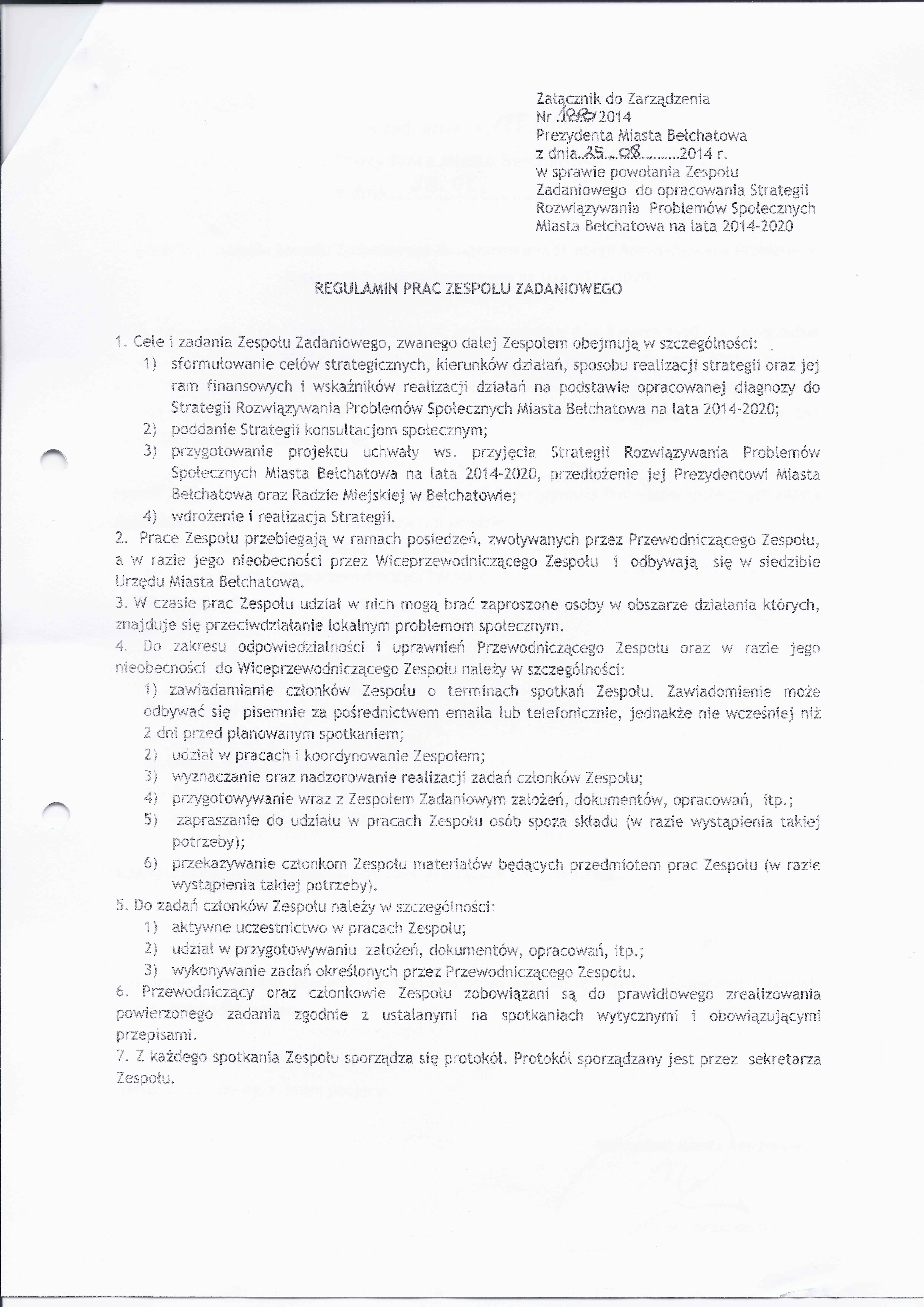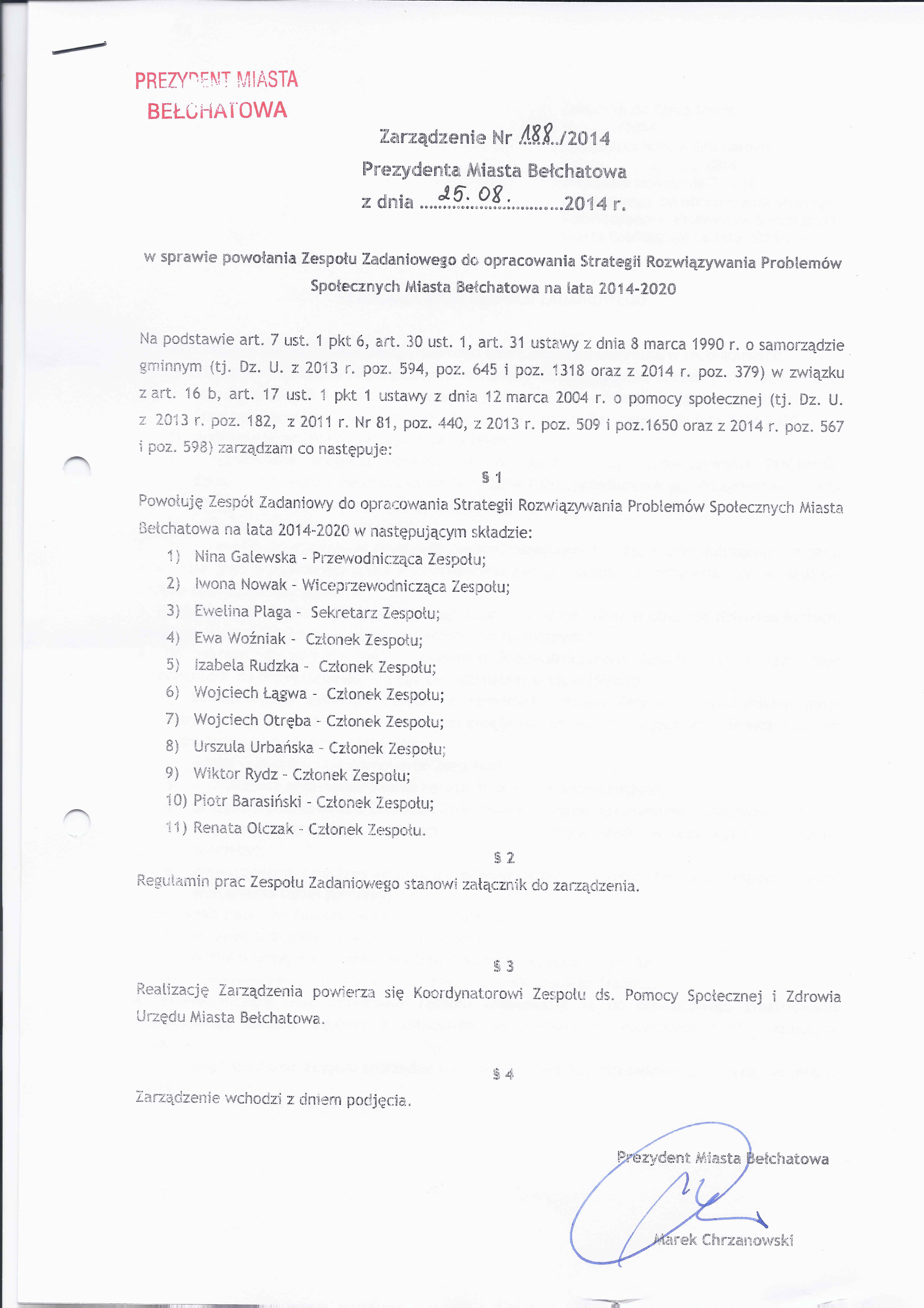 Zarządzenie Nr 188 z dnia 25 sierpnia 2014 r. w/s powołania Zespołu Zadaniowego do opracowania Strategii Rozwiązywania Problemów Społecznych Miasta Bełchatowa na lata 2014 -2020