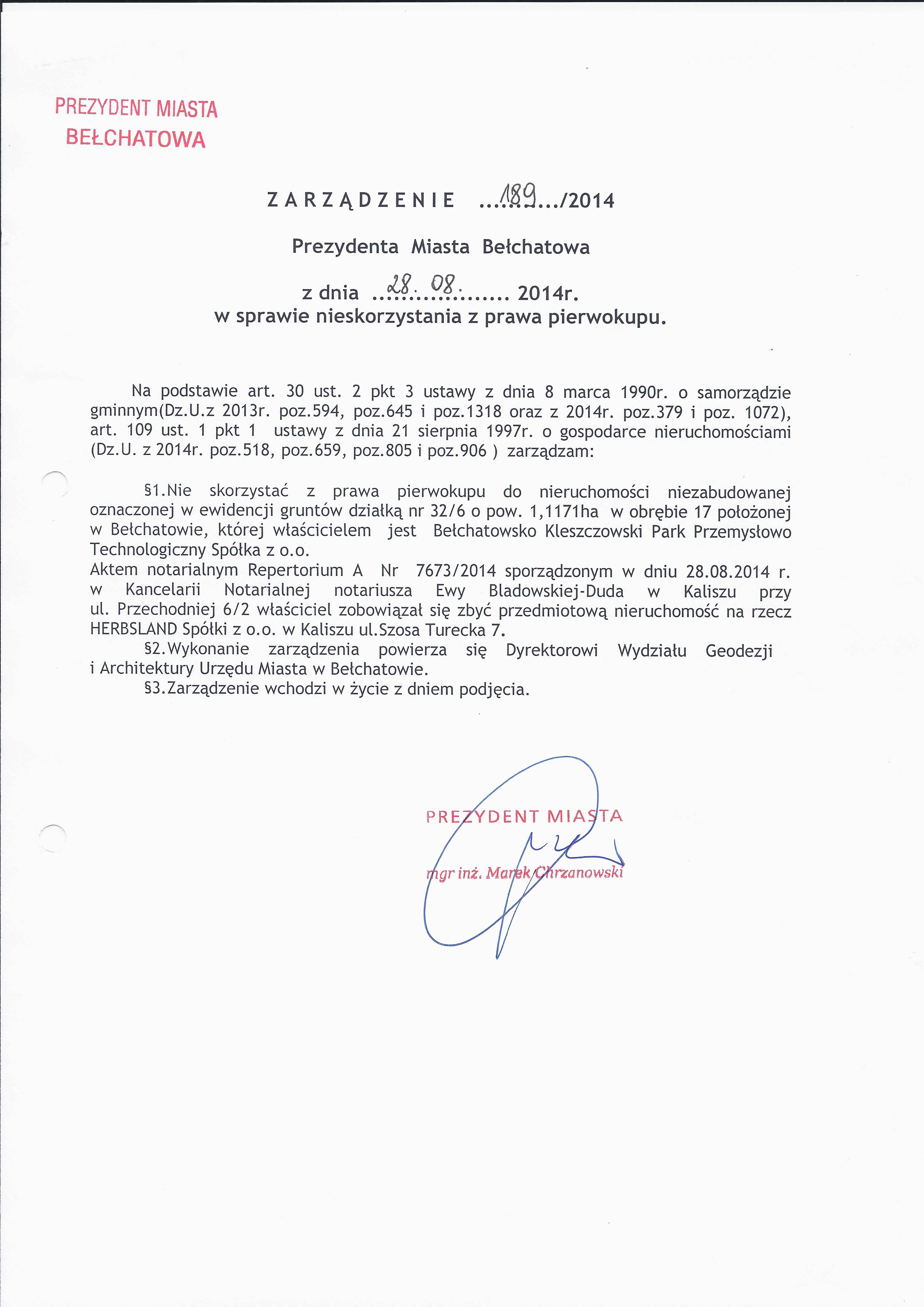Zarządzenie Nr 189 z dnia 28 sierpnia 2014 r. w/s nieskorzystania z prawa pierwokupu