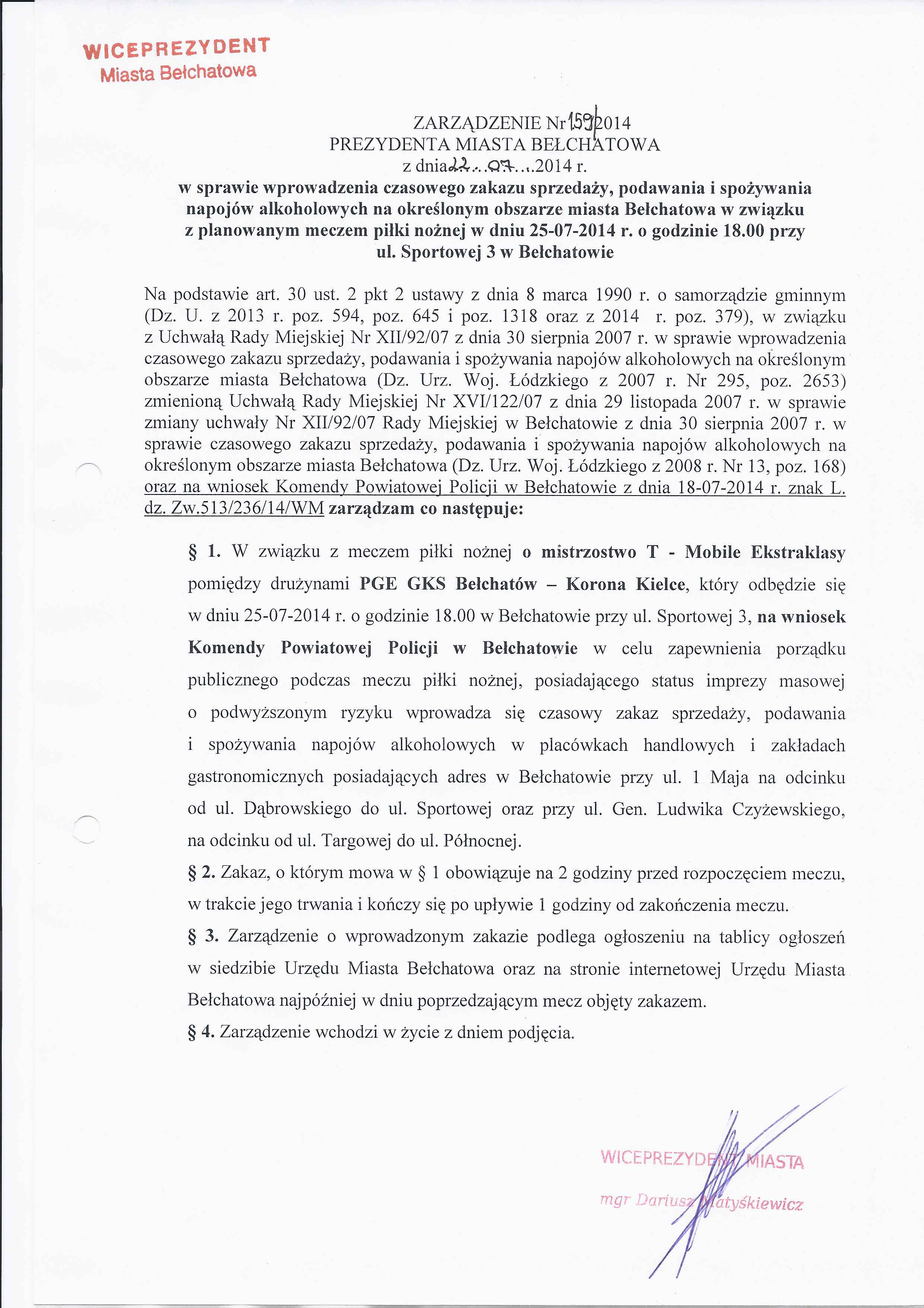 Zarządzenie Nr 159 z dnia 22 lipca 2014 r. w/s wprowadzenia czasowego zakazu sprzedaży, podawania i spożywania napojów alkoholowych na określonym obszarze miasta Bełchatowa w związku z planowanym meczem piłki nożnej w dniu 25-07-2014 r. o godzinie 18.00 przy ul. Sportowej 3 w Bełchatowie