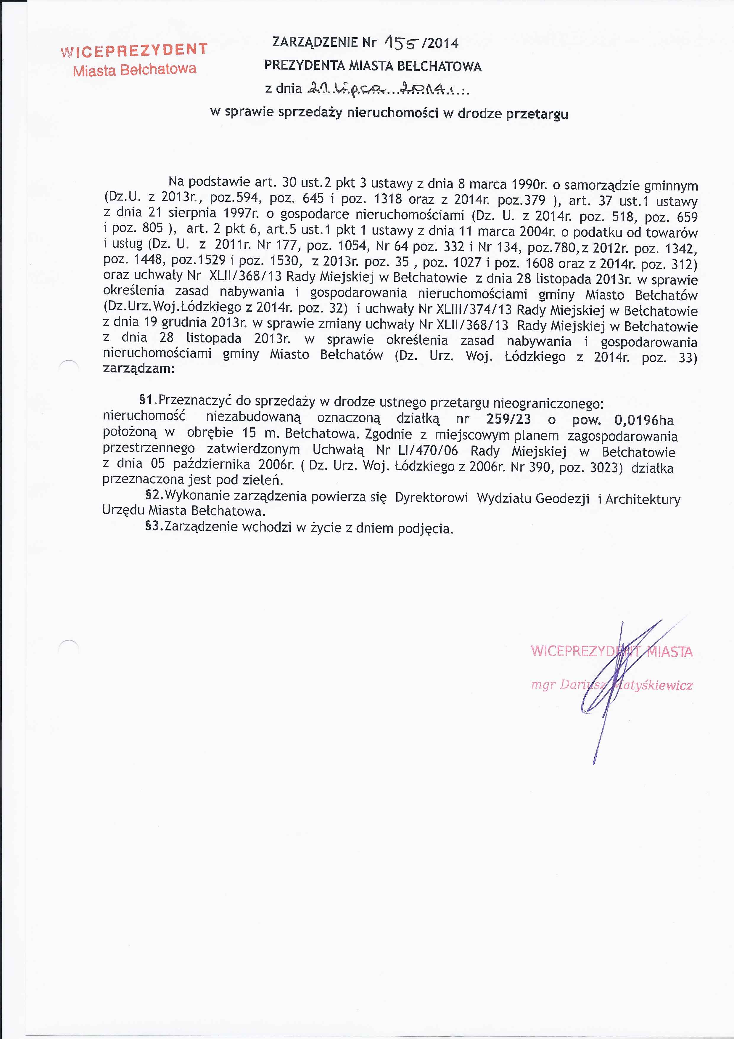 Zarządzenie Nr 155 z dnia 21 lipca 2014 r. w/s sprzedaży nieruchomości w drodze przetargu