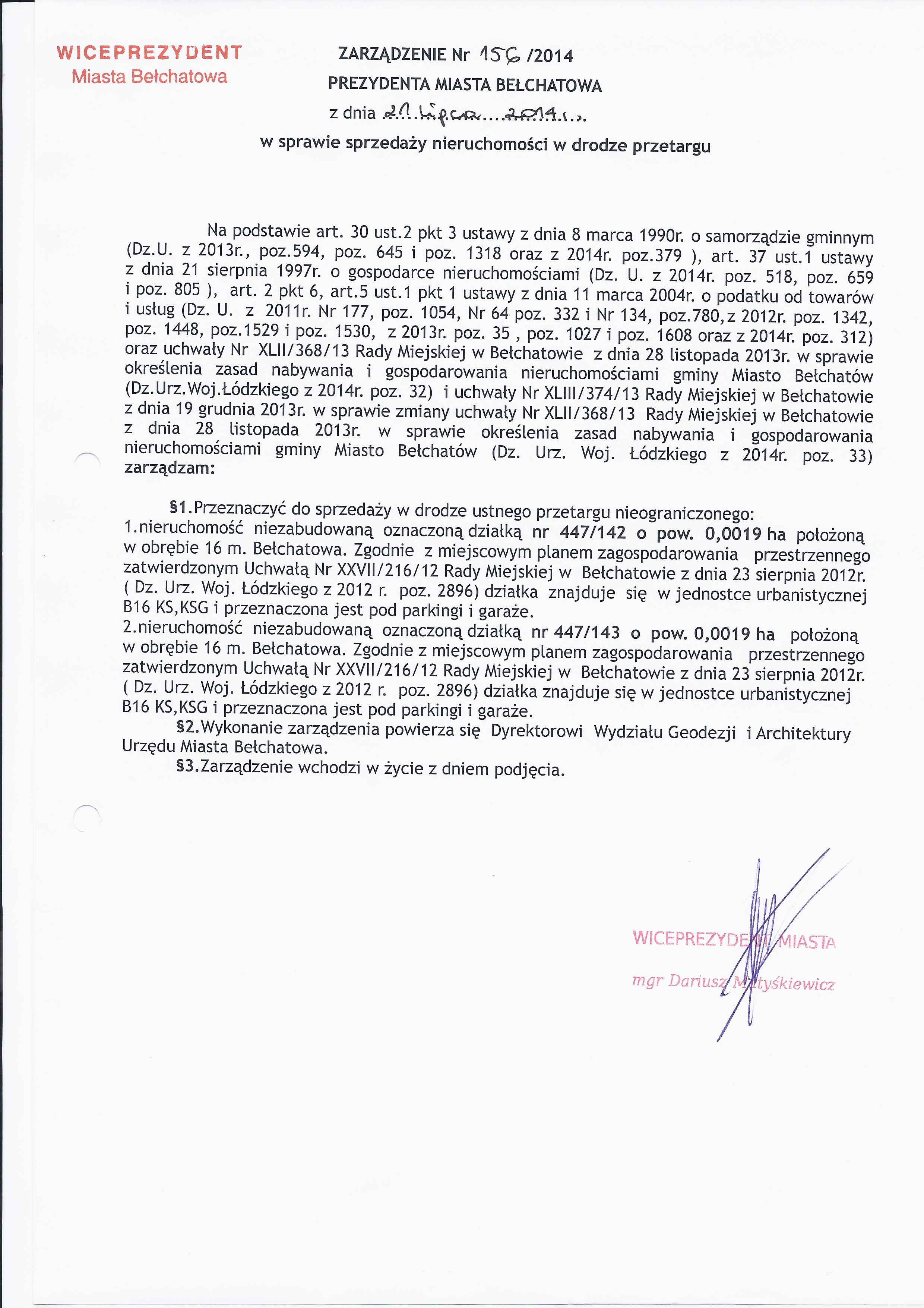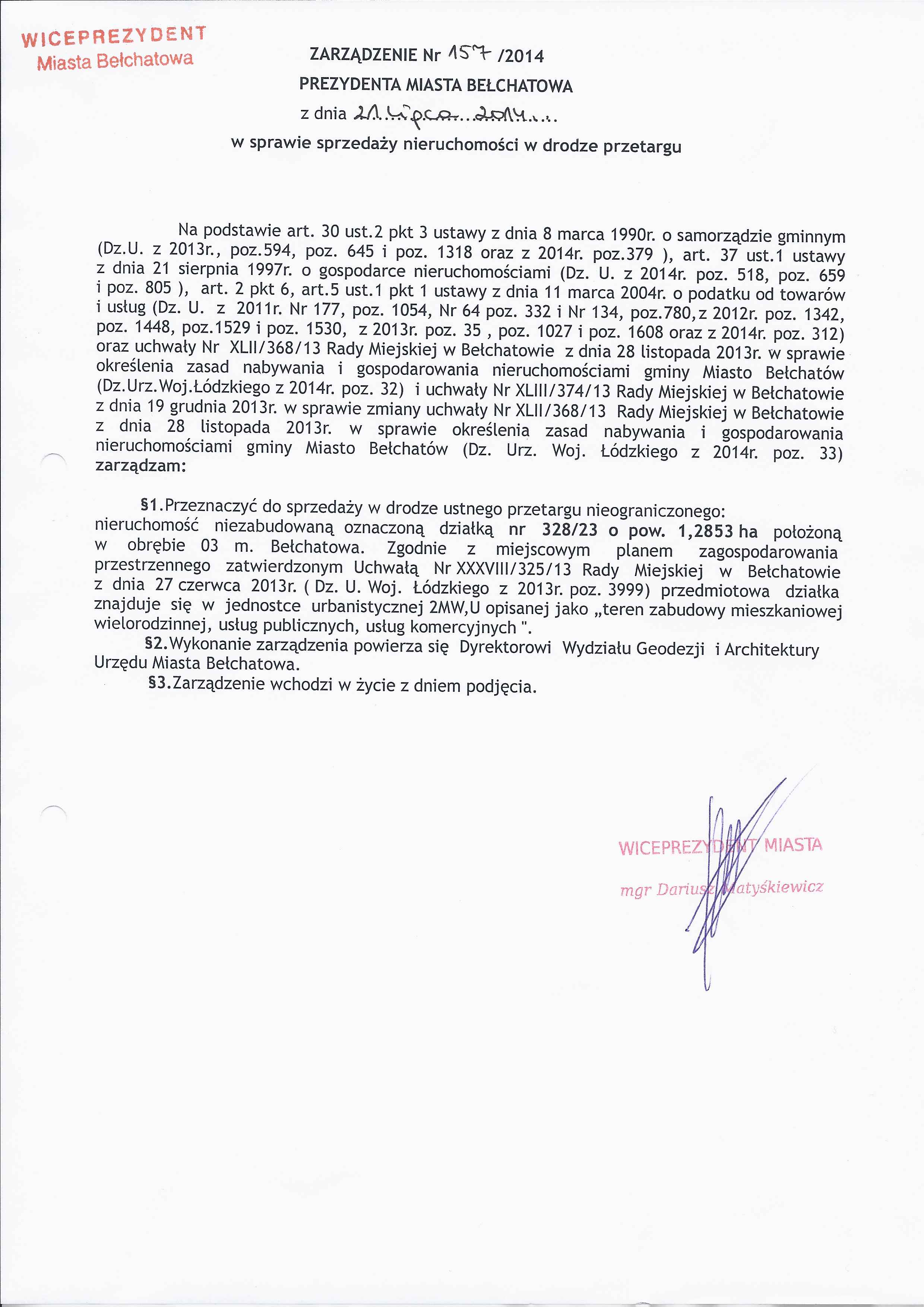 Zarządzenie Nr 157 z dnia 21 lipca 2014 r. w/s sprzedaży nieruchomości w drodze przetargu