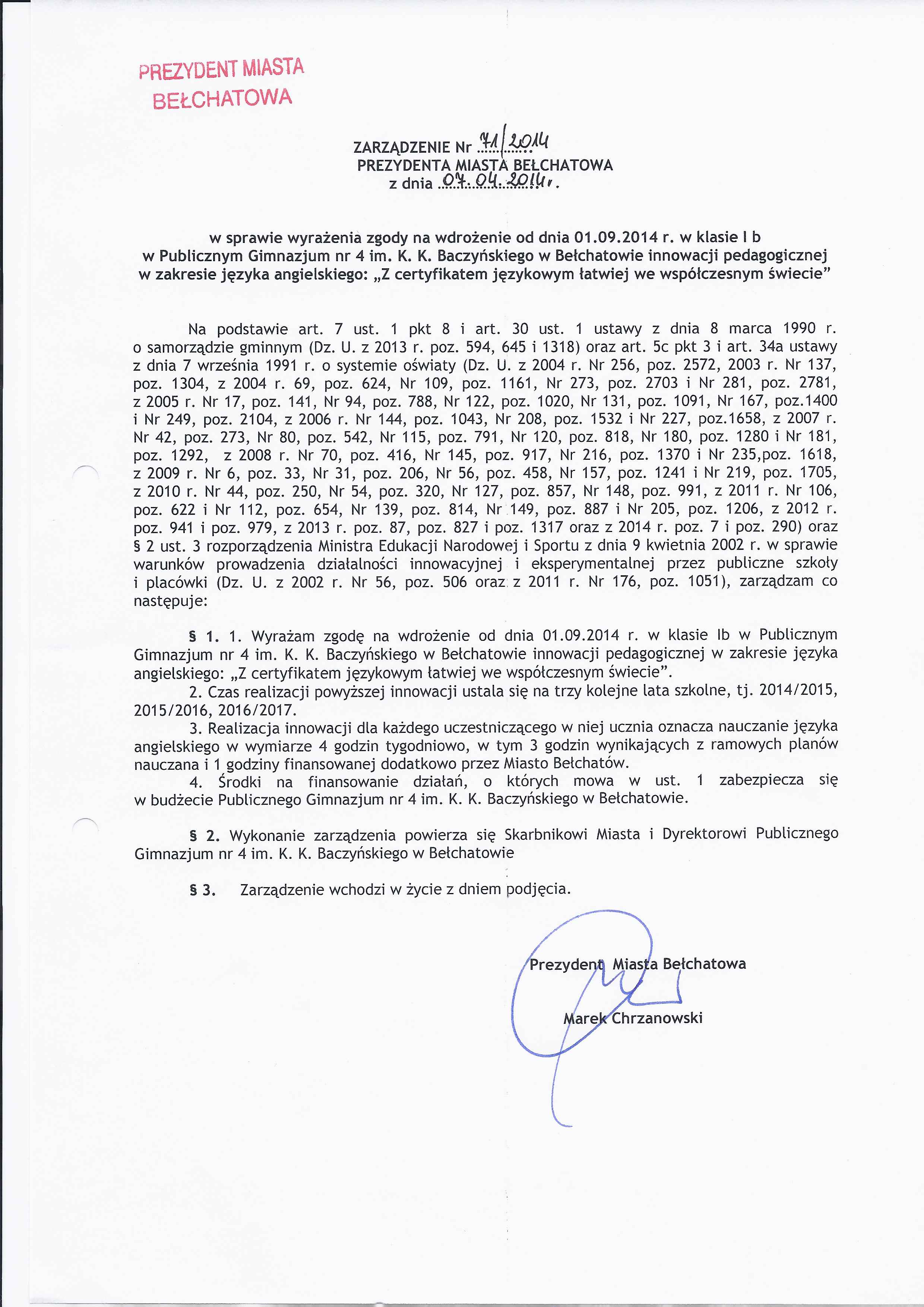 Zarządzenie Nr 71 z dnia 7 kwietnia 2014 r. w/s wyrażenia zgody na wdrożenie od dnia 01.09.2014 r. w klasie I b w Publicznym Gimnazjum nr 4 im. K.K. Baczyńskiego w Bełchatowie innowacji pedagogicznej w zakresie języka angielskiego: "Z certyfikatem językowym łatwiej we współczesnym świecie"
