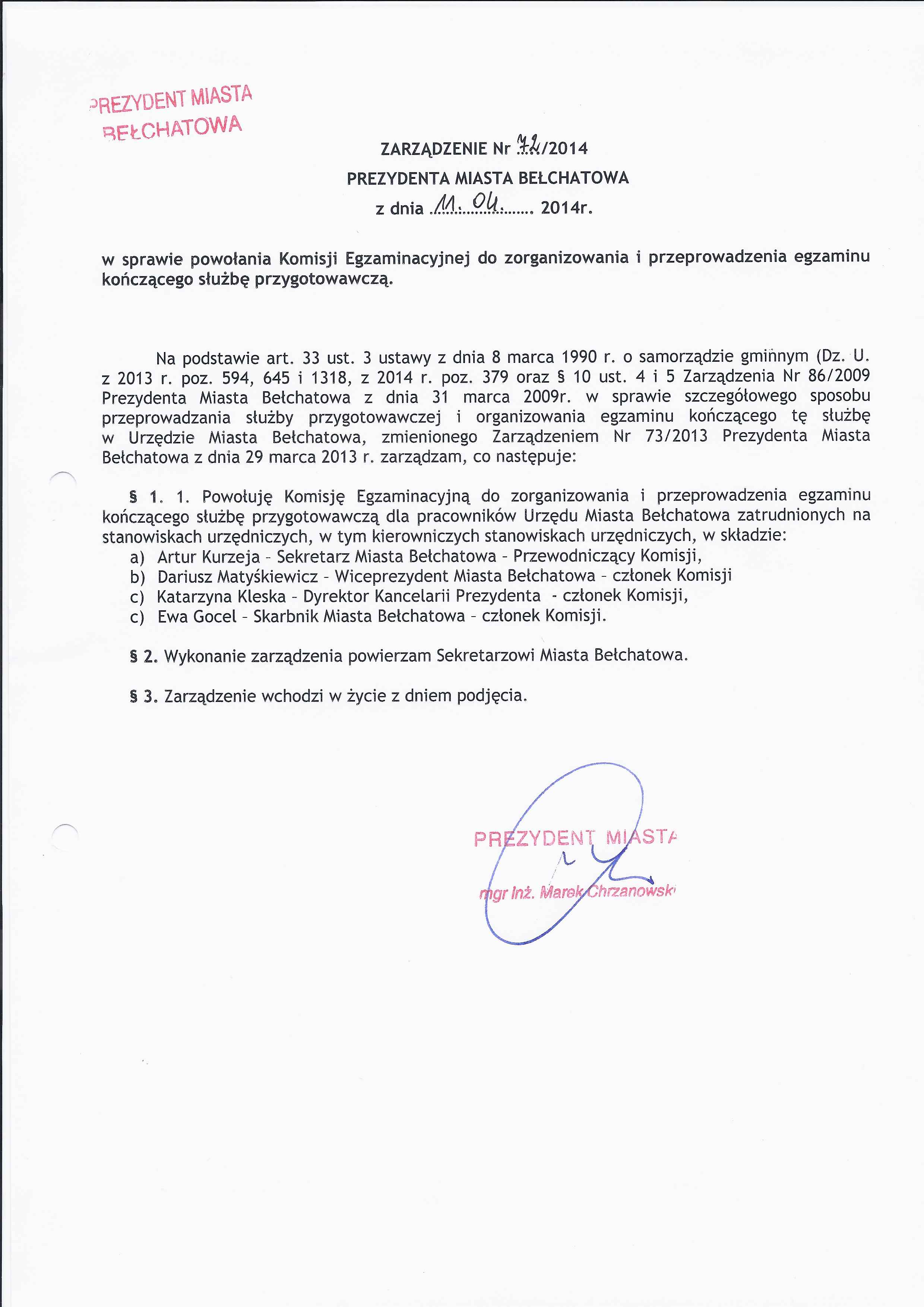 Zarządzenie Nr 72 z dnia 11 kwietnia 2014 r. w/s powołania Komisji Egzaminacyjnej do zorganizowania i przeprowadzenia egzaminu kończącego służbę przygotowawczą