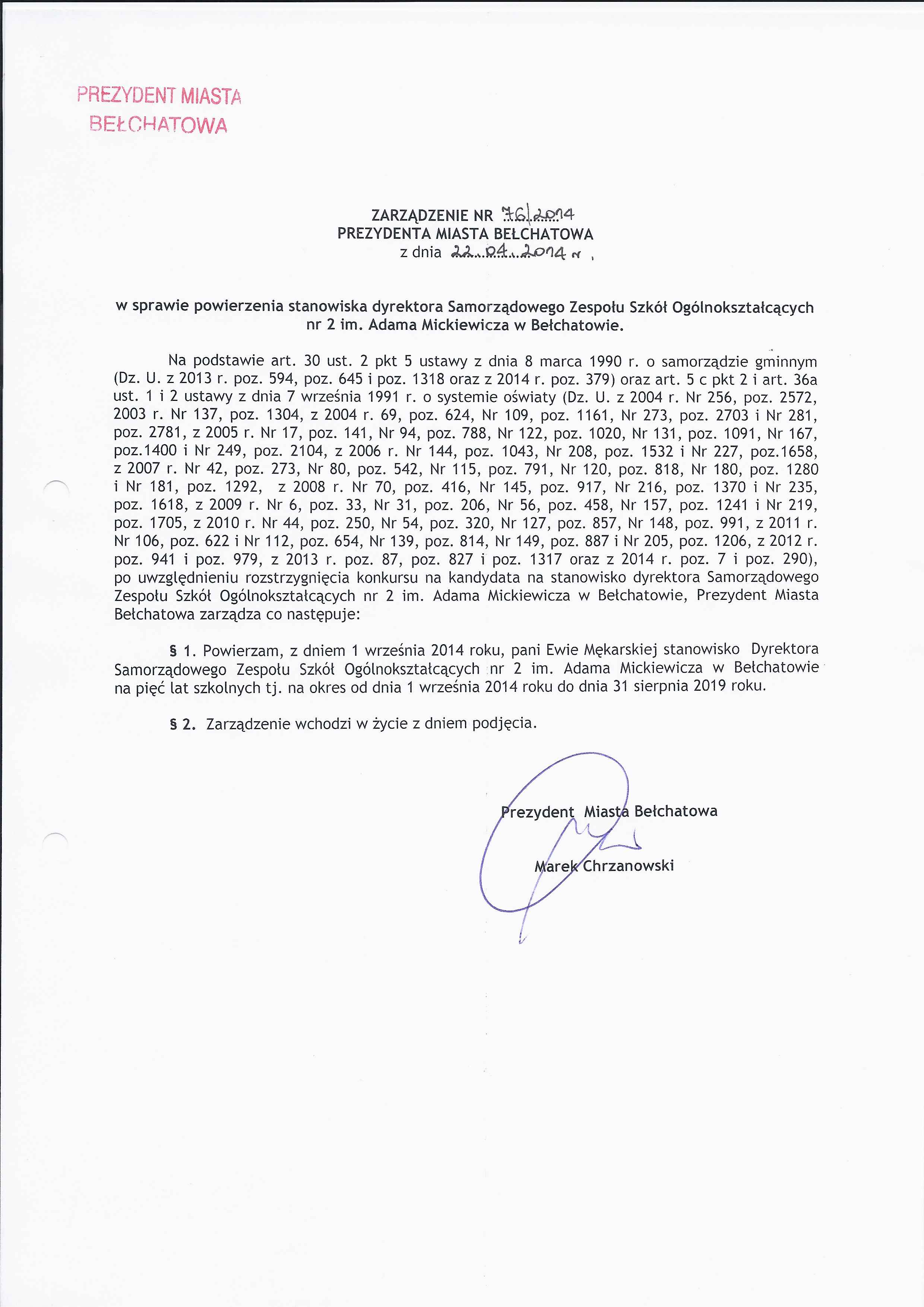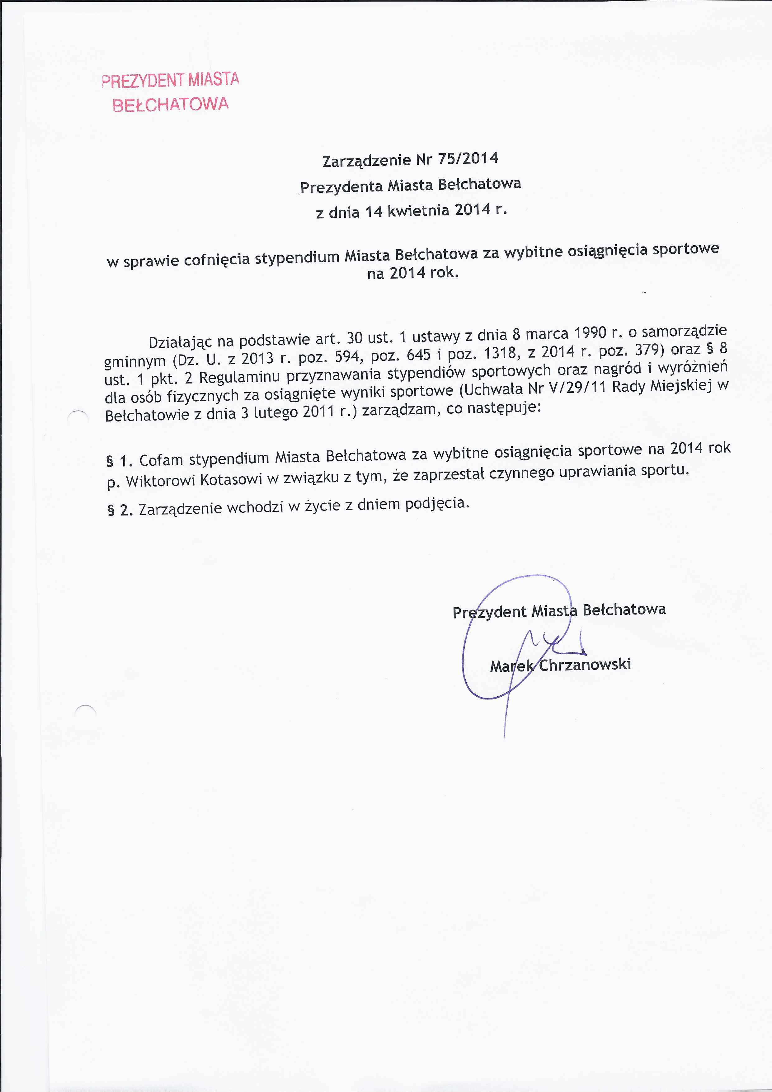 Zarządzenie Nr 75 z dnia 14 kwietnia 2014 r. w/s cofnięcia stypendium Miasta Bełchatowa za wybitne osiągnięcia sportowe na 2014 rok