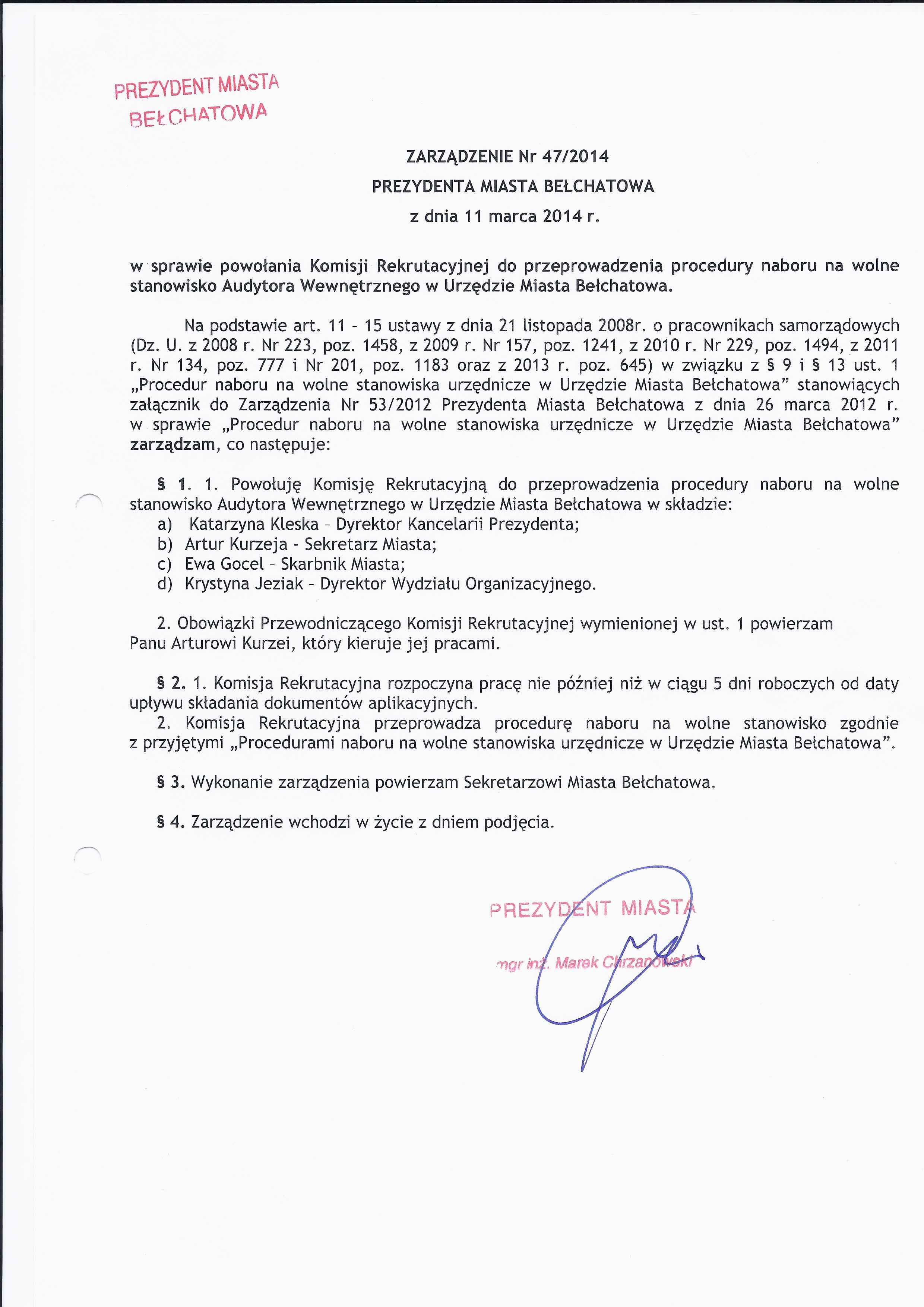 Zarządzenie Nr 47 z dnia 11 marca 2014 r. w/s powołania Komisji Rekrutacyjnej do przeprowadzenia procedury naboru na wolne stanowisko Audytora Wewnętrznego w Urzędzie Miasta Bełchatowa