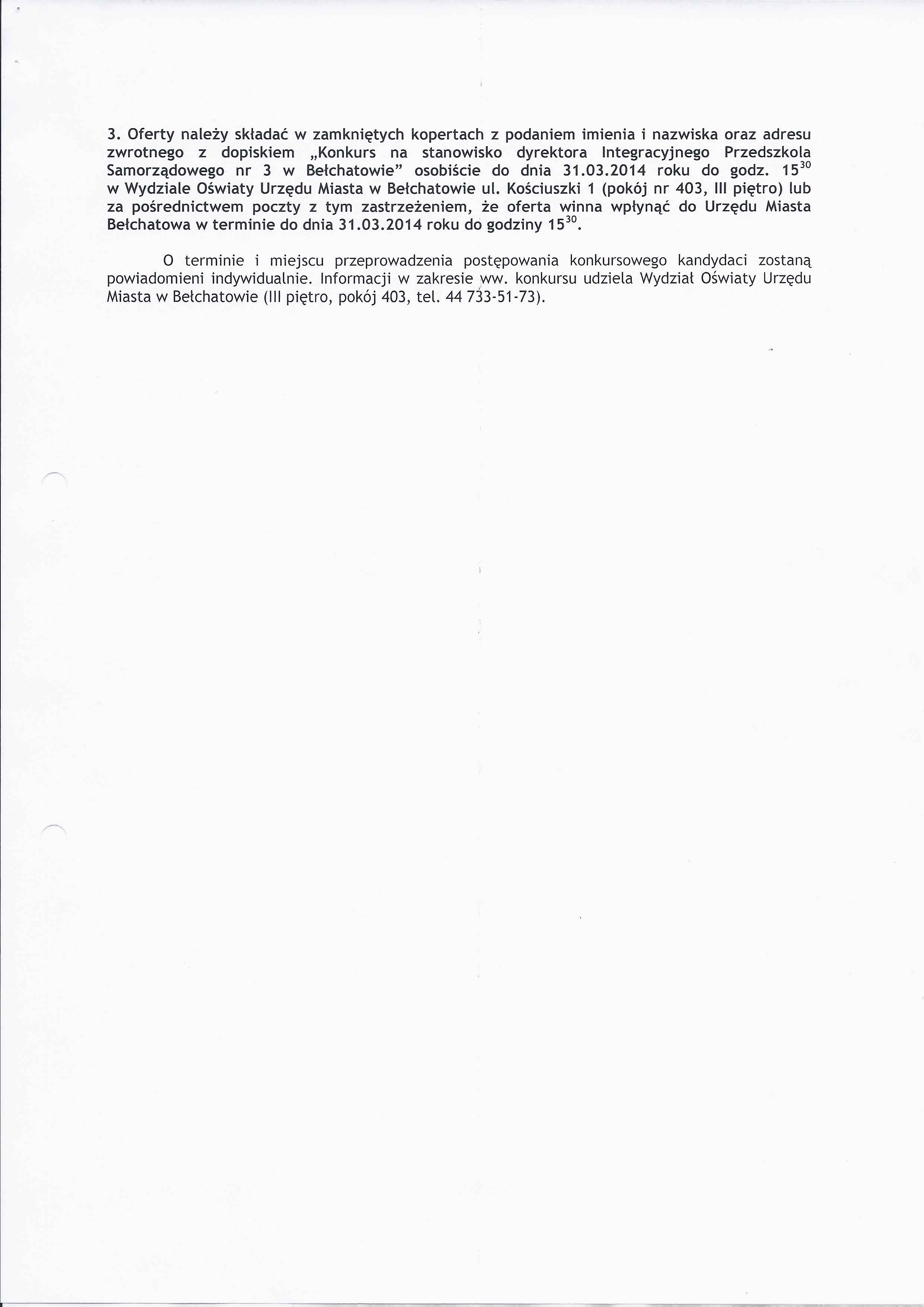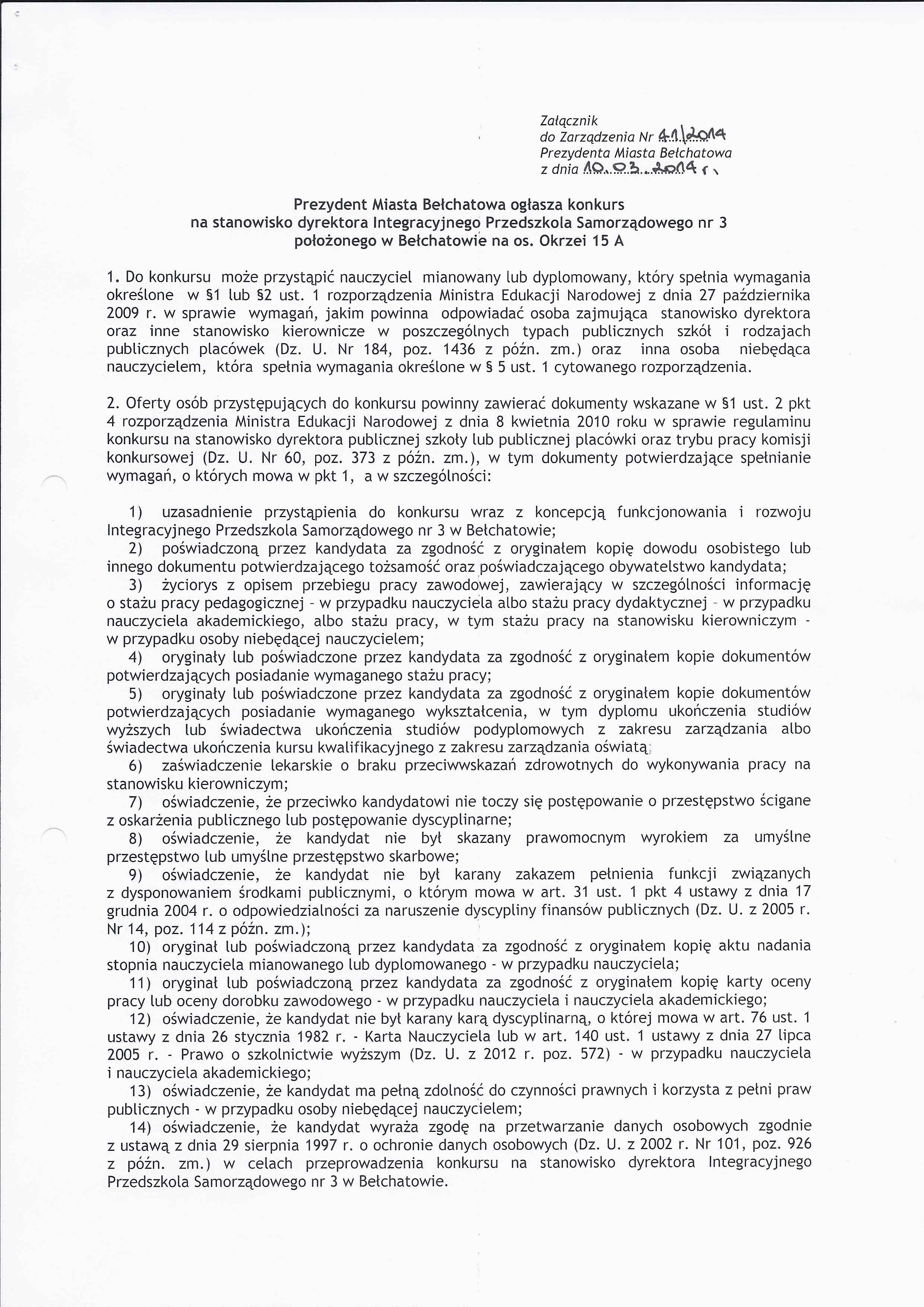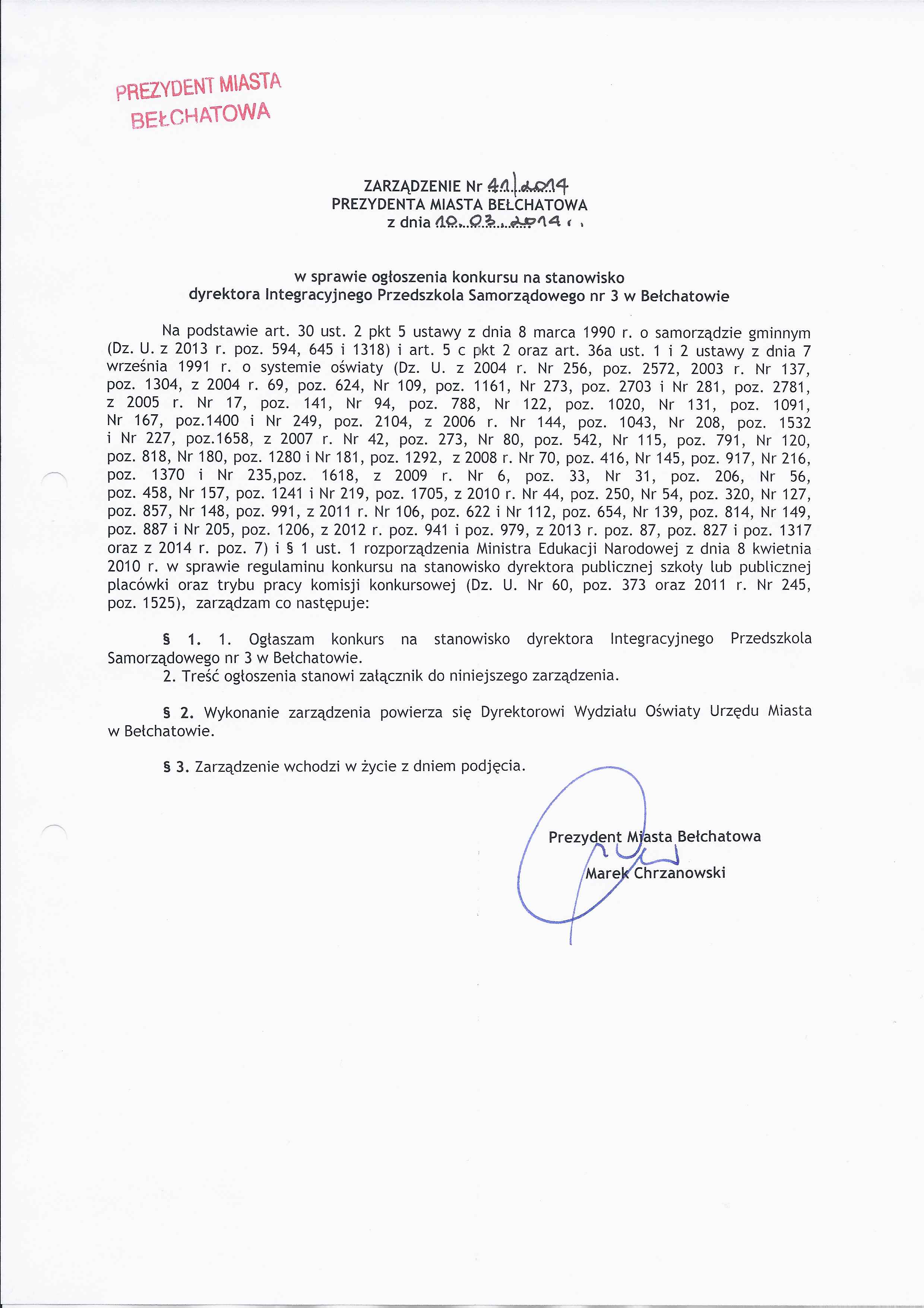 Zarządzenie Nr 41 z dnia 10 marca 2014 r. w/s ogłoszenia konkursu na stanowisko dyrektora Integracyjnego Przedszkola Samorządowego nr 3 w Bełchatowie