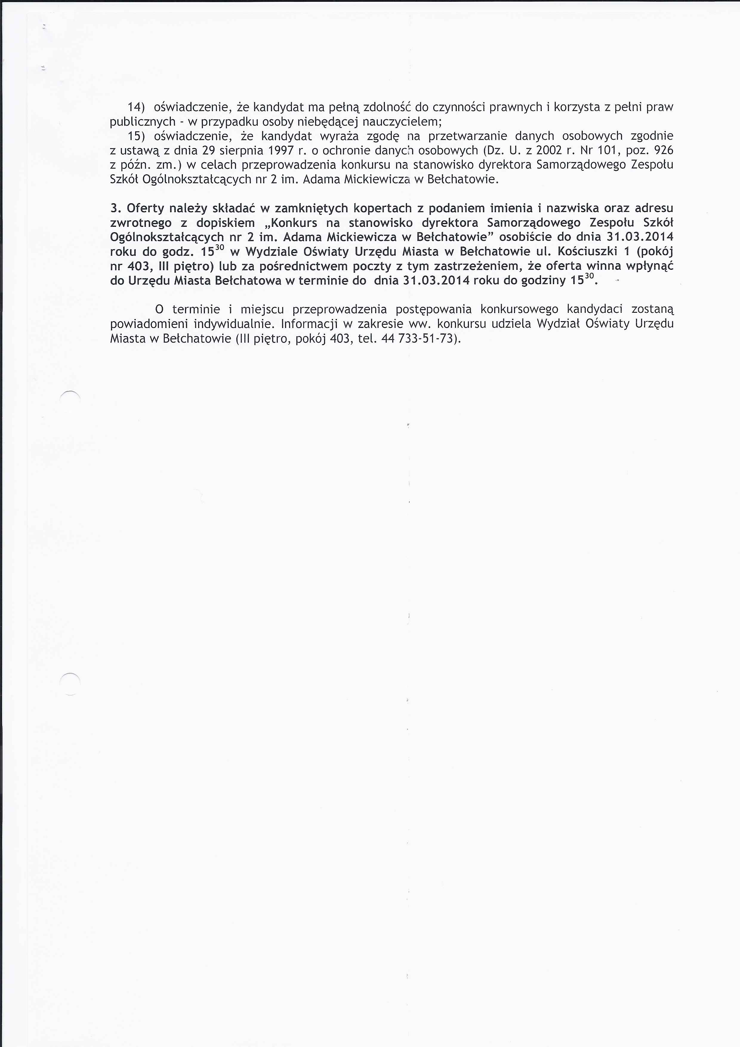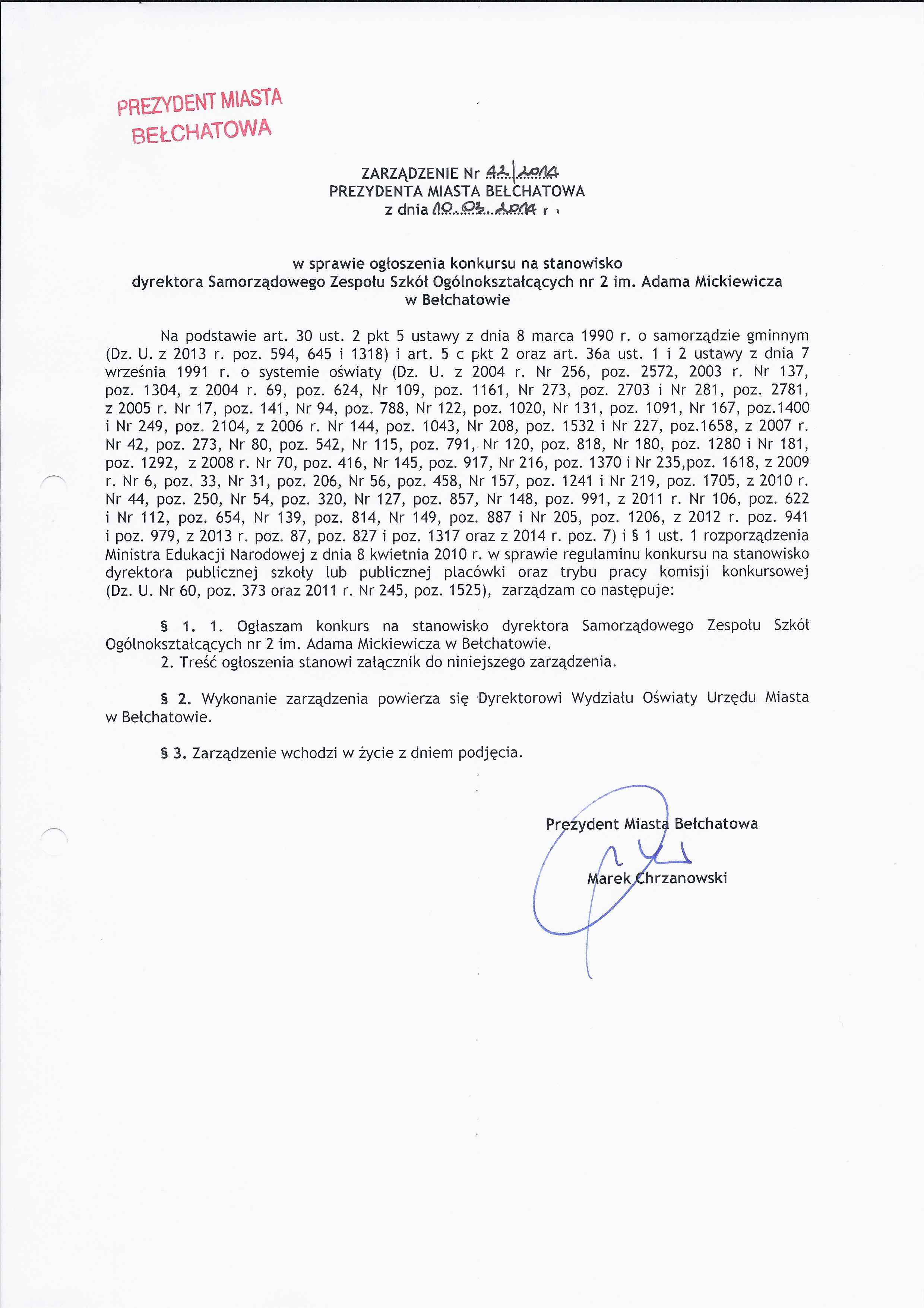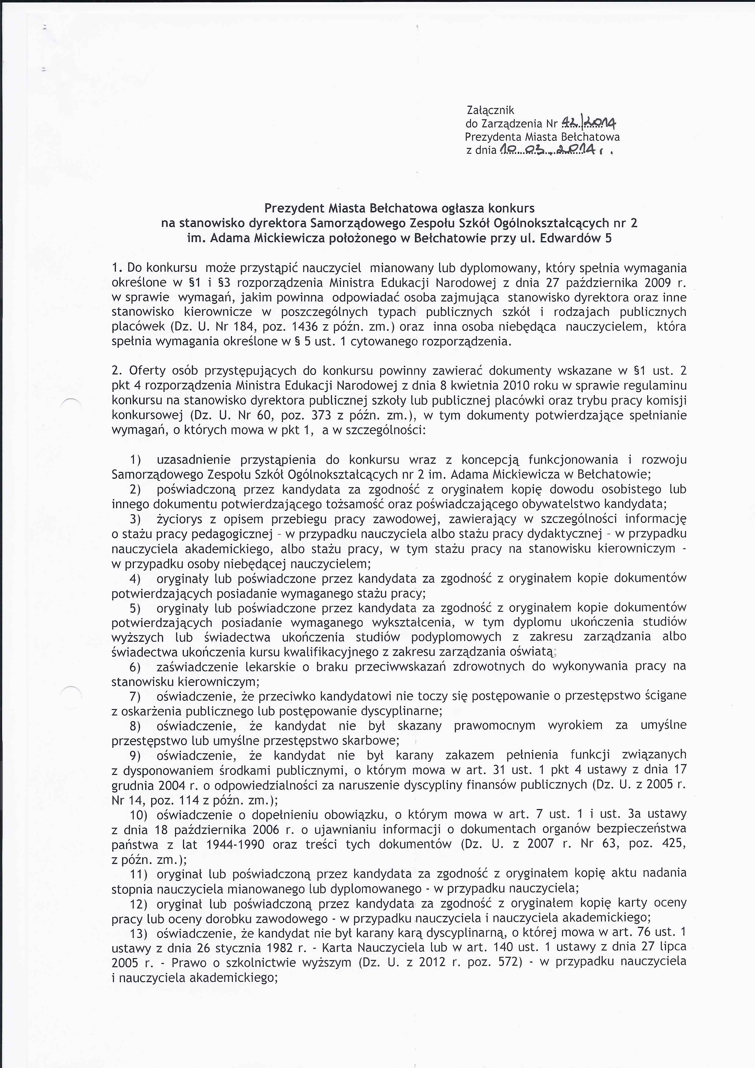 Zarządzenie Nr 42 z dnia 10 marca 2014 r. w/s ogłoszenia konkursu na stanowisko dyrektora Samorządowego Zespołu Szkół Ogólnokształcących nr 2 im. Adama Mickiewicza w Bełchatowie