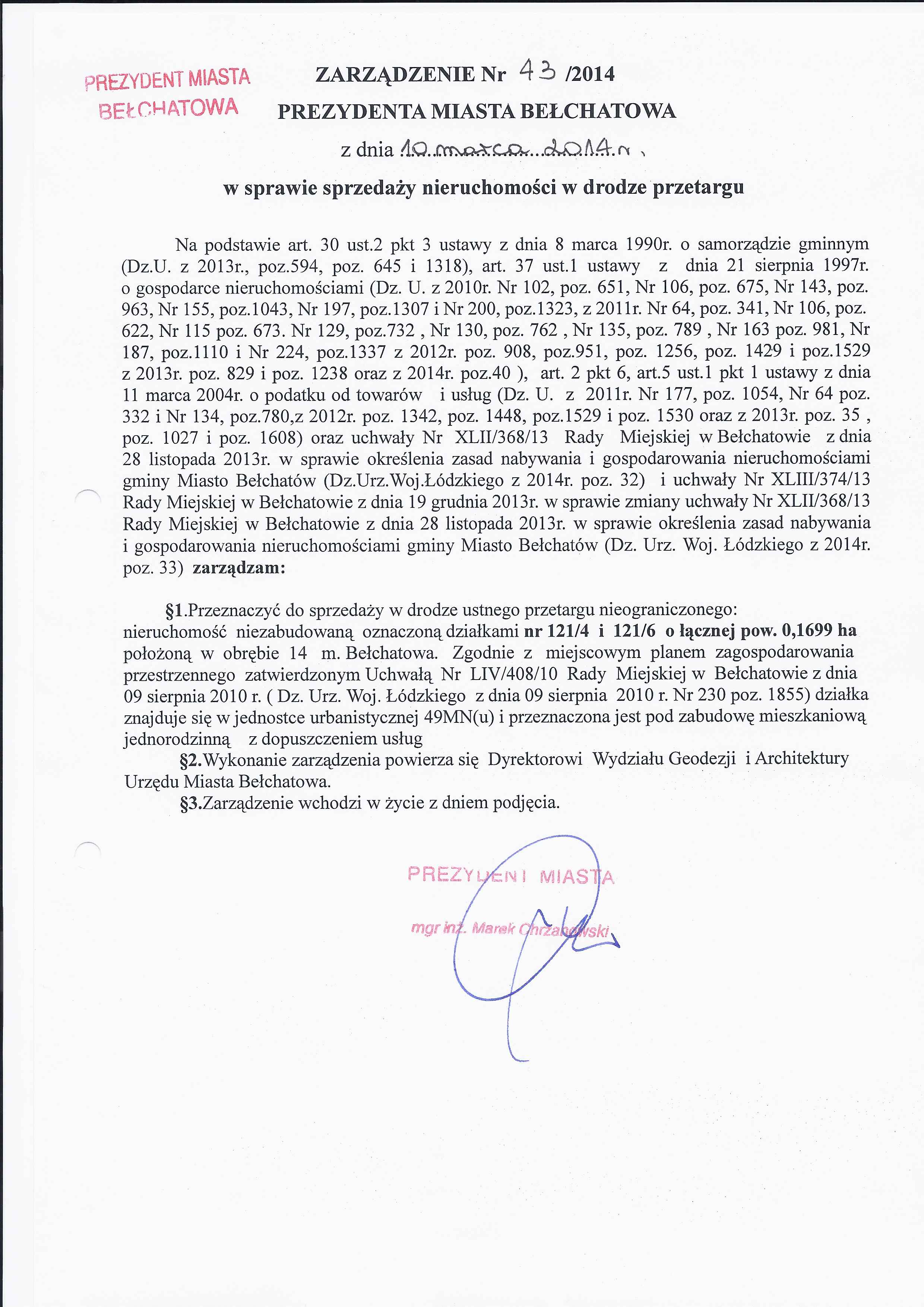 Zarządzenie Nr 43 z dnia 10 marca 2014 r. w/s sprzedaży nieruchomości w drodze przetargu