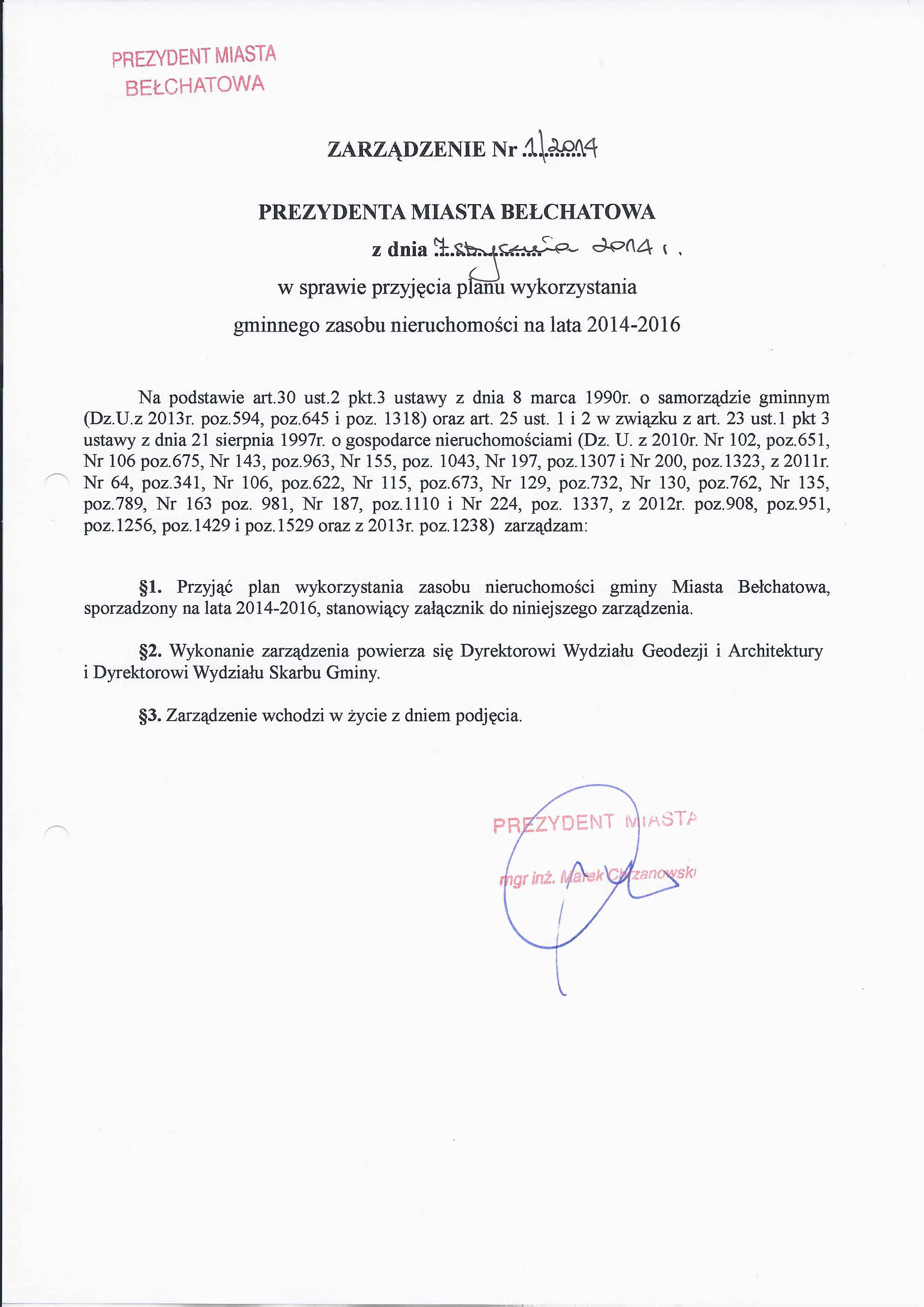 Zarządzenie Nr 1 z dnia 7 stycznia 2014 r. w/s przyjęcia planu wykorzystania gminnego zasobu nieruchomości na lata 2014-2016
