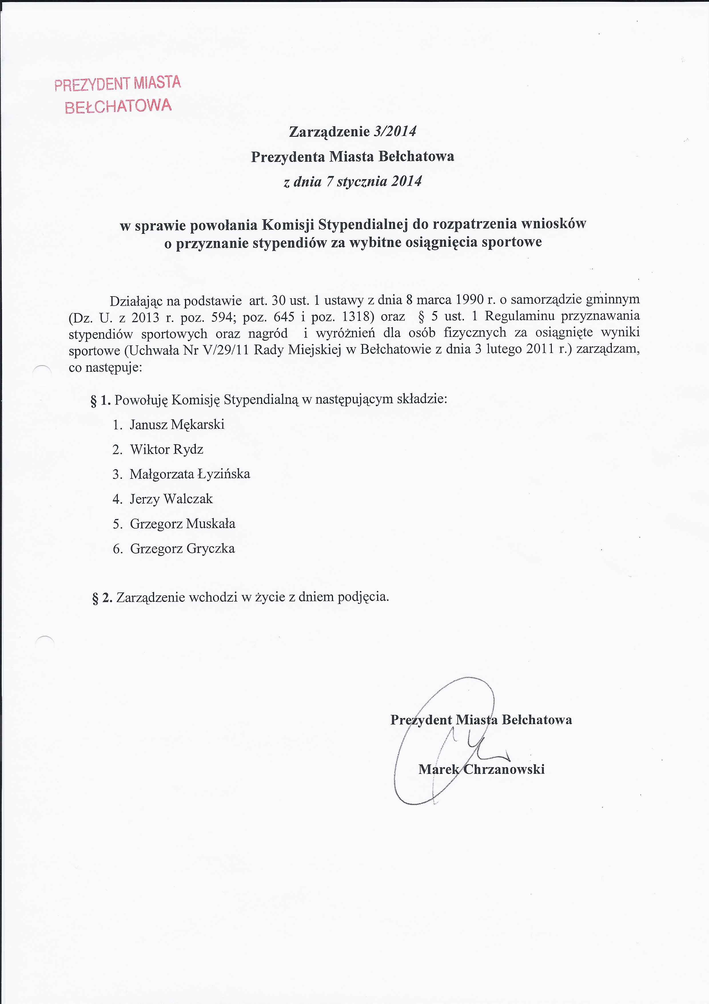 Zarządzenie Nr 2 z dnia 7 stycznia 2014 r. w/s powołania Komisji Stypendialnej do rozpatrzenia wniosków o przyznanie Stypendiów Artystycznych Miasta Bełchatowa