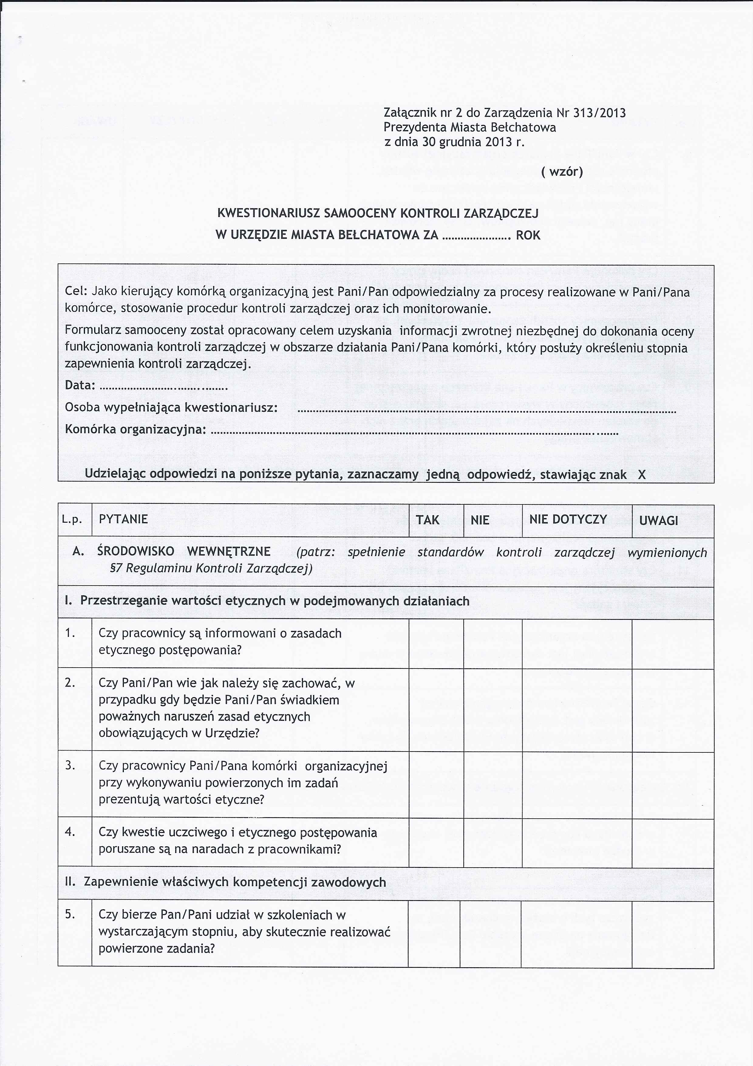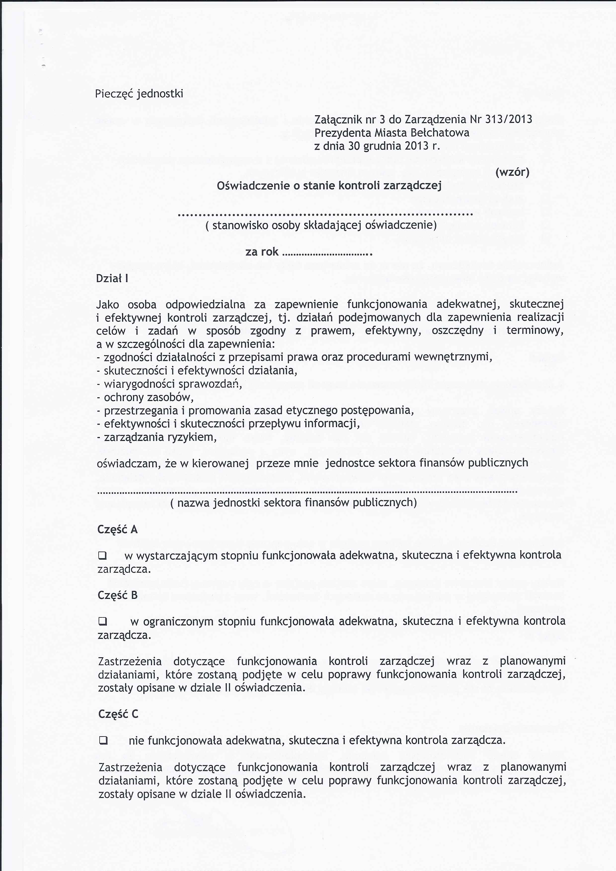 Zarządzenie Nr 313 z dnia 30 grudnia 2013 r. w/s wprowadzenia Regulaminu Kontroli Zarządczej w Mieście Bełchatów