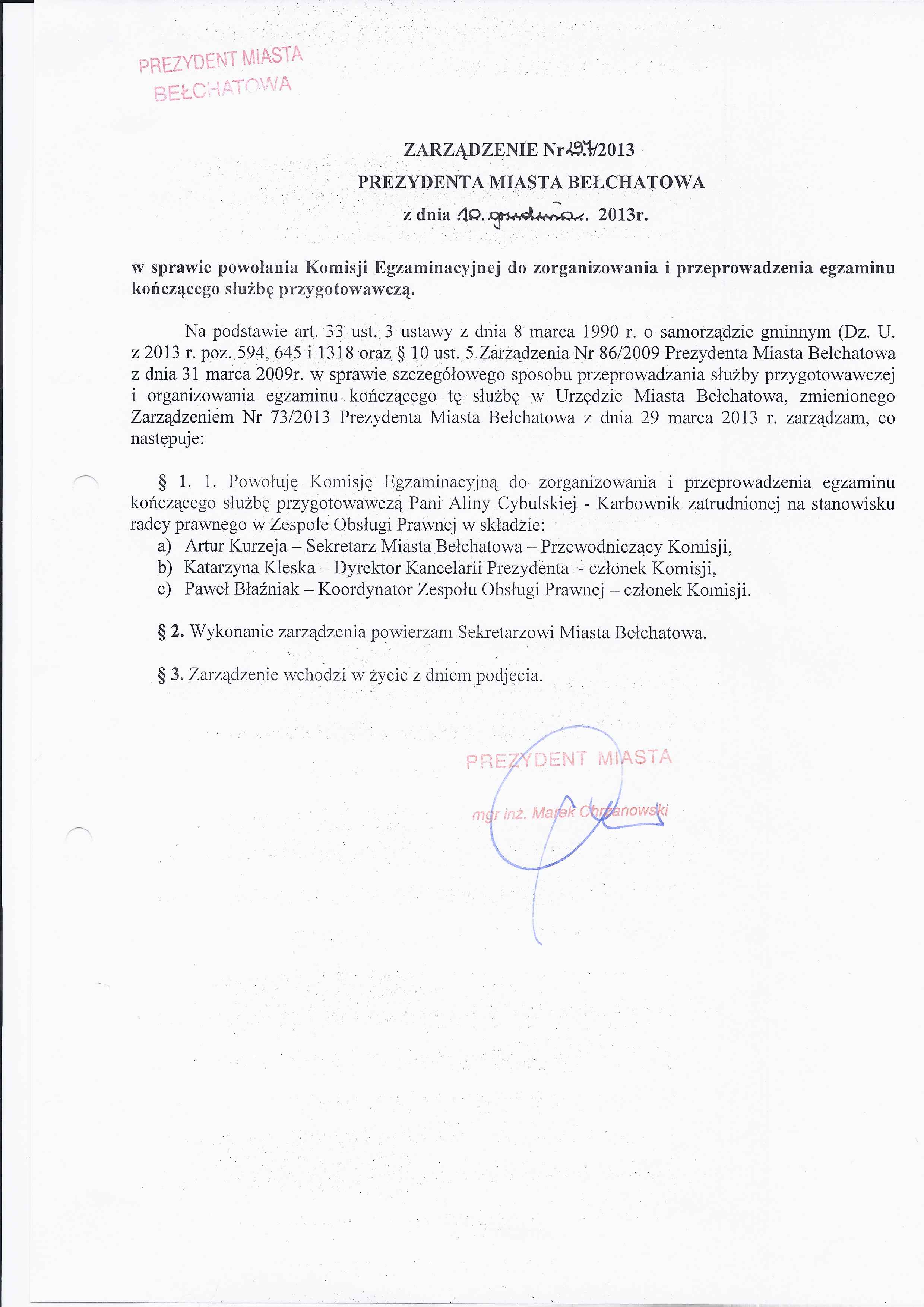 Zarządzenie Nr 297 z dnia 10 grudnia 2013 r. w/s powołania Komisji Egzaminacyjnej do zorganizowania i przeprowadzenia egzaminu kończącego służbę przygotowawczą