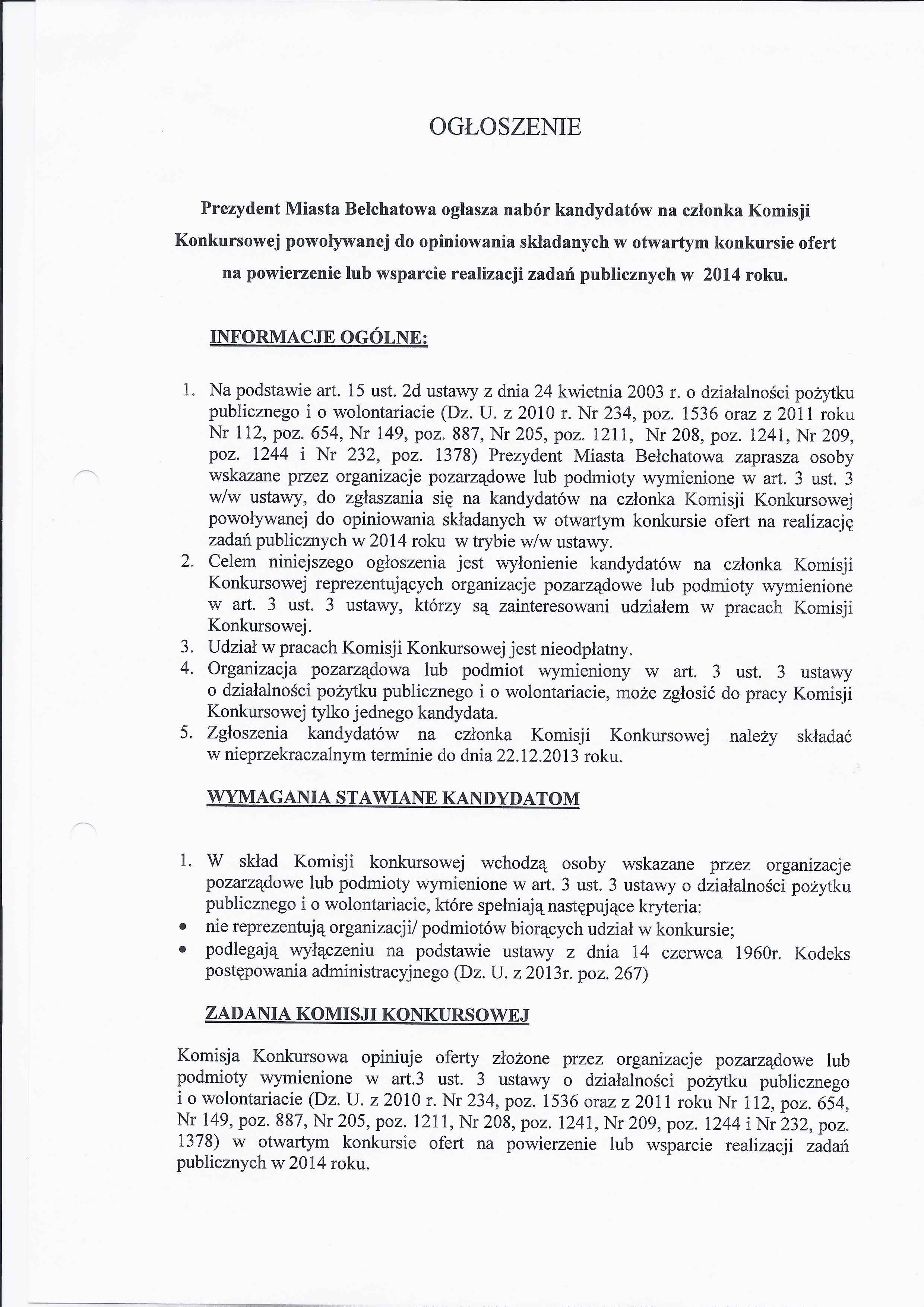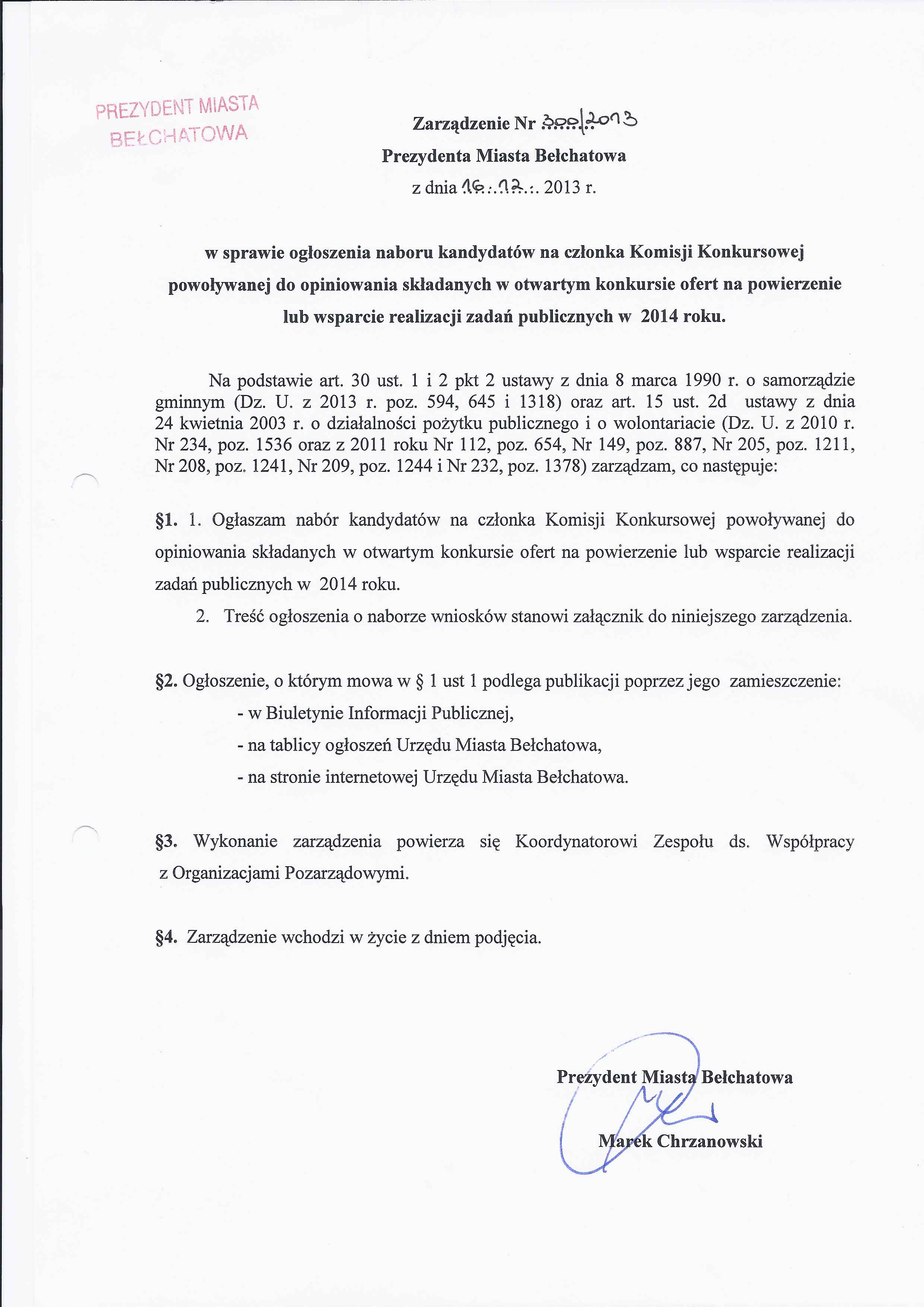 Zarządzenie Nr 300 z dnia 16 grudnia 2013 r. w/s ogłoszenia naboru kandydatów na członka Komisji Konkursowej powołanej do opiniowania składanych w otwartym konkursie ofert na powierzenie lub realizację zadań publicznych w 2014