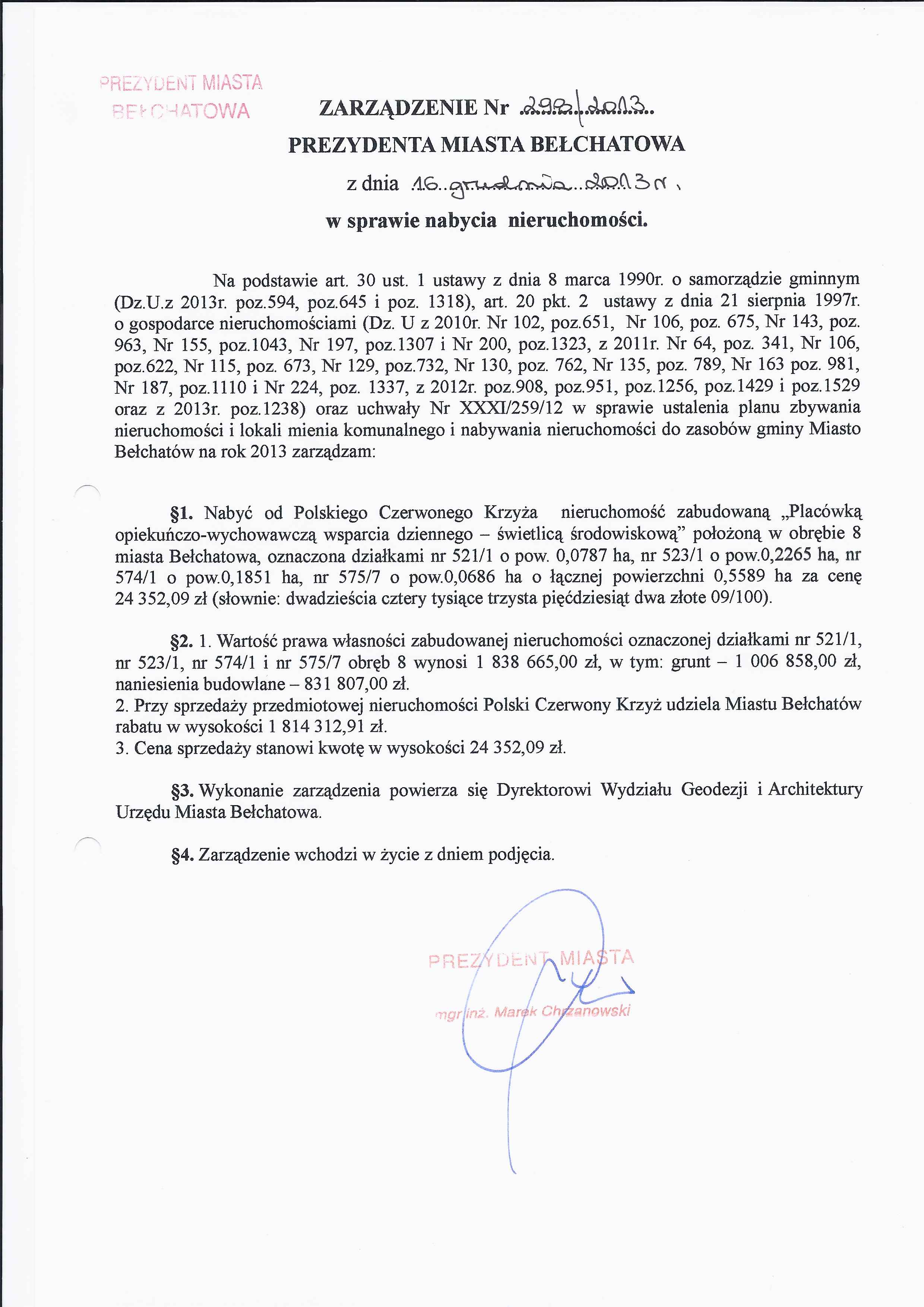 Zarządzenie Nr 298 z dnia 16 grudnia 2013 r. w/s nabycia nieruchomości
