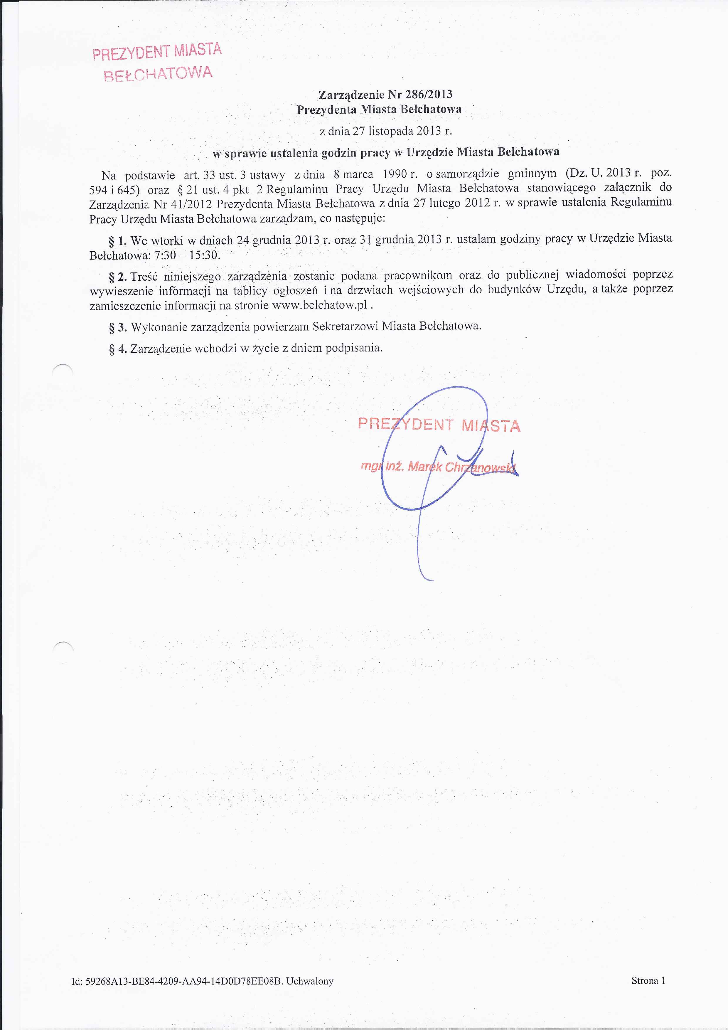 Zarządzenie Nr 286 z dnia 27 listopada 2013 r. w/s ustalenia godzin pracy w Urzędzie Miasta Bełchatowa