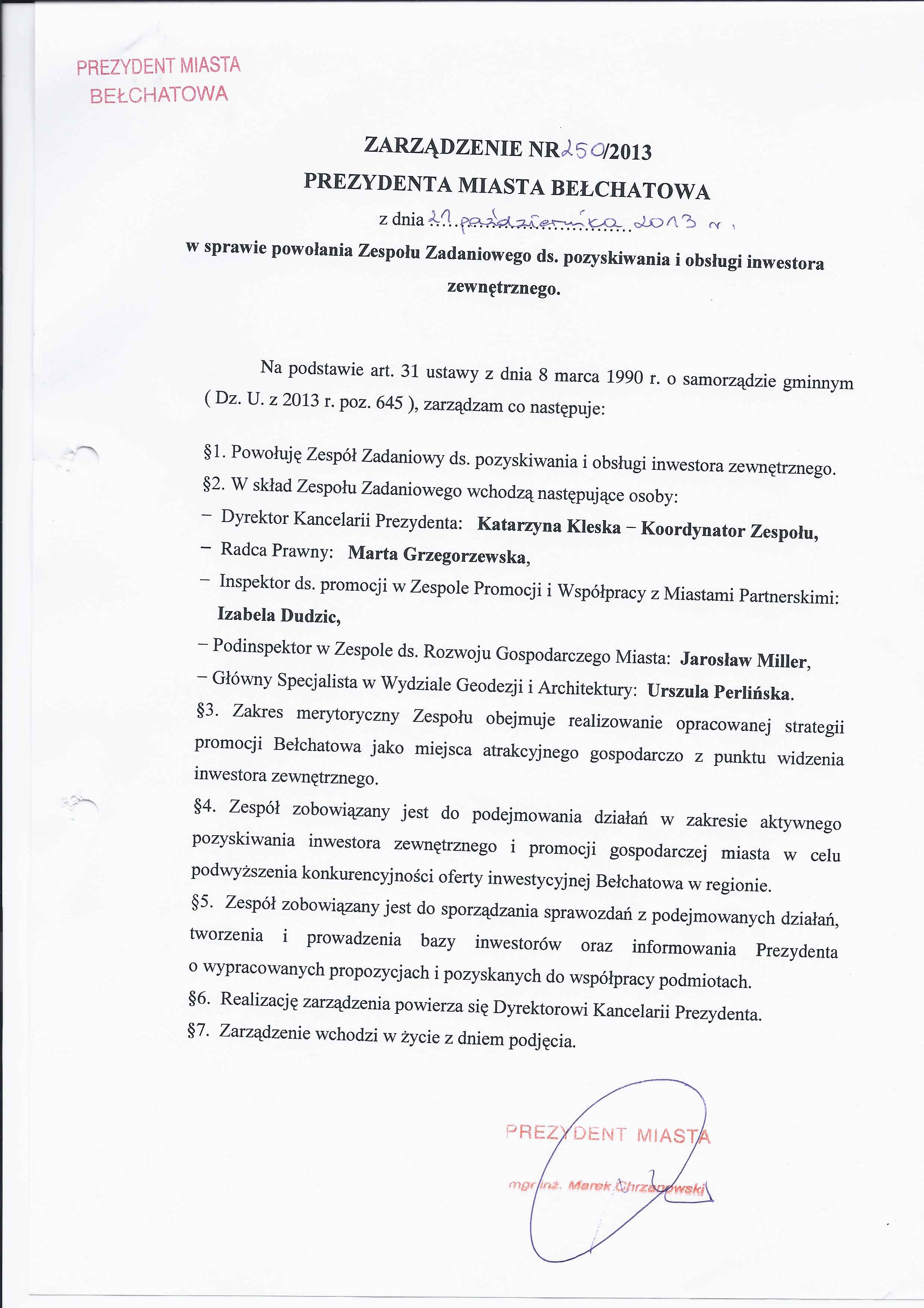 Zarządzenie Nr 250 z dnia 21 października 2013 r. w/s powołania Zespołu Zadaniowego ds. pozyskiwania i obsługi inwestora zewnętrznego