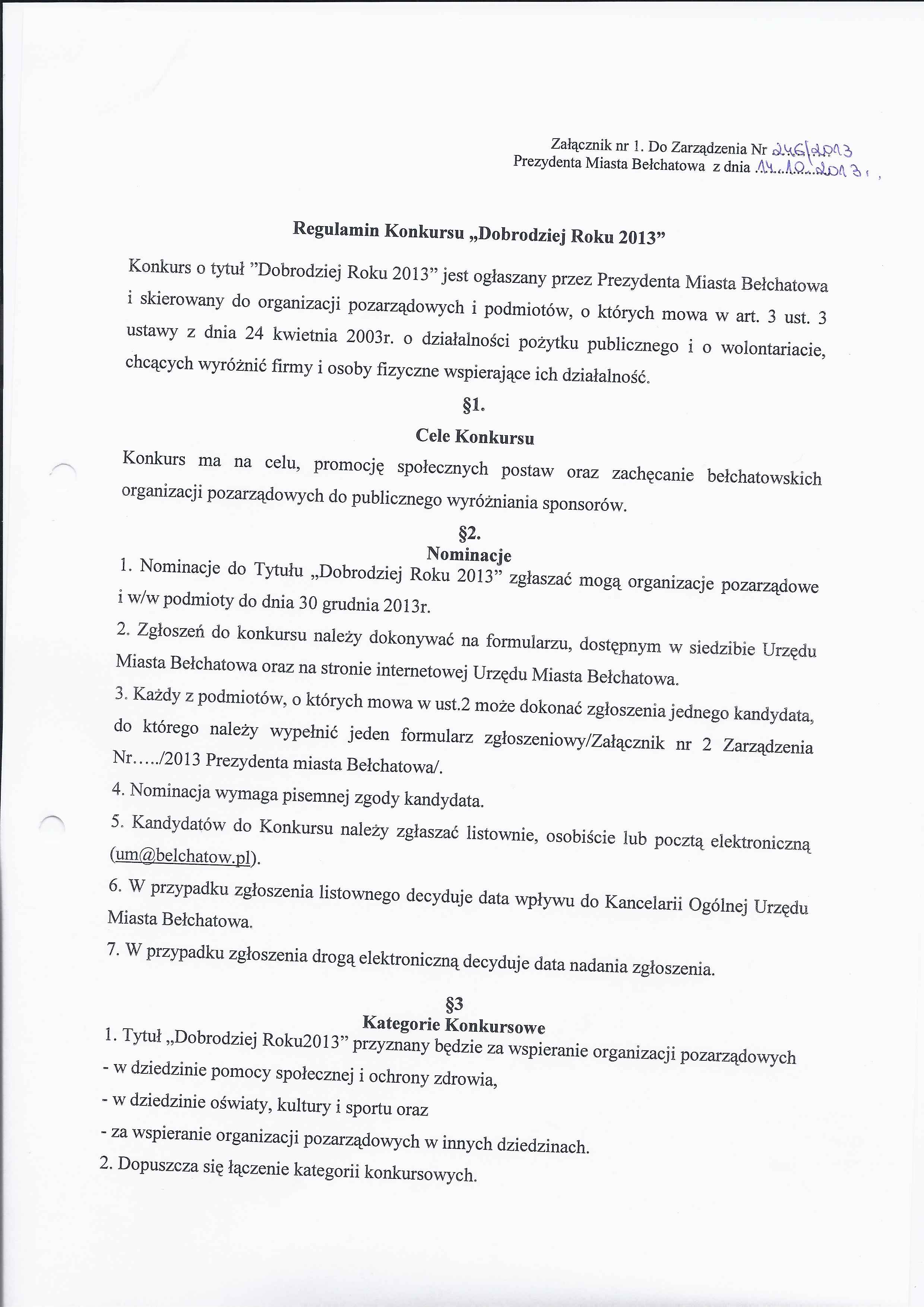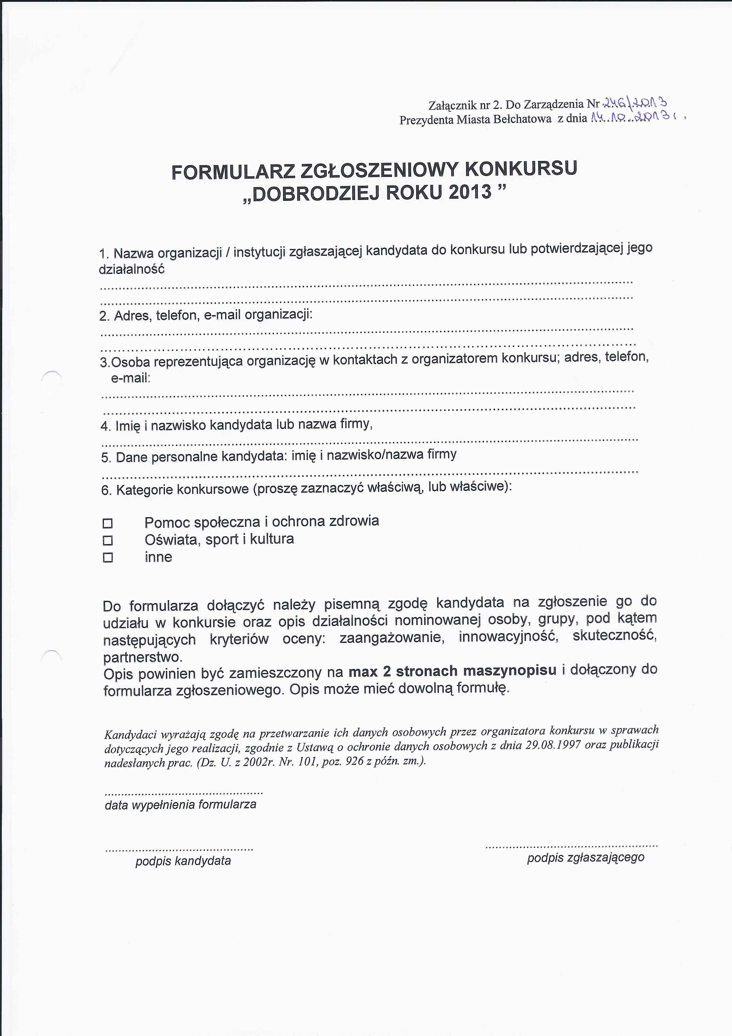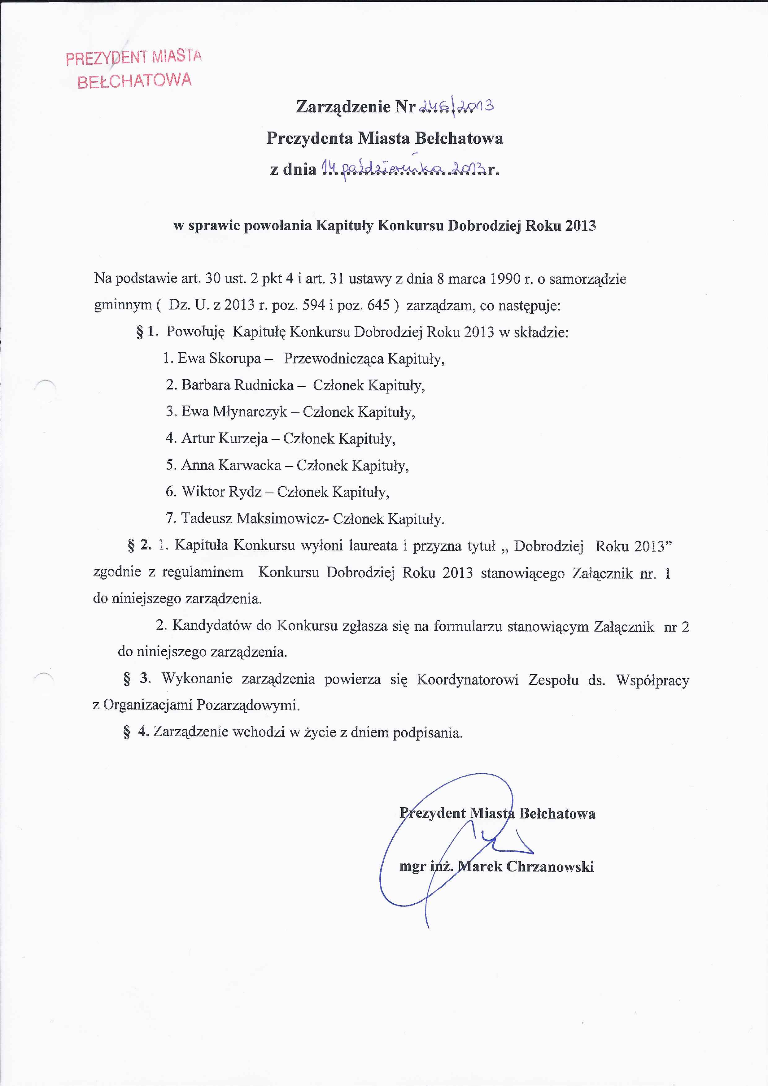 Zarządzenie Nr 246 z dnia 14 października 2013 r. w/s powołania Kapituły Konkursu Dobrodziej Roku 2013