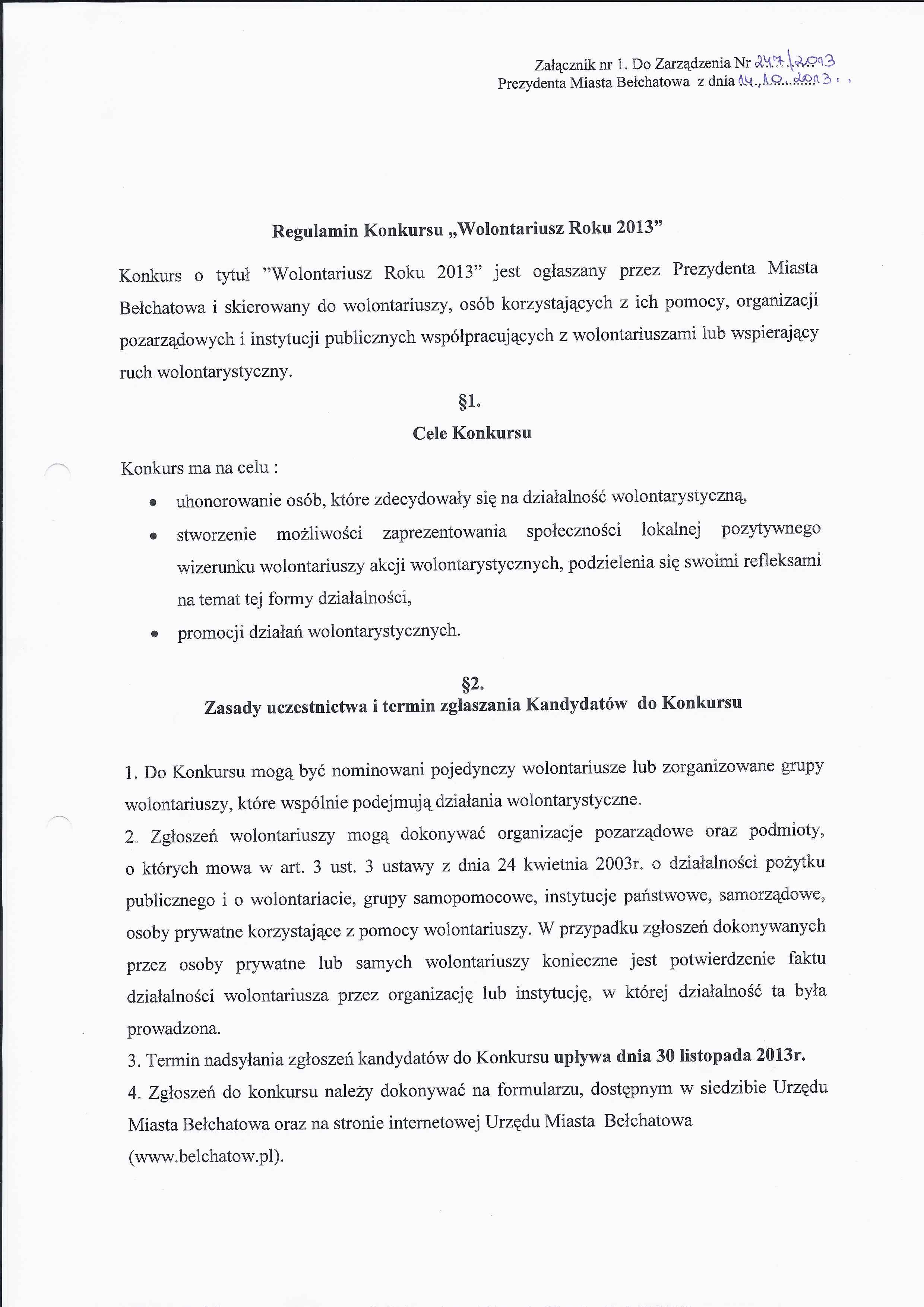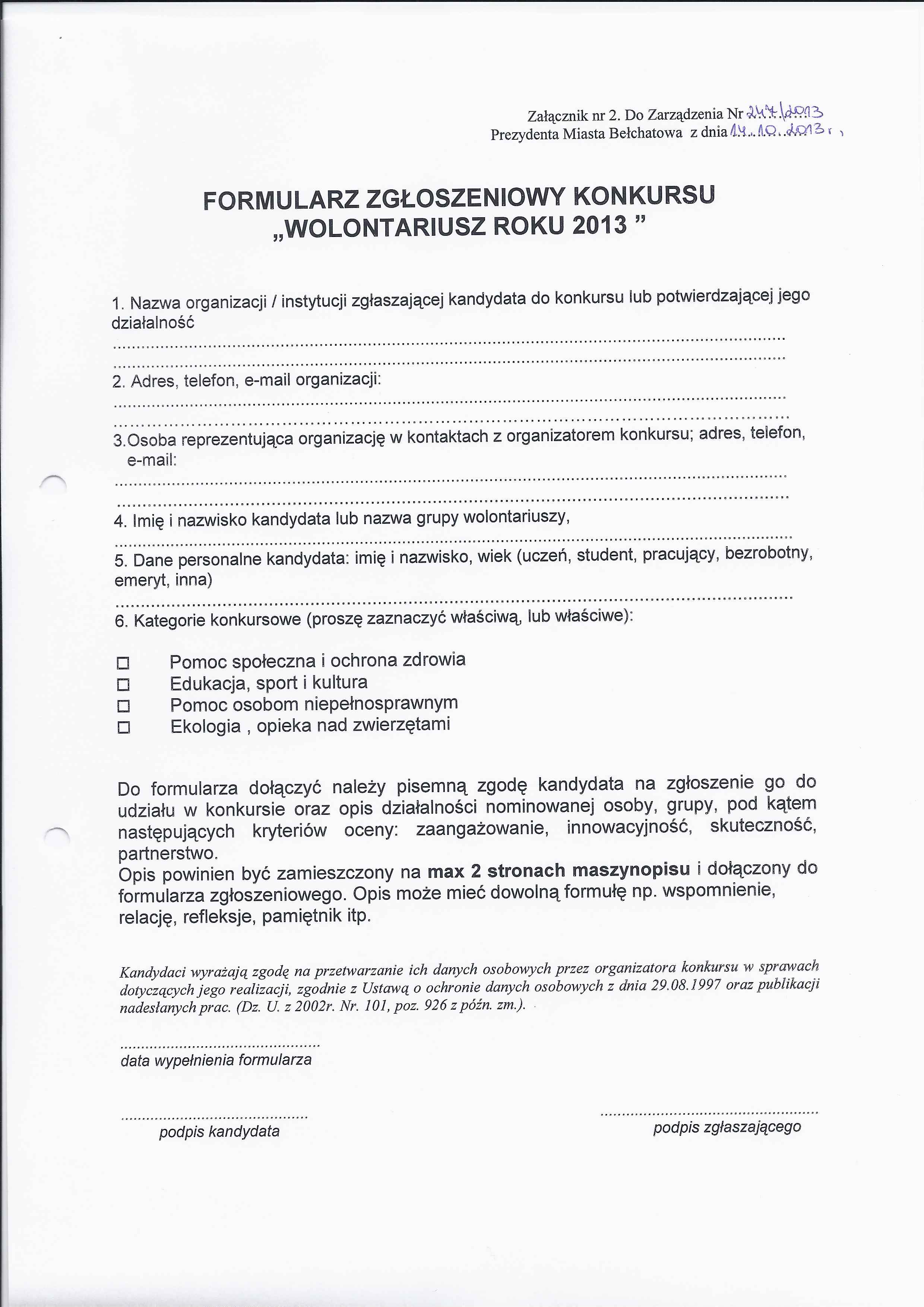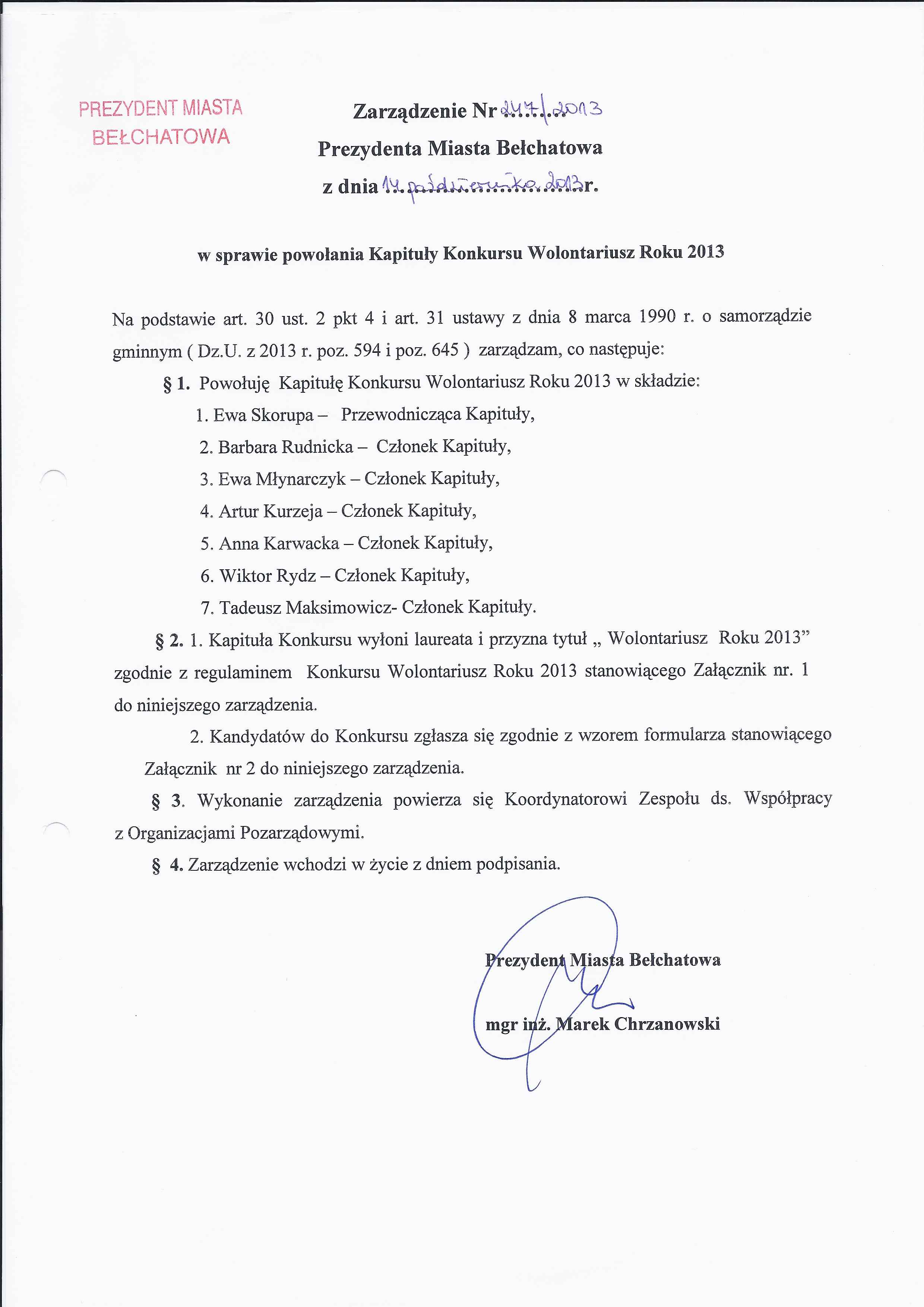 Zarządzenie Nr 247 z dnia 14 października 2013 r. w/s powołania Kapituły Konkursu Wolontariusz Roku 2013