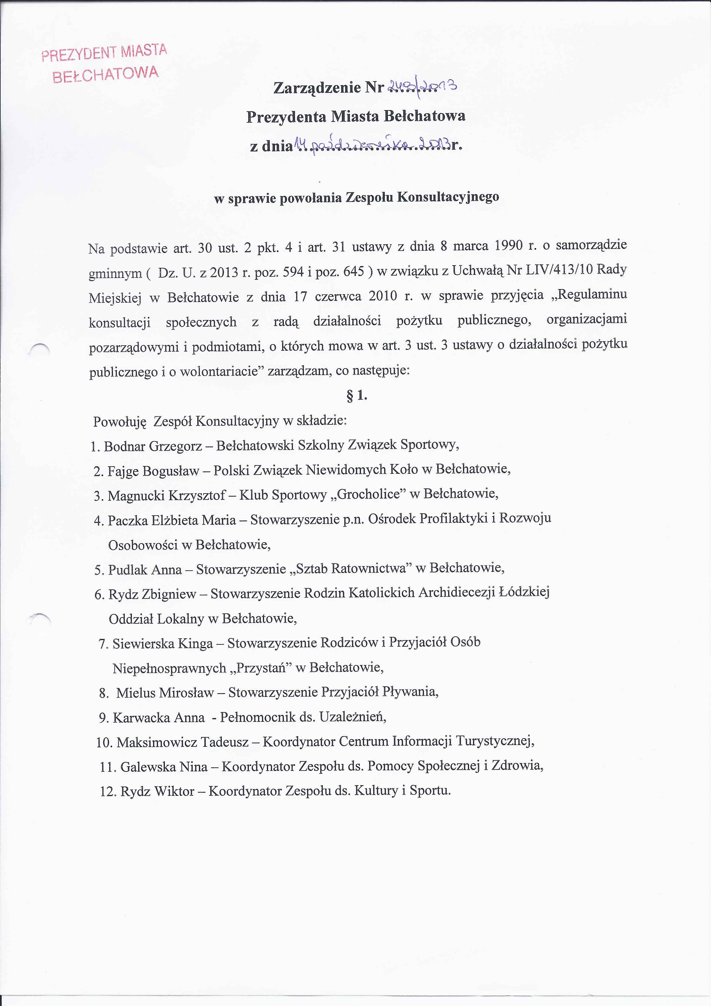 Zarządzenie Nr 248 z dnia 14 października 2013 r. w/s powołania Zespołu Konsultacyjnego