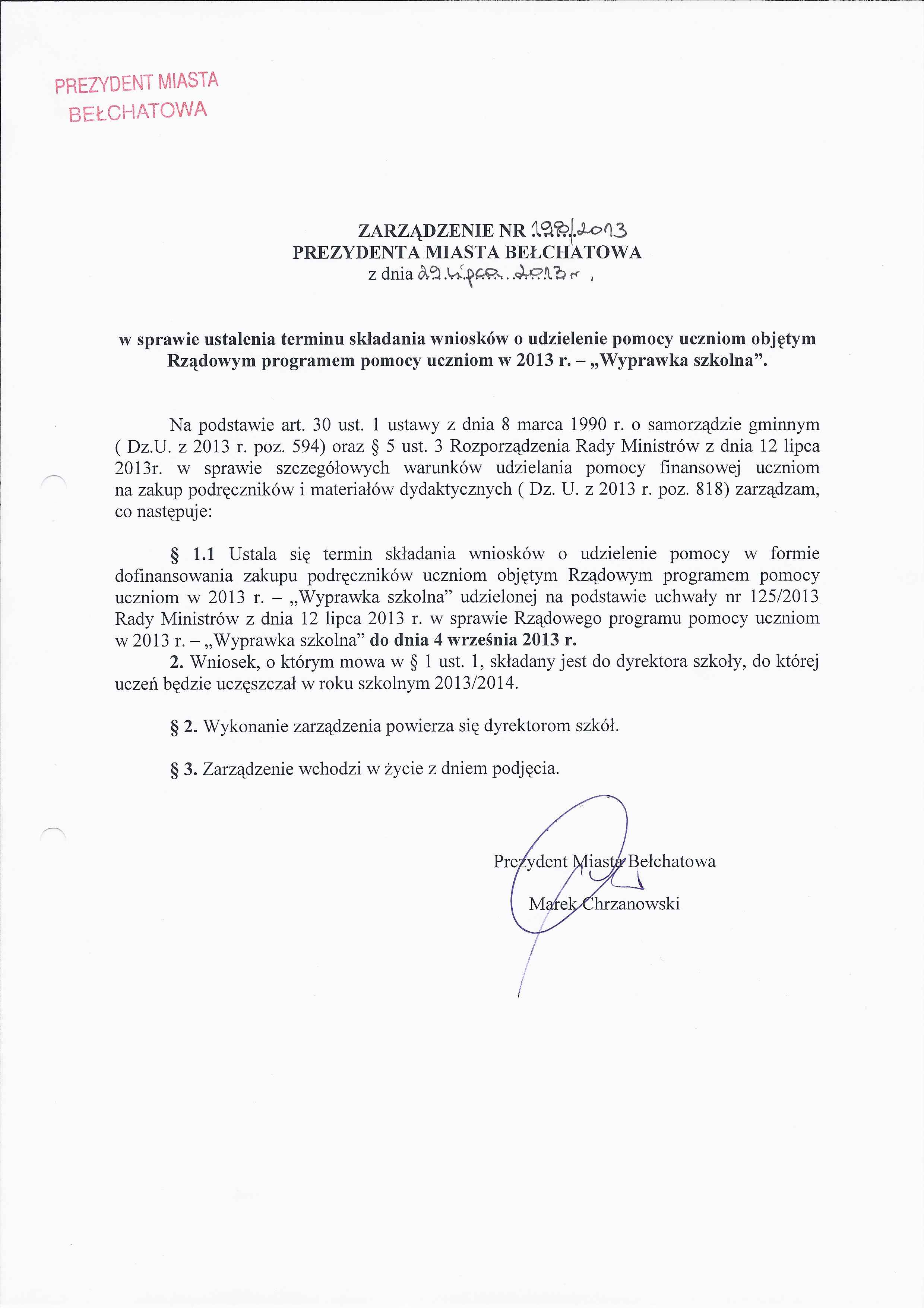 Zarządzenie Nr 198 z dnia 29 lipca 2013 r. w/s ustalenia terminu składania wniosków o udzielenie pomocy uczniom objętym Rzadowym programem pomocy uczniom w 2013 r. - "Wyprawka szkolna"