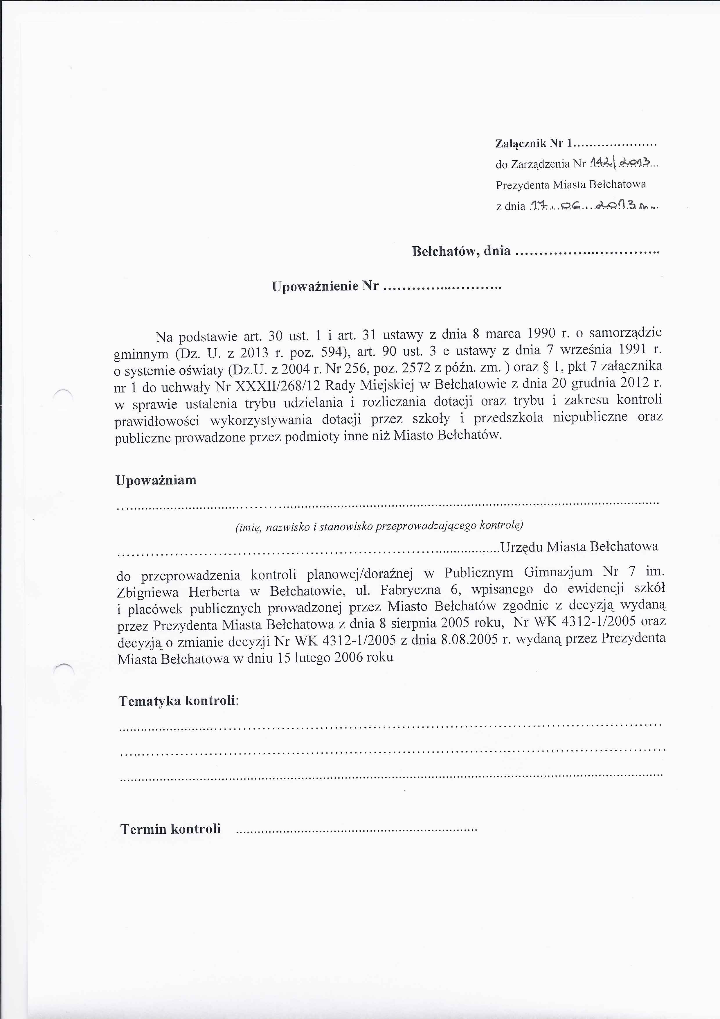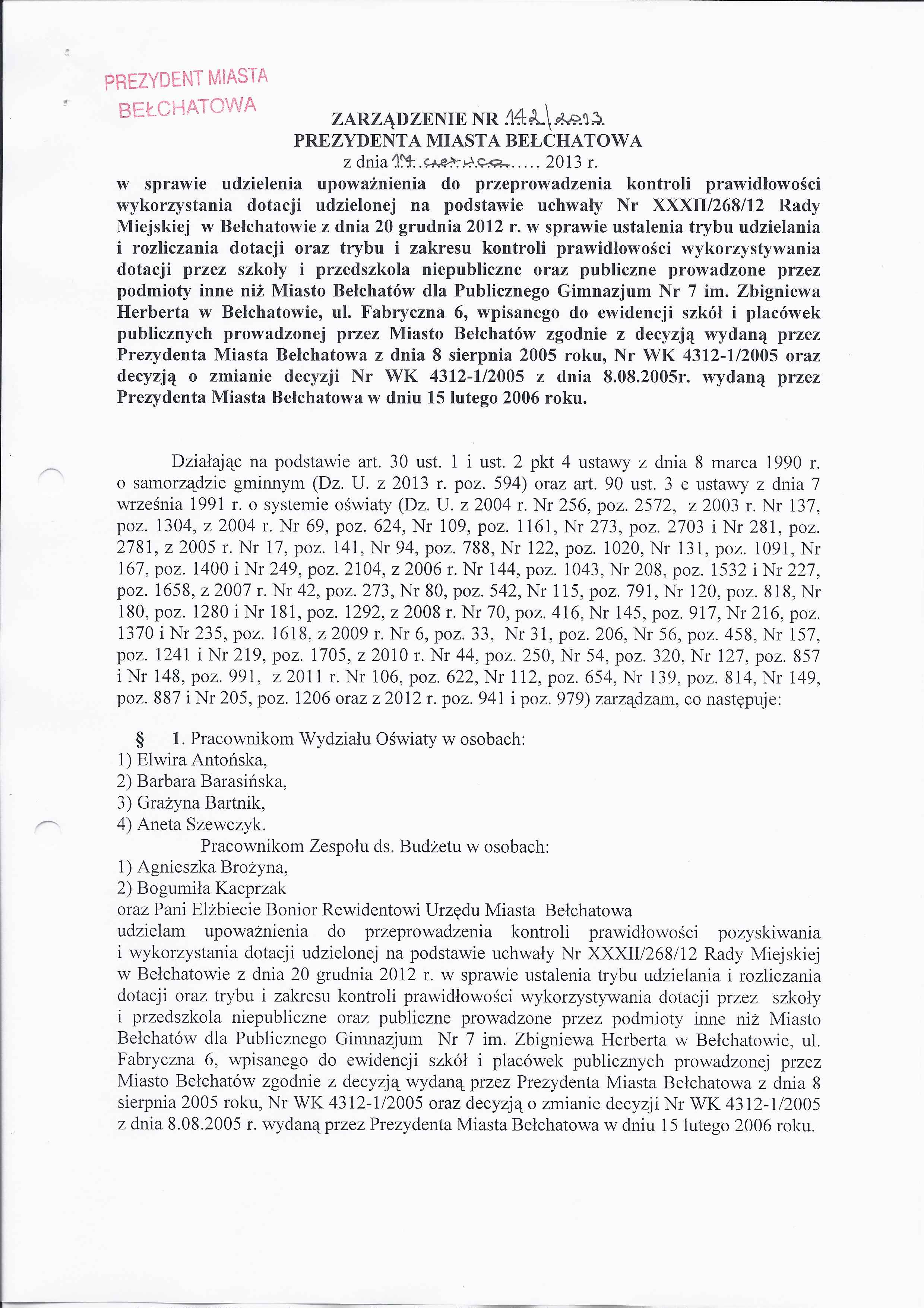 Zarządzenie Nr 142 z dnia 17 czerwca 2013 r. w/s udzielenia upoważnienia do przeprowadzenia kontroli prawidłowości wykorzystania dotacji udzielonej na podstawie uchwały Nr XXXII/268/12 Rady Miejskiej w Bełchatowie z dnia 20 grudnia 2012 r. w sprawie ustalenia trybu udzielania i rozliczania dotacji oraz trybu i zakresu kontroli prawidłowości wykorzystywania dotacji przez szkoły i przedszkola niepubliczne oraz publiczne prowadzone przez podmioty inne niż Miasto Bełchatów dla Publicznego Gimnazjum Nr 7 im. Zbigniewa Herberta w Bełchatowie, ul. Fabryczna 6, wpisanego do ewidencji szkół i placówek publicznych prowadzonej przez Miasto Bełchatów zgodnie z decyzją wydaną przez Prezydenta Miasta Bełchatowa z dnia 8 sierpnia 2005 roku, Nr WK 4312-1/2005 oraz decyzją o zmianie decyzji Nr WK 4312-1/2005 z dnia 8.08.2005 r. wydaną przez Prezydenta Miasta Bełchatowa w dniu 15 lutego 2006 roku