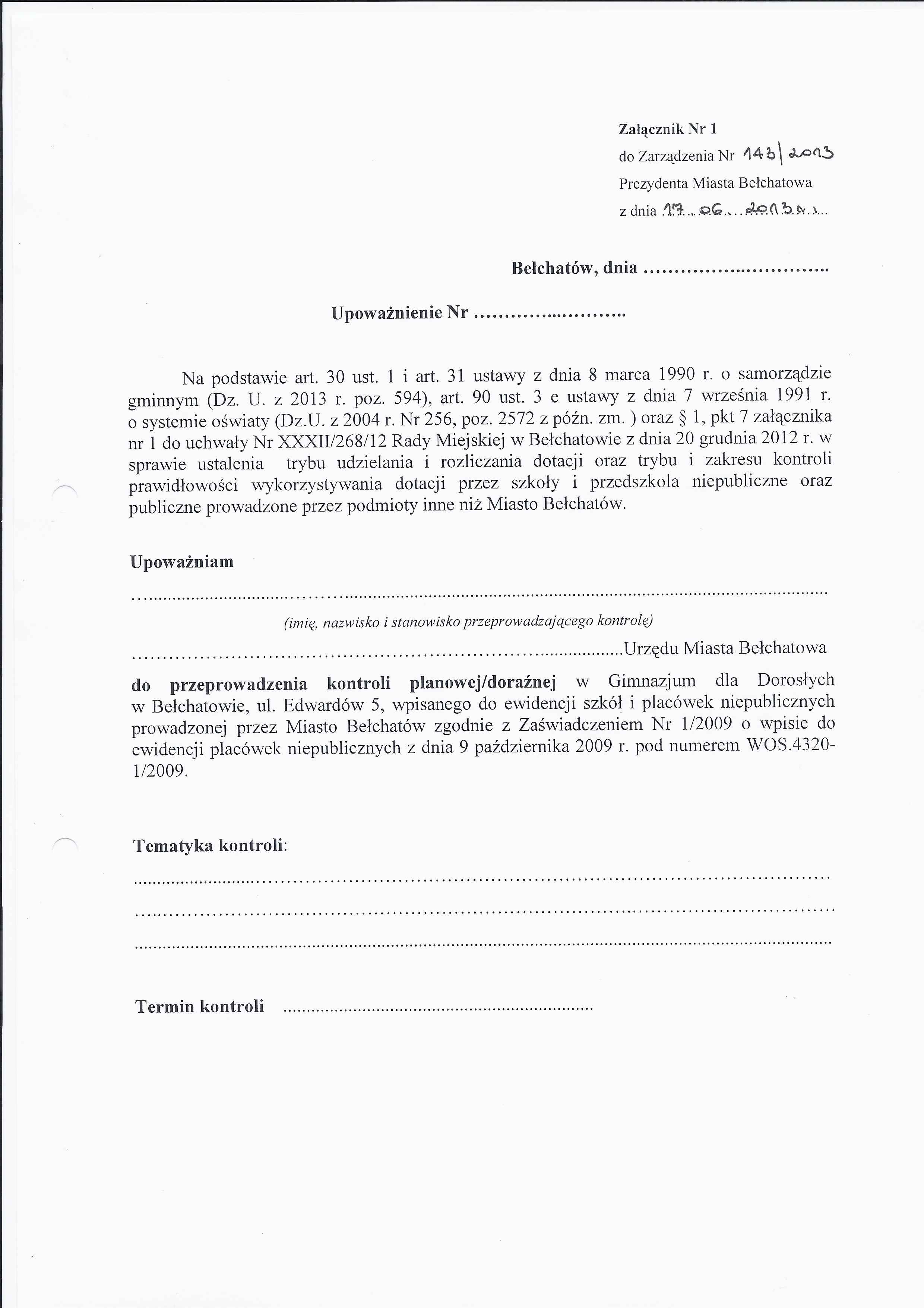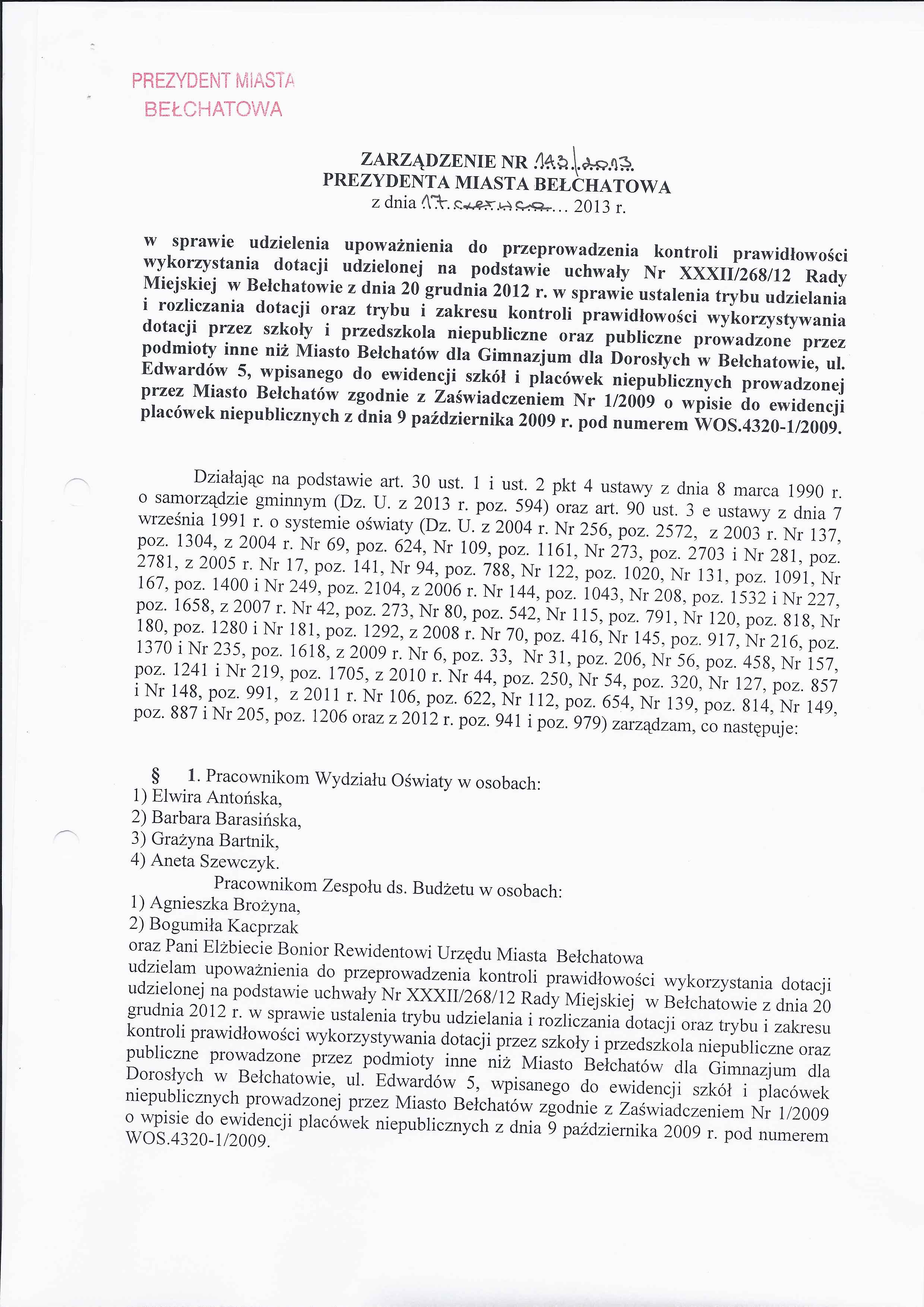 Zarządzenie Nr 143 z dnia 17 czerwca 2013 r. w/s udzielenia upoważnienia do przeprowadzenia kontroli prawidłowości wykorzystania dotacji udzielonej na podstawie uchwały Nr XXXII/268/12 Rady Miejskiej w Bełchatowie z dnia 20 grudnia 2012 r. w sprawie ustalenia trybu udzielania i rozliczania dotacji oraz trybu i zakresu kontroli prawidłowości wykorzystywania dotacji przez szkoły i przedszkola niepubliczne oraz publiczne prowadzone przez podmioty inne niż Miasto Bełchatów dla Gimnazjum dla Dorosłych w Bełchatowie, ul. Edwardów 5, wpisanego do ewidencji szkół i placówek niepublicznych prowadzonej przez Miasto Bełchatów zgodnie z Zaświadczeniem Nr 1/2009 o wpisie do ewidencji placówek niepublicznych z dnia 9 października 2009 r. pod numerem WOS.4320-1/2009
