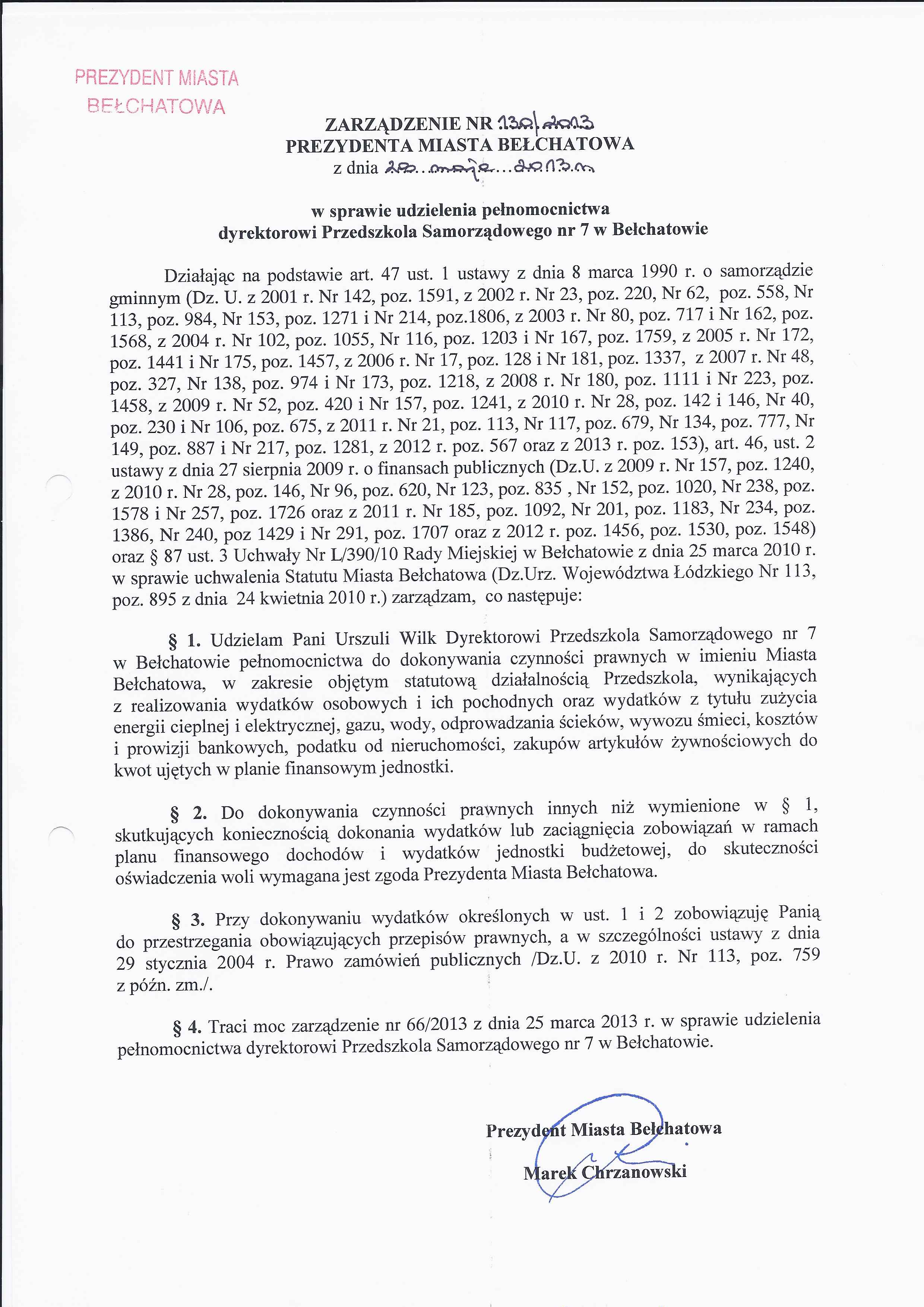 Zarządzenie Nr 130 z dnia 28 maja 2013 r. w/s udzielenia pełnomocnictwa dyrektorowi Przedszkola Samorządowego nr 7 w Bełchatowie