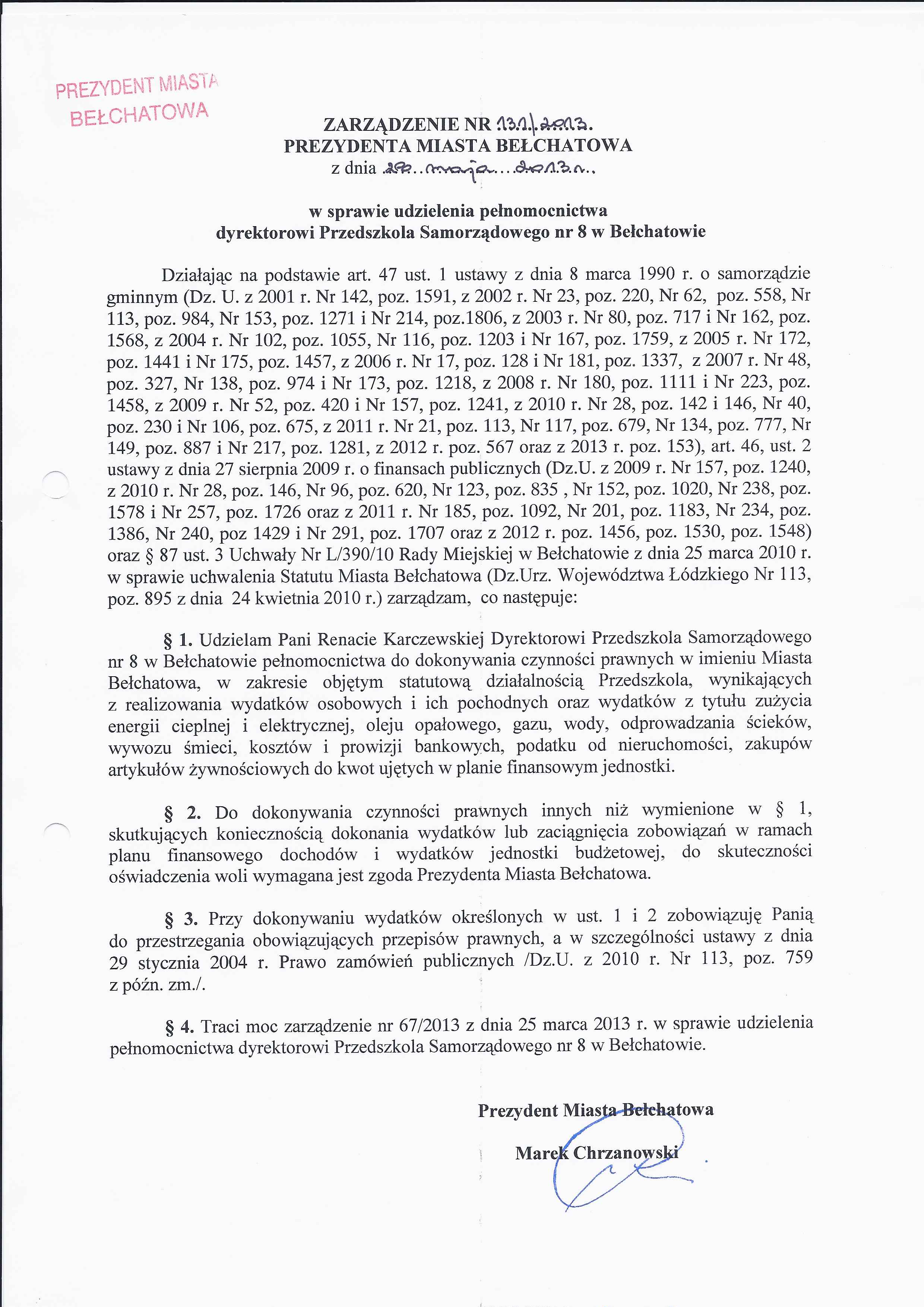 Zarządzenie Nr 131 z dnia 28 maja 2013 r. w/s udzielenia pełnomocnictwa dyrektorowi Przedszkola Samorządowego nr 8 w Bełchatowie