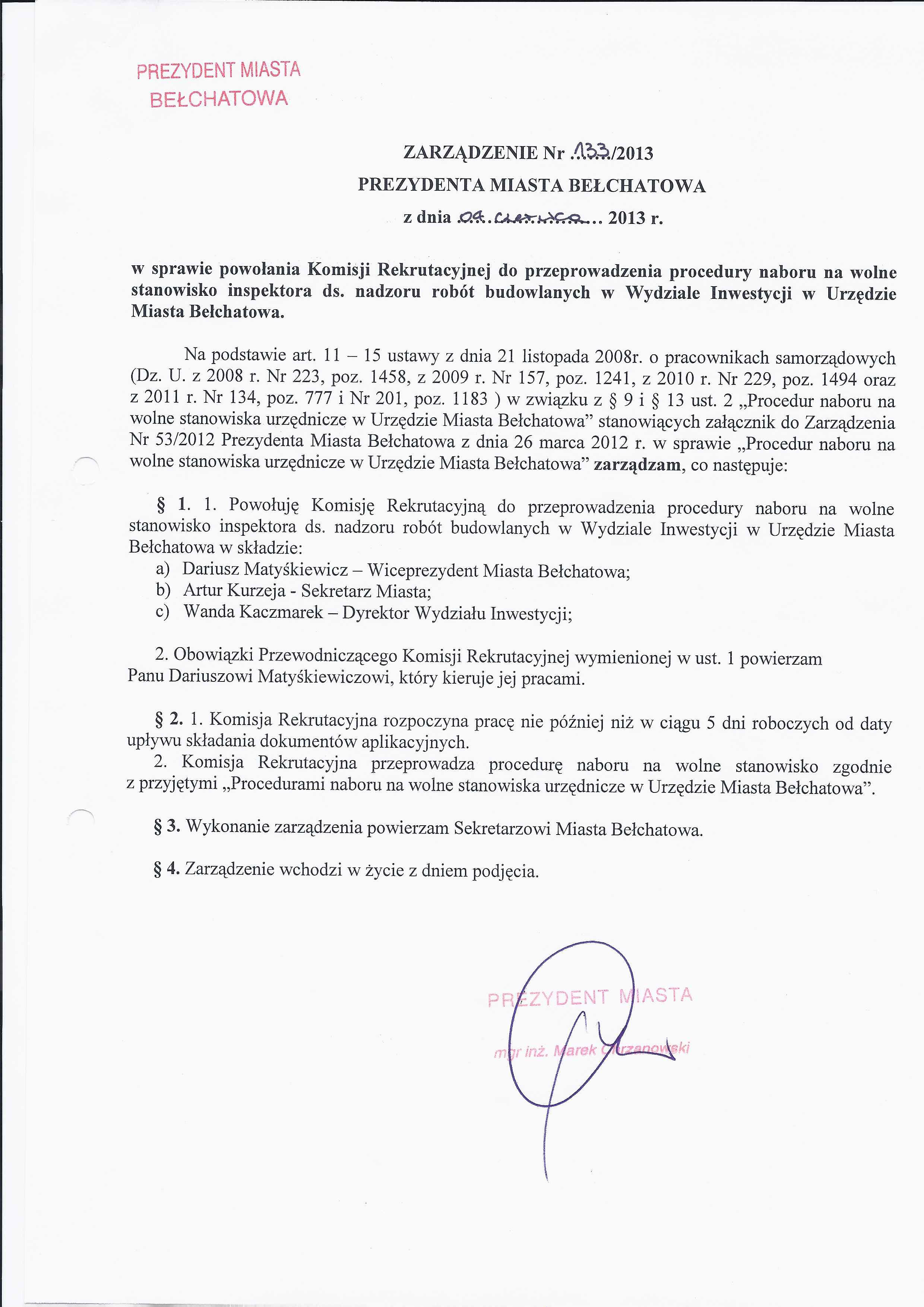 Zarządzenie Nr 133 z dnia 4 czerwca 2013 r. w/s powołania Komisji Rekrutacyjnej do przeprowadzenia procedury naboru na wolne stanowisko inspektora ds. nadzoru robót budowlanych w Wydziale Inwestycji w Urzędzie Miasto Bełchatowa