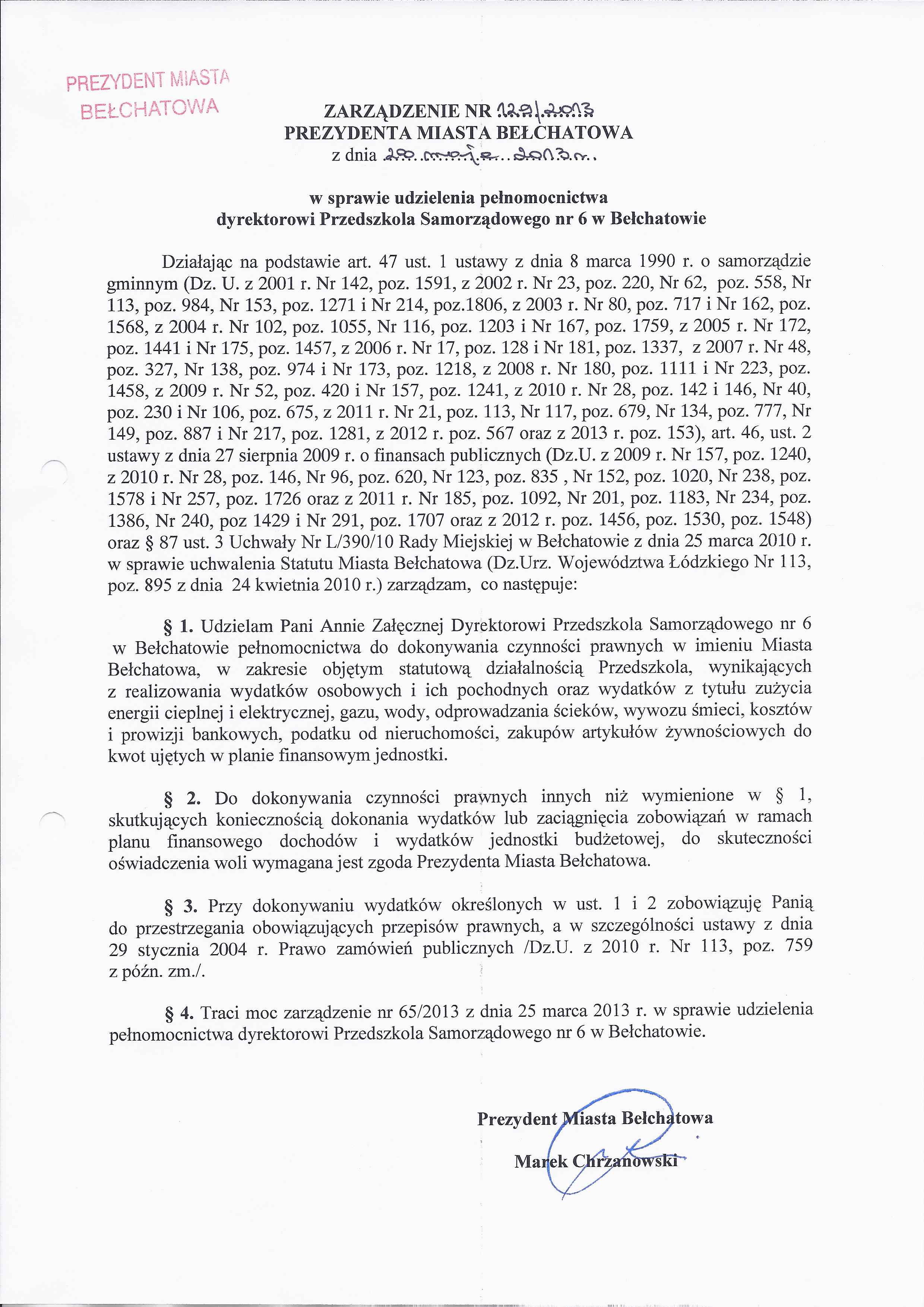Zarządzenie Nr 129 z dnia 28 maja 2013 r. w/s udzielenia pełnomocnictwa dyrektorowi Przedszkola Samorządowego nr 6 w Bełchatowie