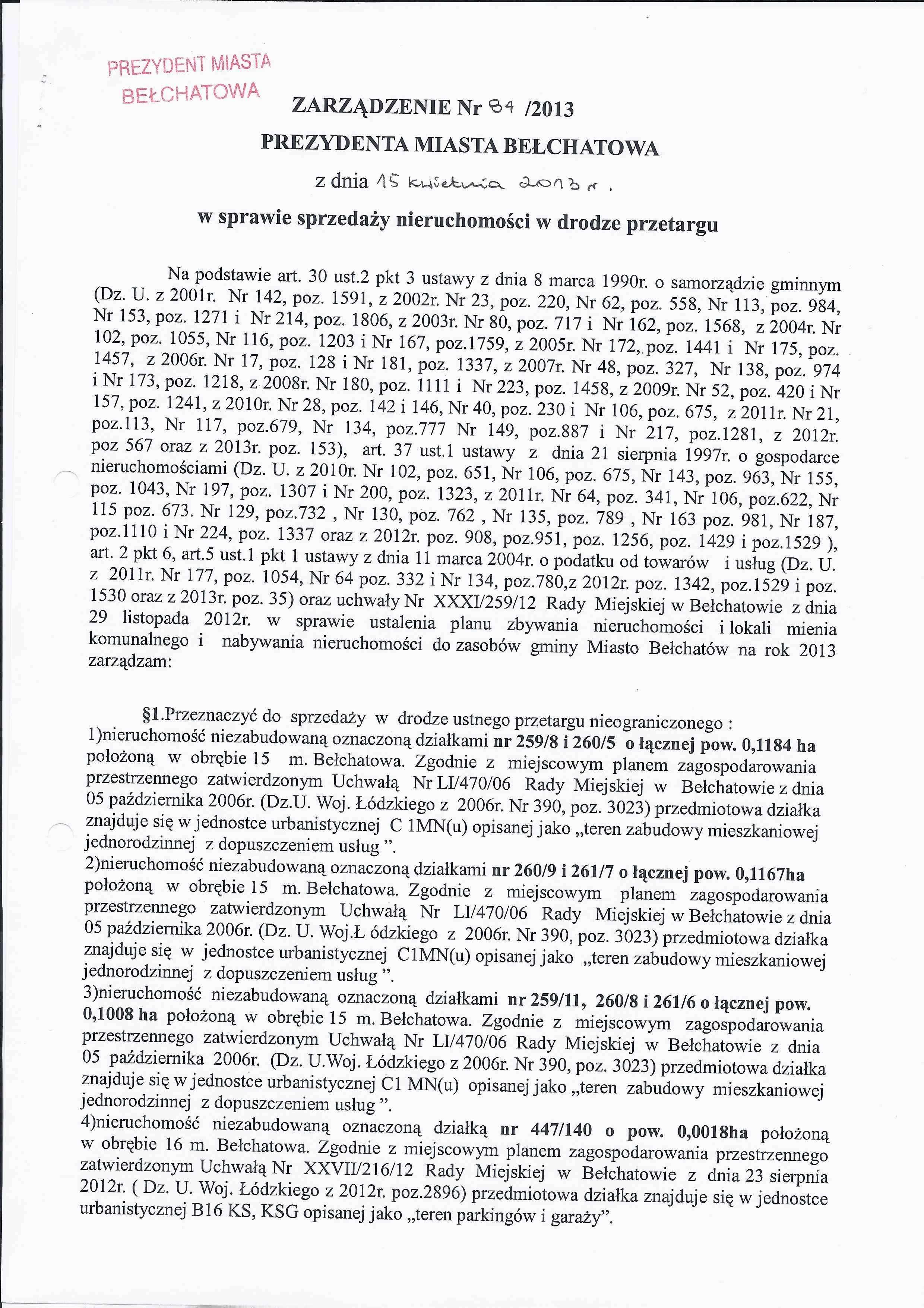 Zarządzenie Nr 84 z dnia 15 kwietnia 2013 r. w/s sprzedaży nieruchomości w drodze przetargu