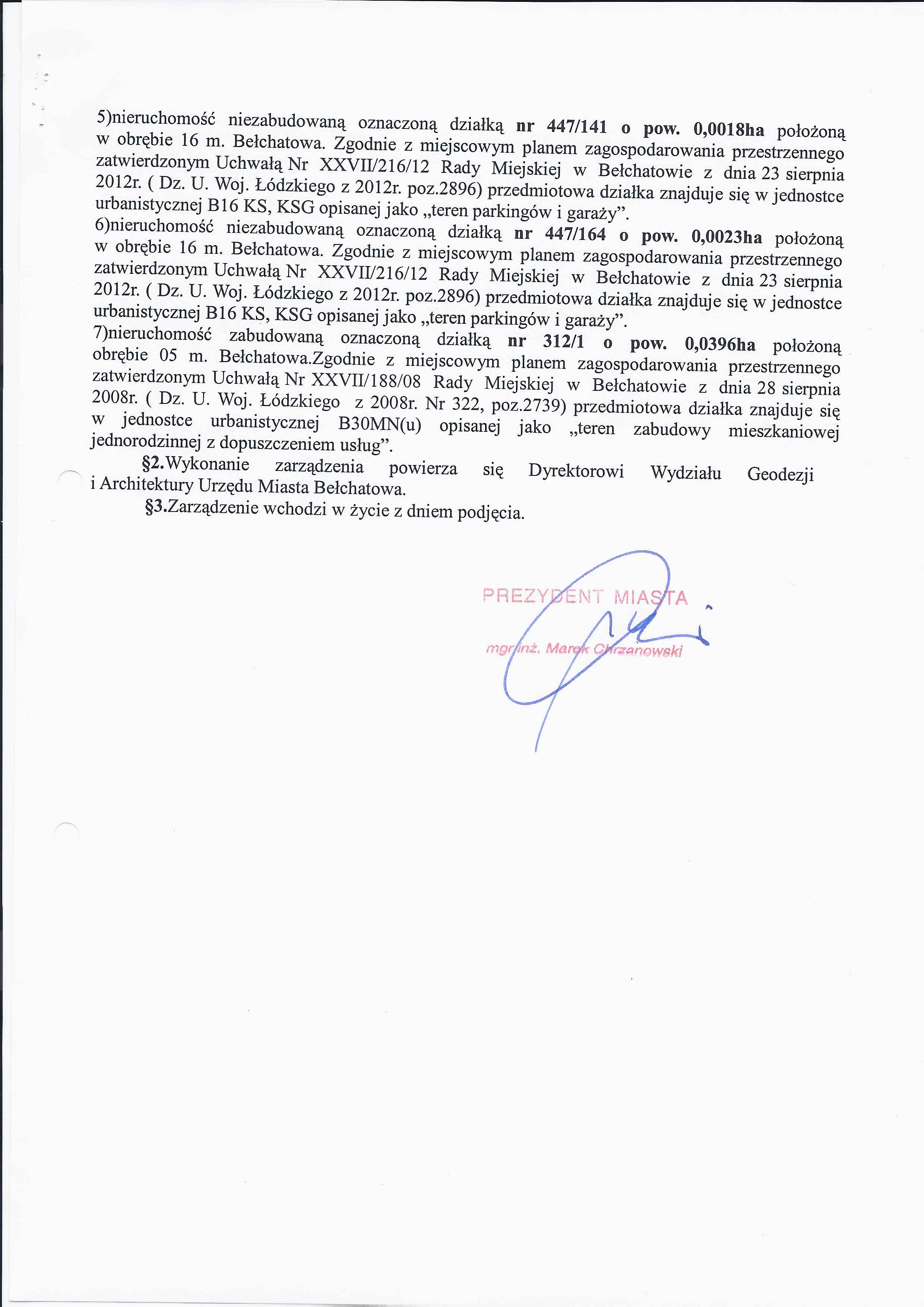 Zarządzenie Nr 83 z dnia 15 kwietnia 2013 r. w/s nieodpłatnego nabycia środków trwałych - budowli w postaci przyłącza wodociągowego, urządzenia i przyłącza kanalizacji sanitarnej i deszczowej na majątek Miasta Bełchatowa