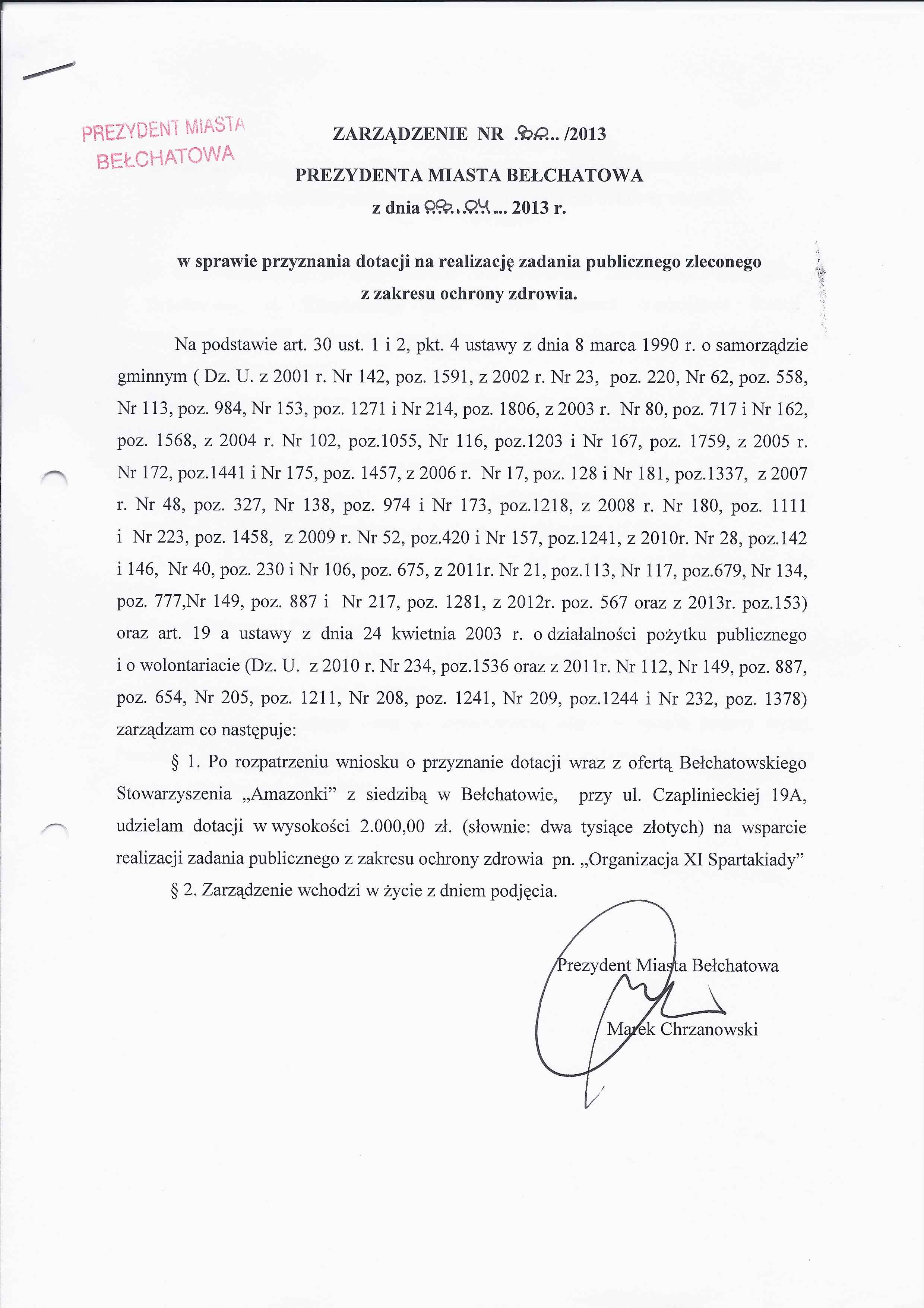 Zarządzenie Nr 80 z dnia 8 kwietnia 2013 r. w/s przyznania dotacji na realizację zadania publicznego zleconego z zakresu ochrony zdrowia