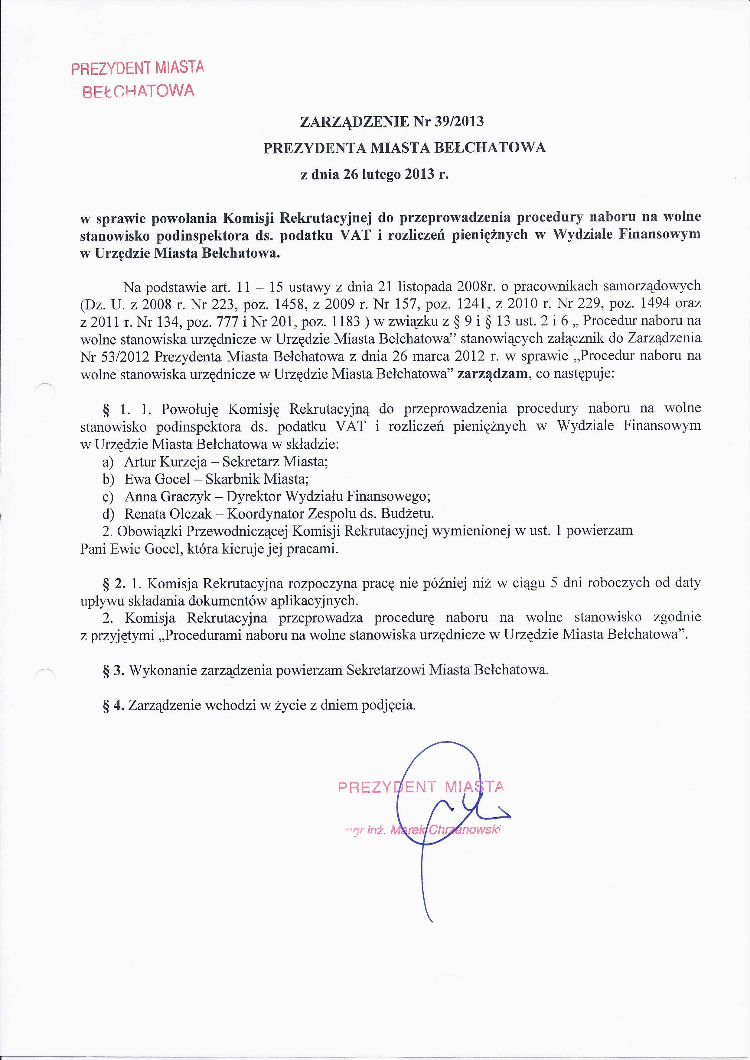 Zarządzenie Nr 39 z dnia 26 lutego 2013 r. w/s powołania Komisji Rekrutacyjnej do przeprowadzenia procedury naboru na wolne stanowisko podinspektora ds. podatku VAT i rozliczeń pieniężnych w Wydziale Finansowym w Urzędzie Miasta Bełchatowa