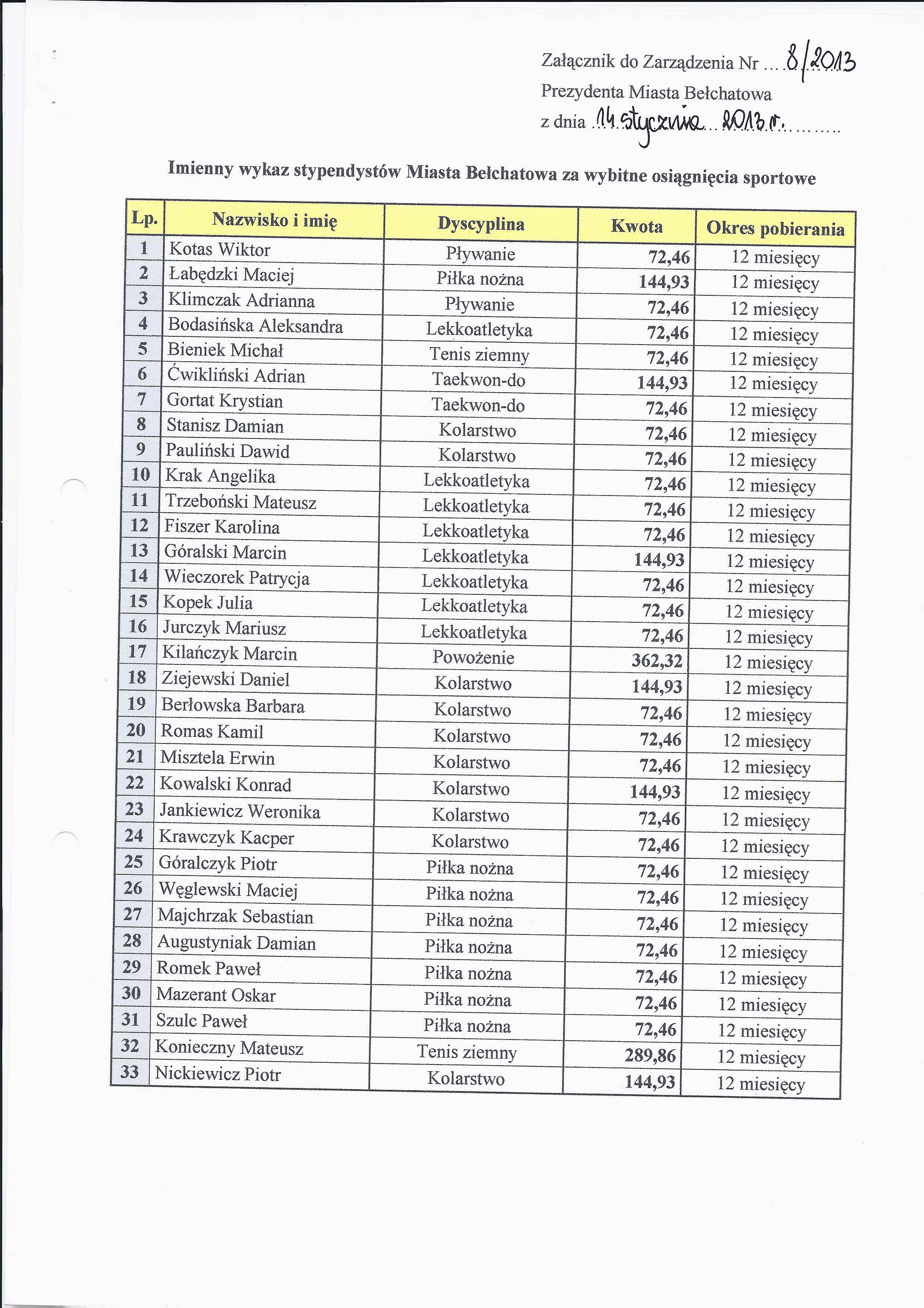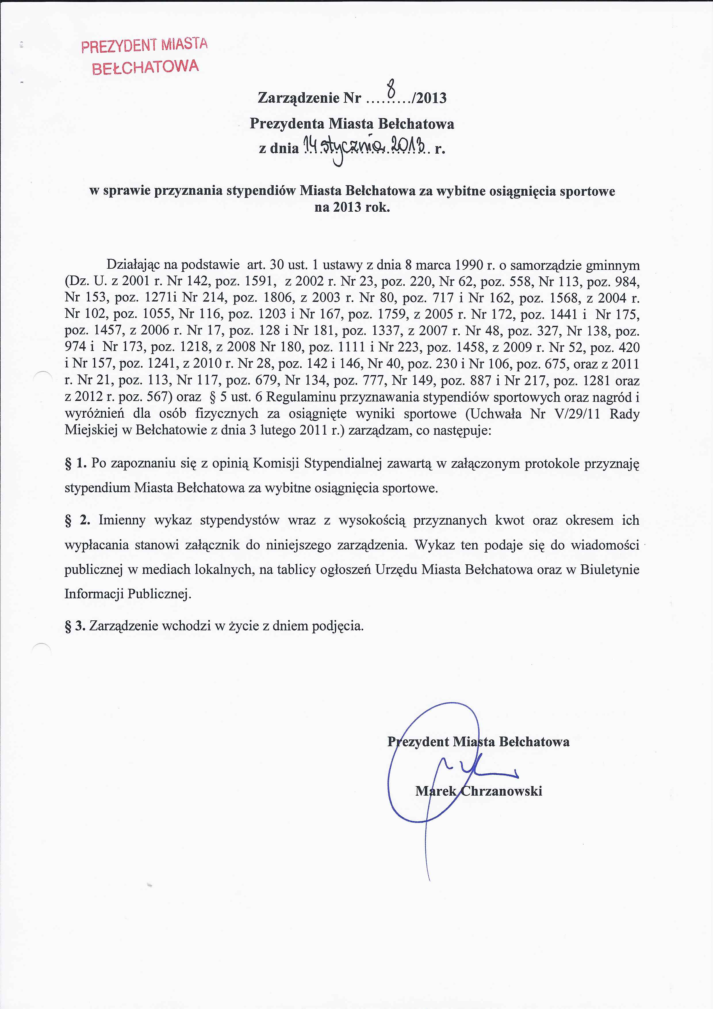 Zarządzenie Nr 8 z dnia 14 stycznia 2013 r. w/s przyznania stypendiów Miasta Bełchatowa za wybitne osiągnięcia sportowe na 2013 rok