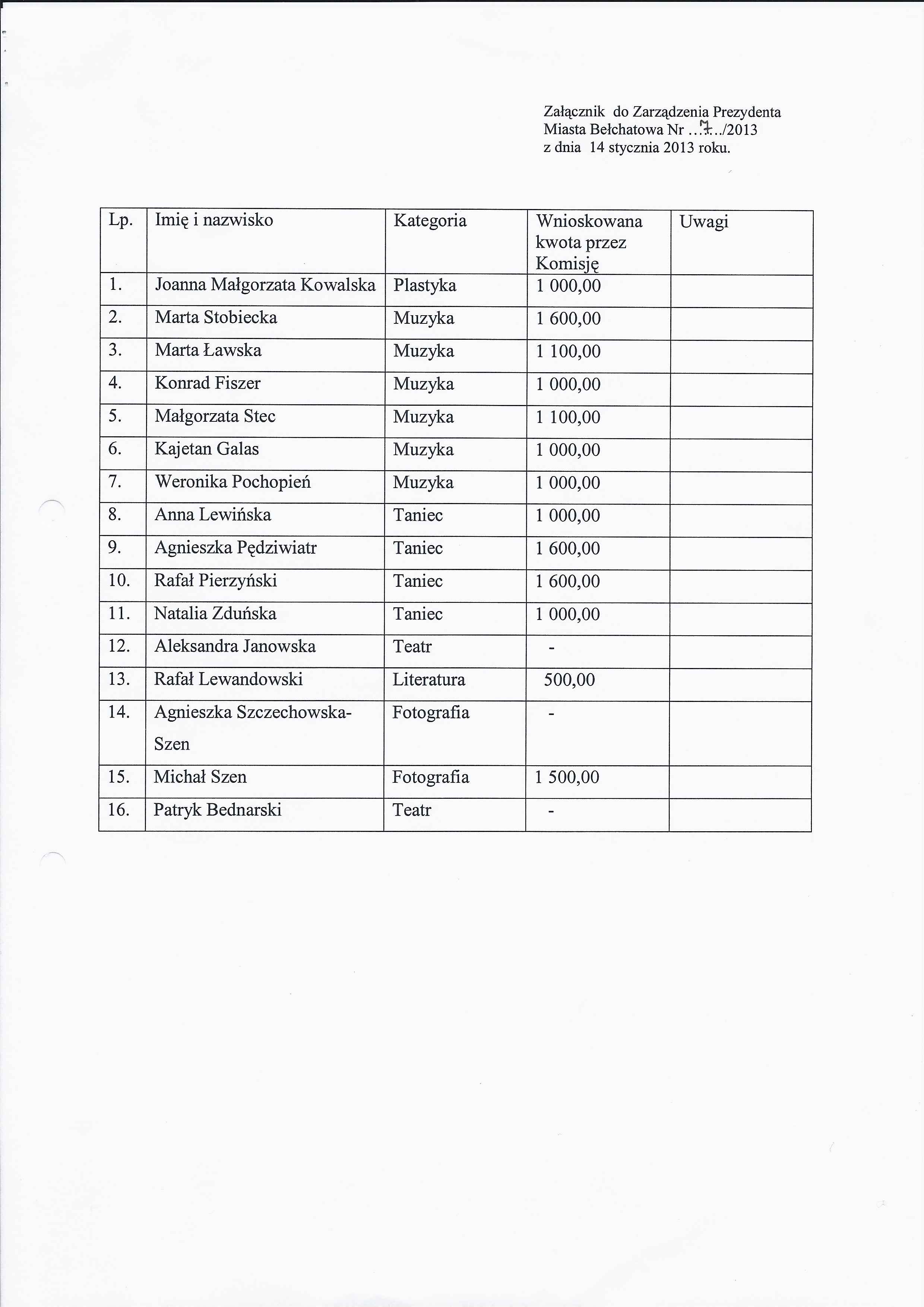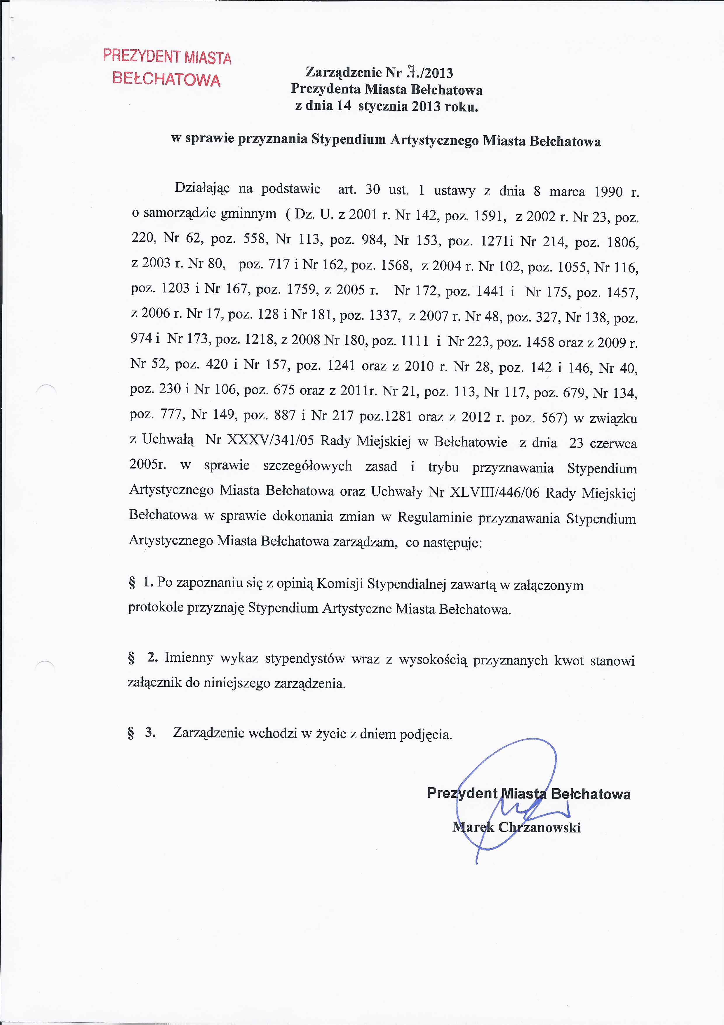Zarządzenie Nr 7 z dnia 14 stycznia 2013 r. w/s przyznania Stypendium Artystycznego Miasta Bełchatowa