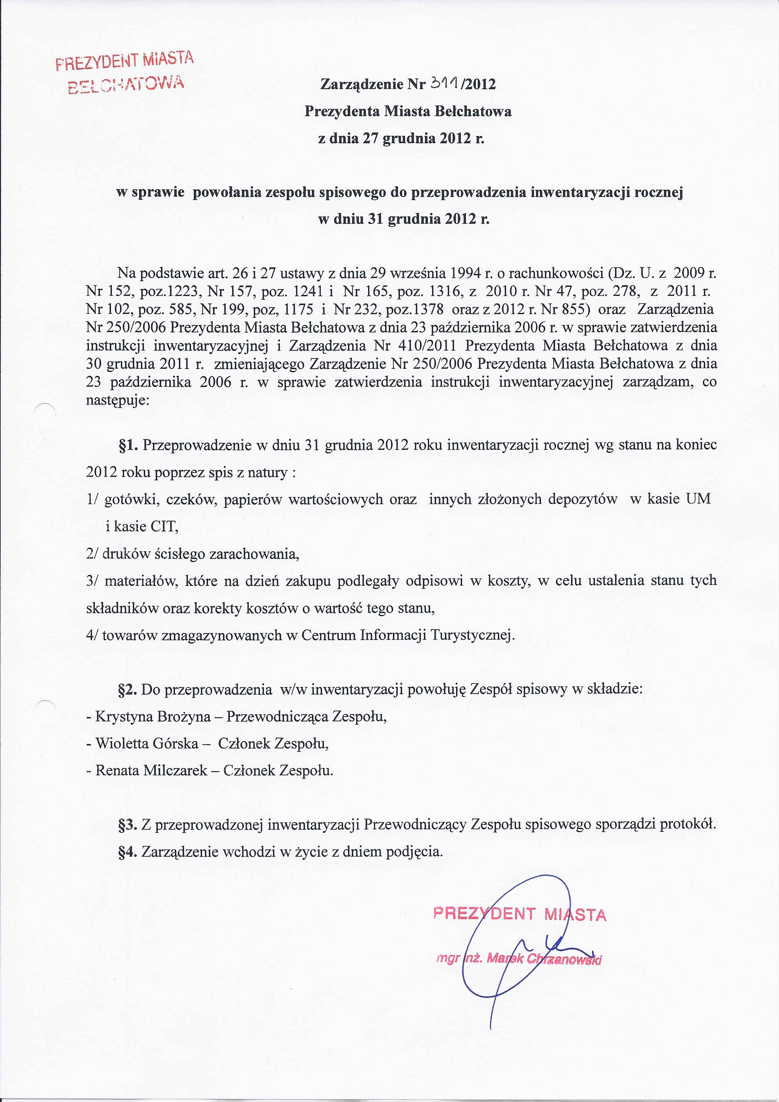 Zarządzenie Nr 311 z dnia 27 grudnia 2012 r. w/s powołania zespołu spisowego do przeprowadzenia inwentaryzacji rocznej w dniu 31 grudnia 2012 r.