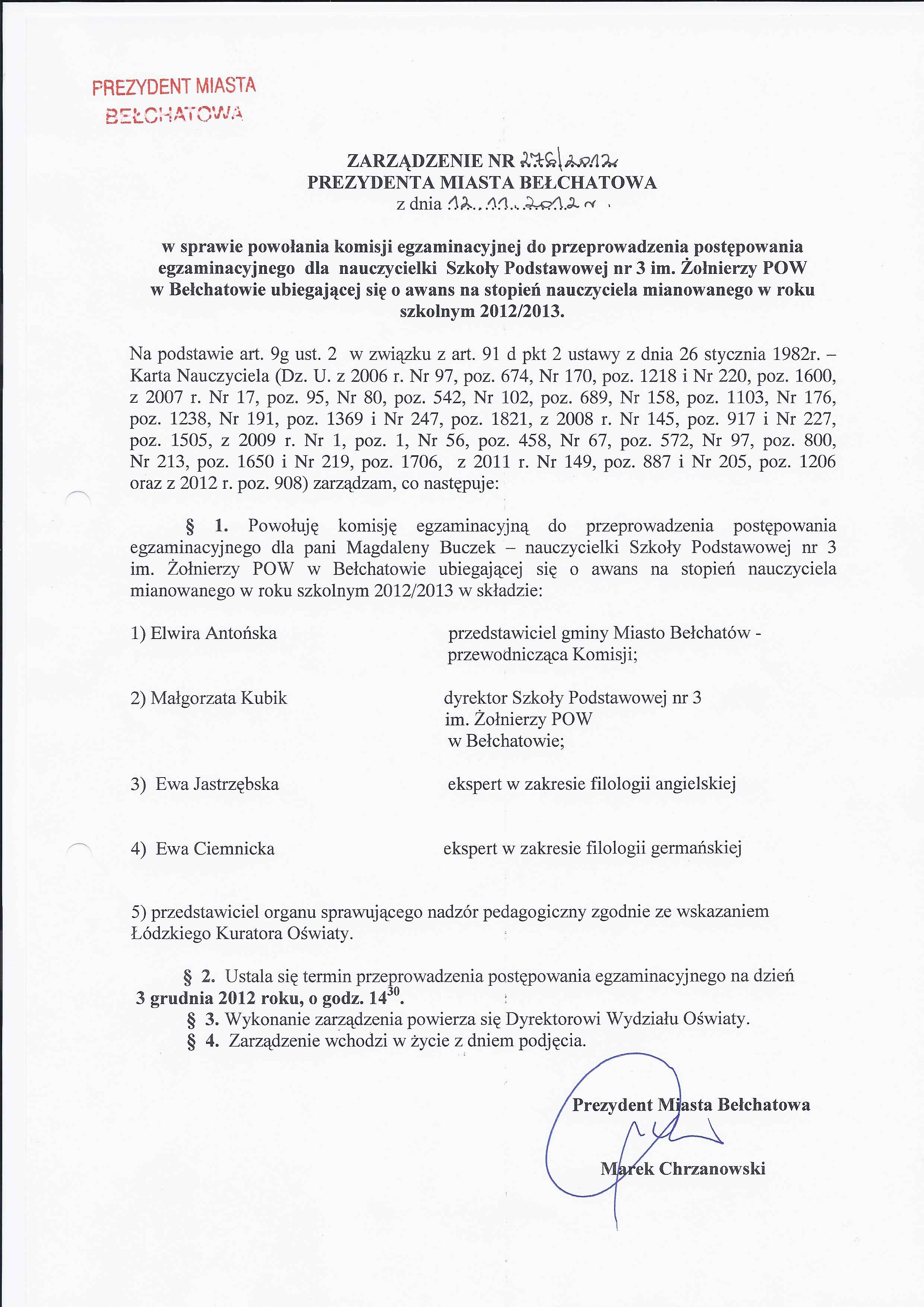 Zarządzenie Nr 275 z dnia 12 listopada 2012 r. w/s nieodpłatnego przekazania majątku na rzecz Samorządowego Przedszkola Nr 1 "Pod Topolą" w Bełchatowie, Samorządowego Przedszkola Nr 2 "Akademia Bolka i Lolka" w Bełchatowie, Integracyjnego Przedszkola Samorządowego Nr 3 w Bełchatowie, Samorządowego Przedszkola Nr 4 w Bełchatowie, Samorządowego Przedszkola Nr 5 im. Jana Brzechwy w Bełchatowie, Samorządowego Przedszkola Nr 6 im. Marii Kownackiej w Bełchatowie, Samorządowego Przedszkola Nr 7 im. Krasnala Hałabały w Bełchatowie oraz Żłobka Miejskiego "Jaś i Małgosia" w Bełchatowie