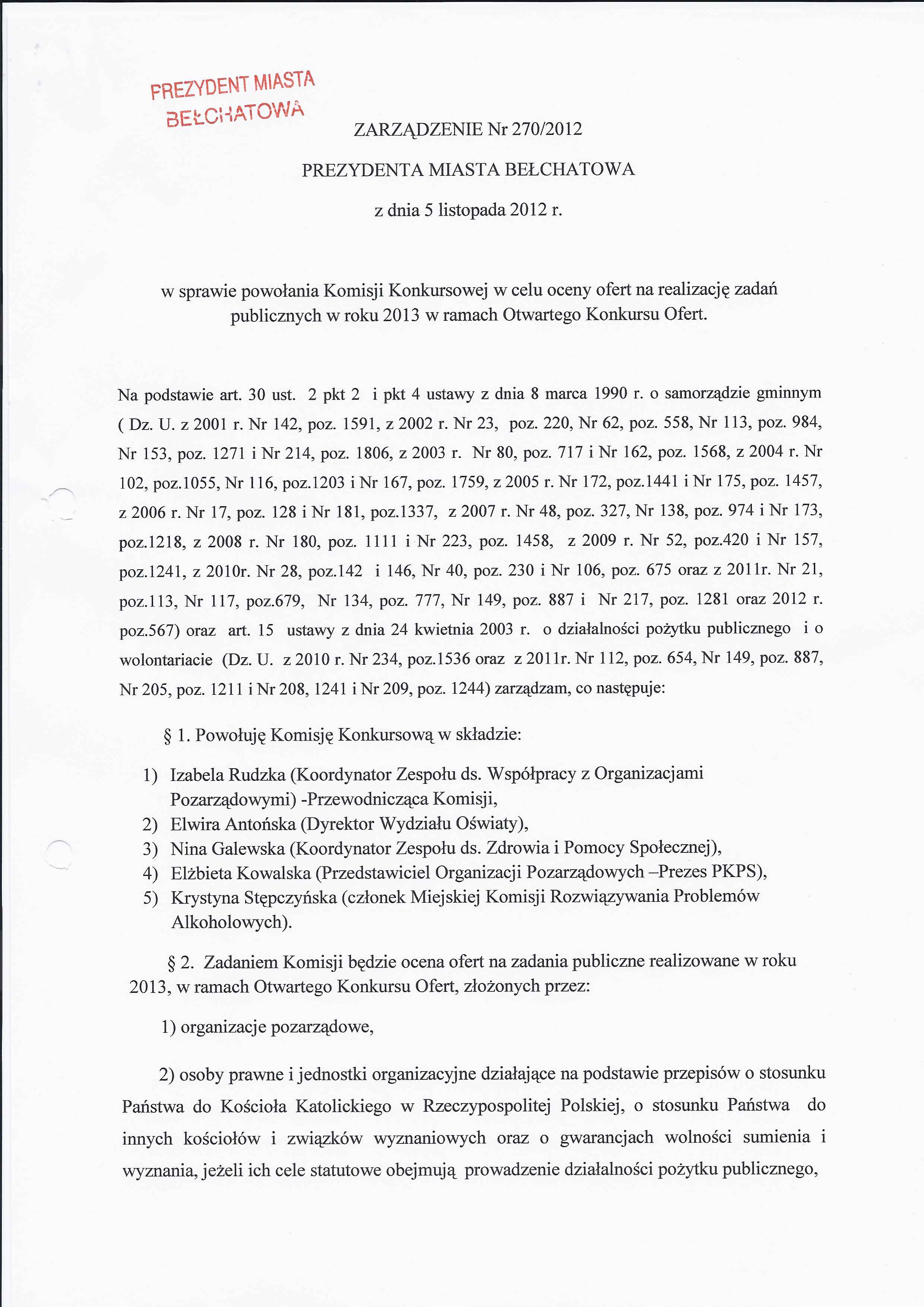 Zarządzenie Nr 270 z dnia 5 listopada 2012 r. w/s powołania Komisji Konkursowej w celu oceny ofert na realizację zadań publicznych w roku 2013 w ramach Otwartego Konkursu Ofert