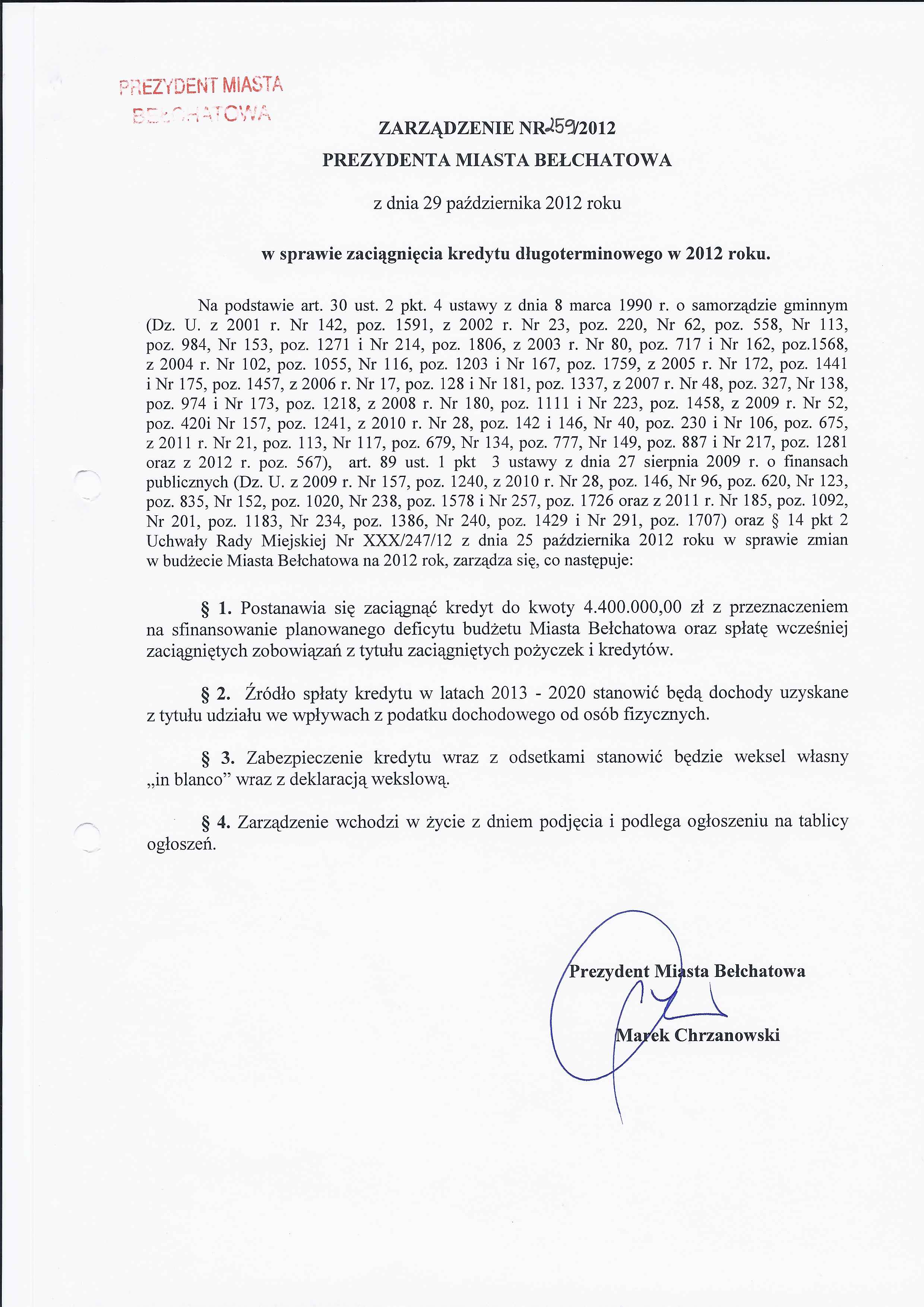 Zarządzenie Nr 259 z dnia 29 października 2012 r. w/s zaciągnięcia kredytu długoterminowego w 2012 roku