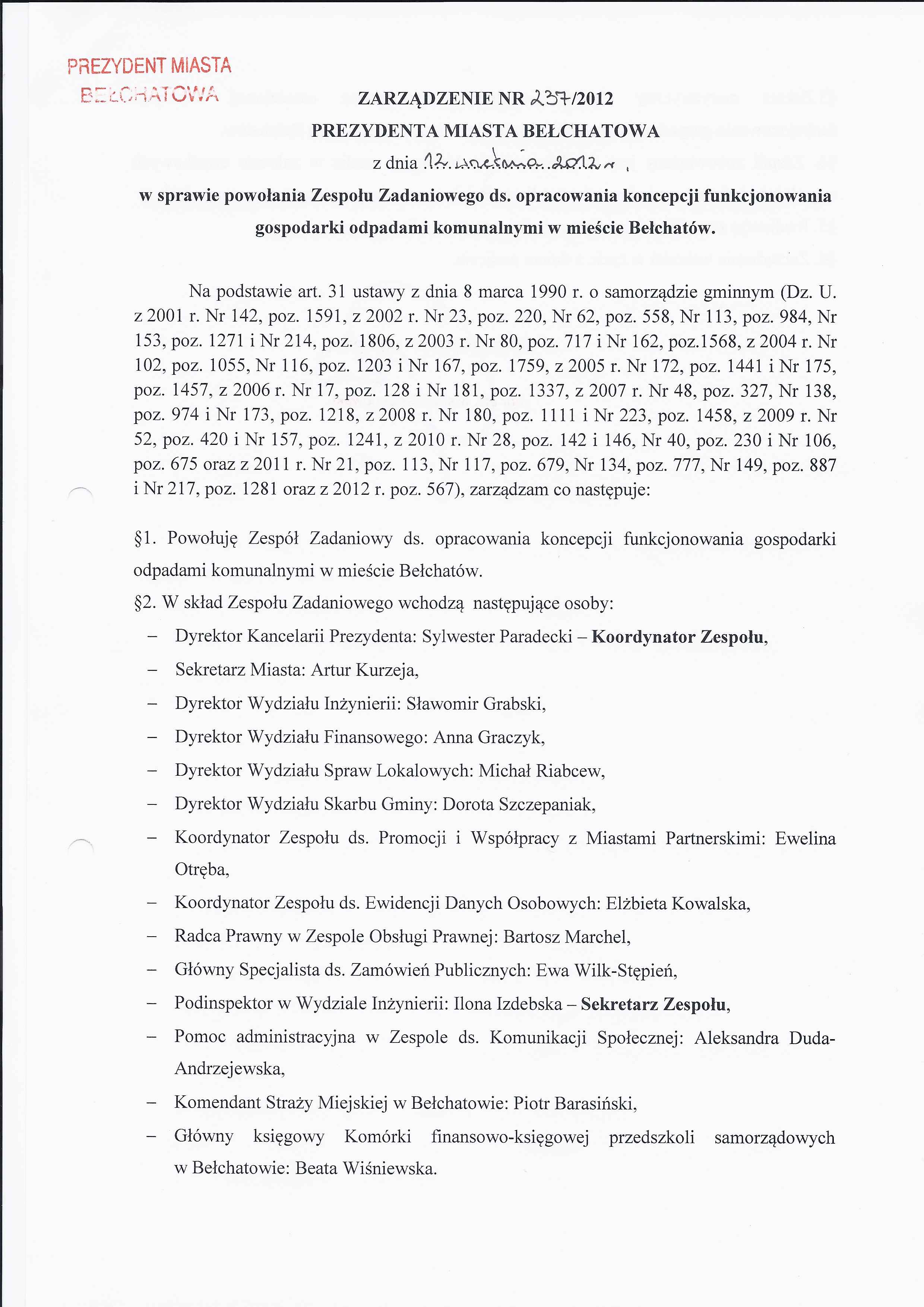 Zarządzenie Nr 237 z dnia 12 września 2012 r. w/s powołania zespołu zadaniowego