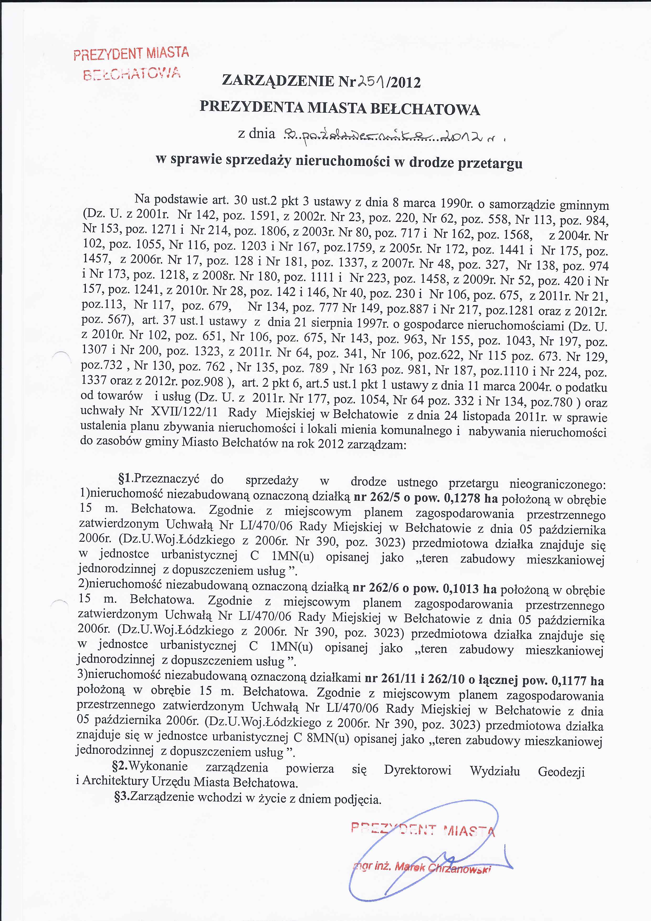Zarządzenie Nr 251 z dnia 8 października 2012 r. w/s sprzedaży nieruchomości w drodze przetargu