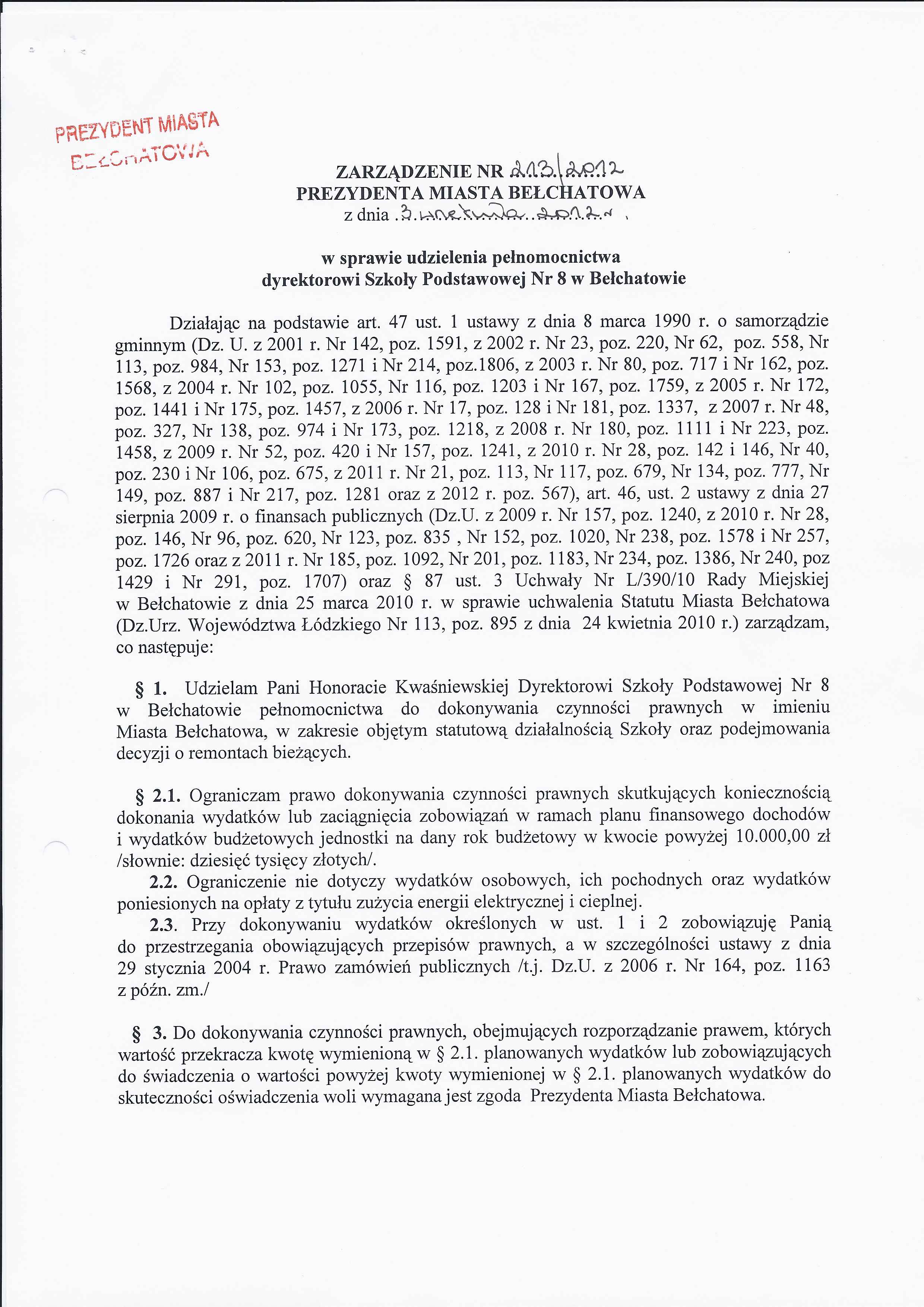 Zarządzenie Nr 213 z dnia 3 września 2012 r. w/s udzielenia pełnomocnictwa dyrektorowi Szkoły Podstawowej Nr 8 w Bełchatowie