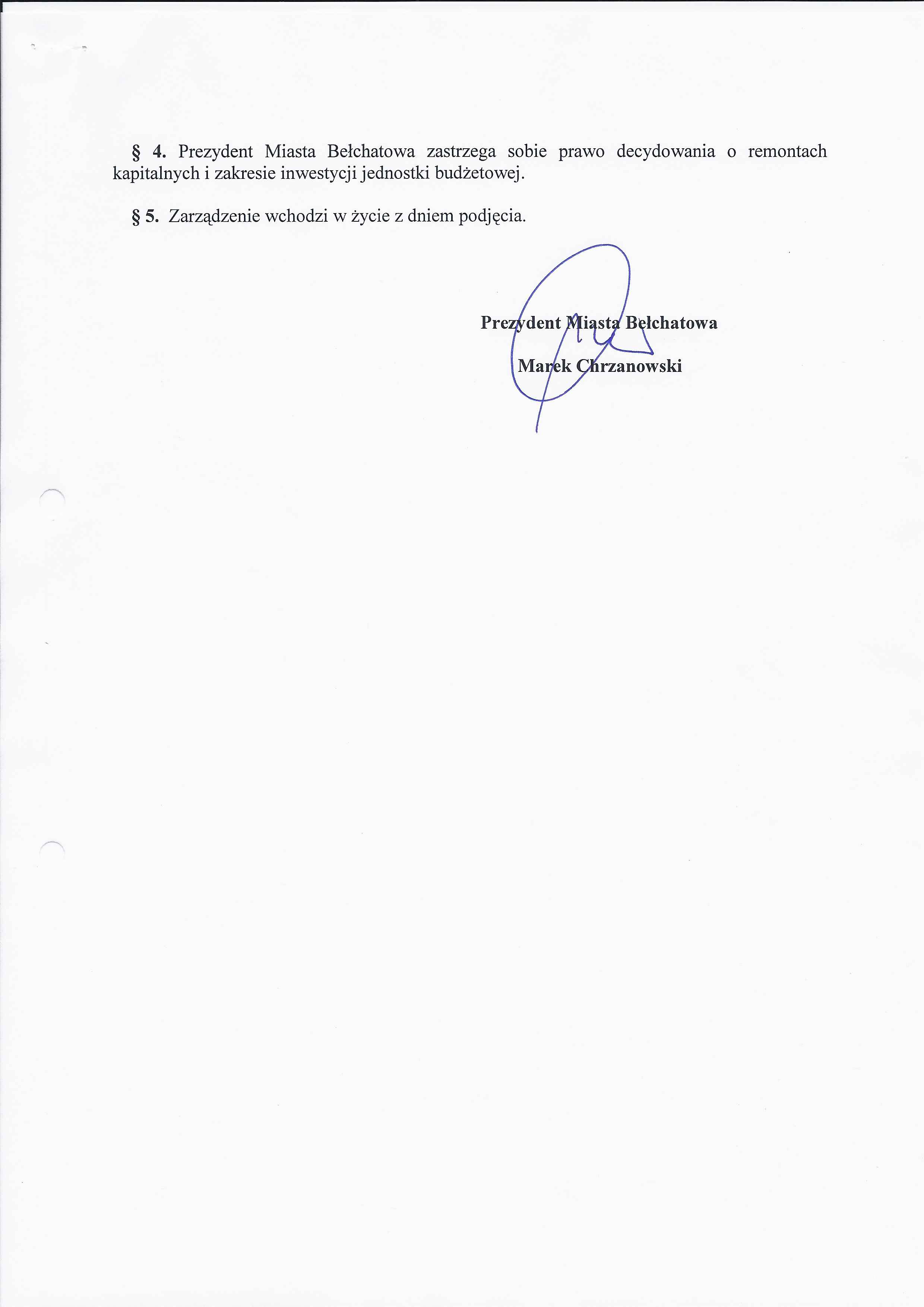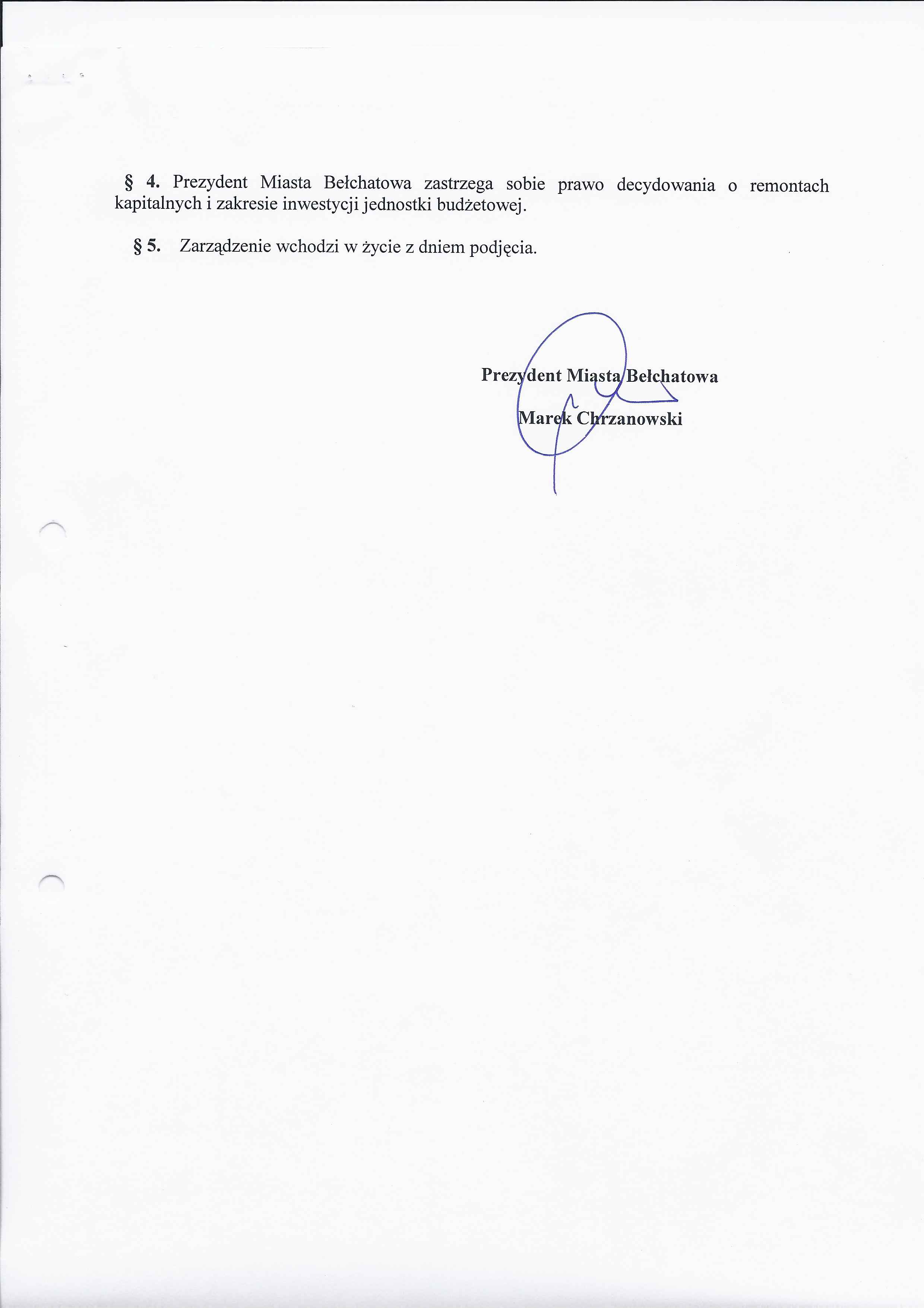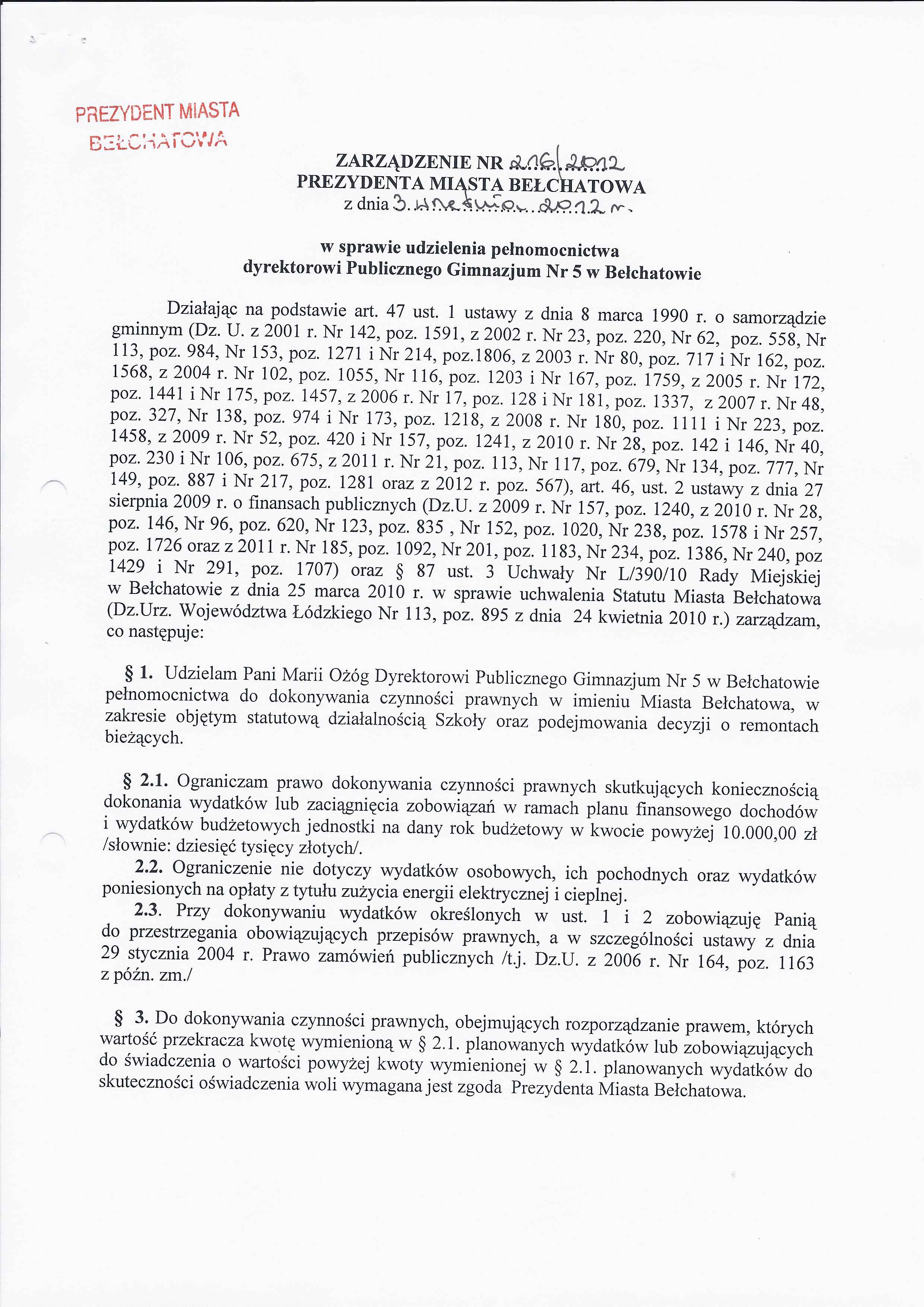 Zarządzenie Nr 216 z dnia 3 września 2012 r. w/s udzielenia pełnomocnictwa dyrektorowi Publicznego Gimnazjum Nr 5 w Bełchatowie