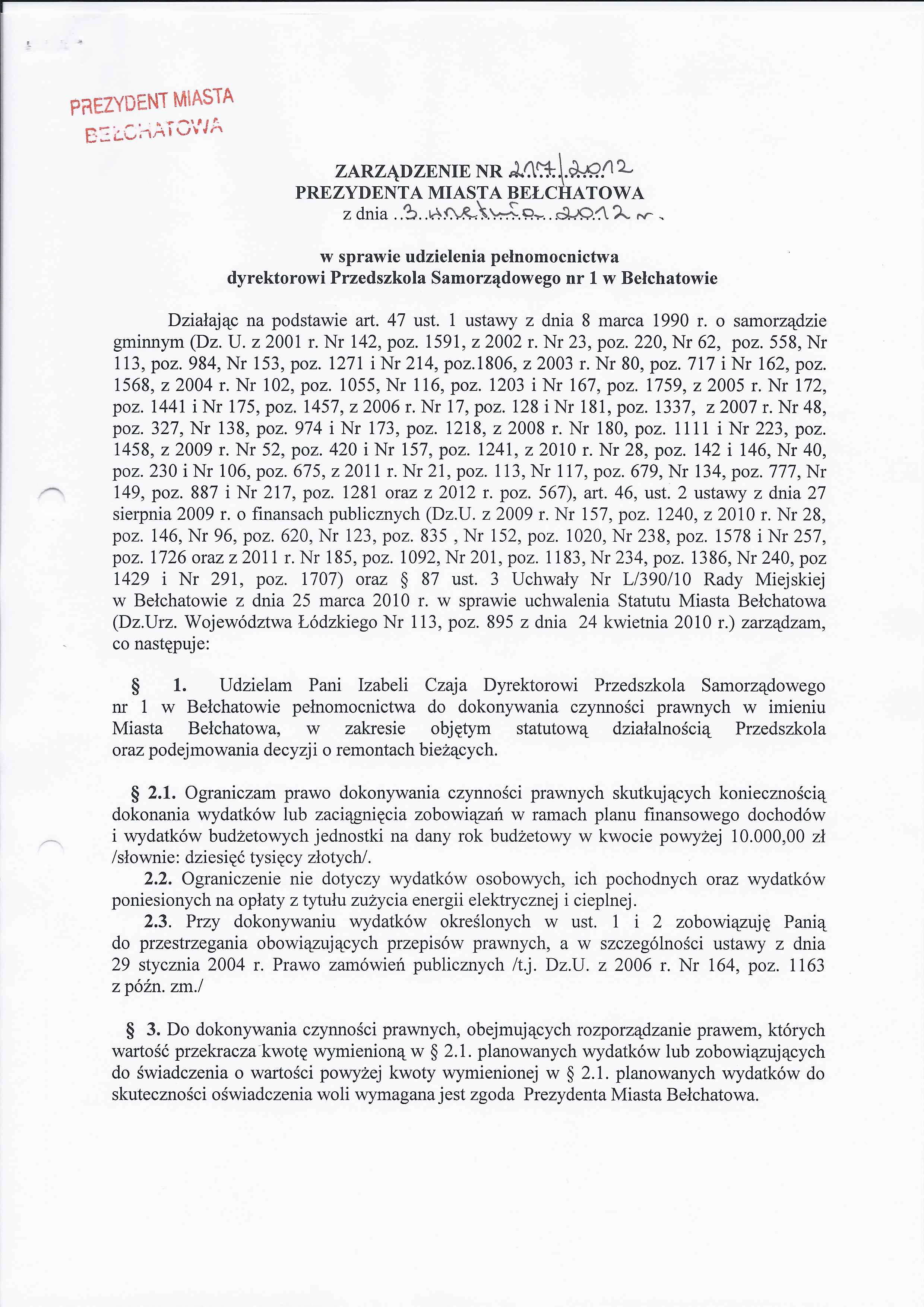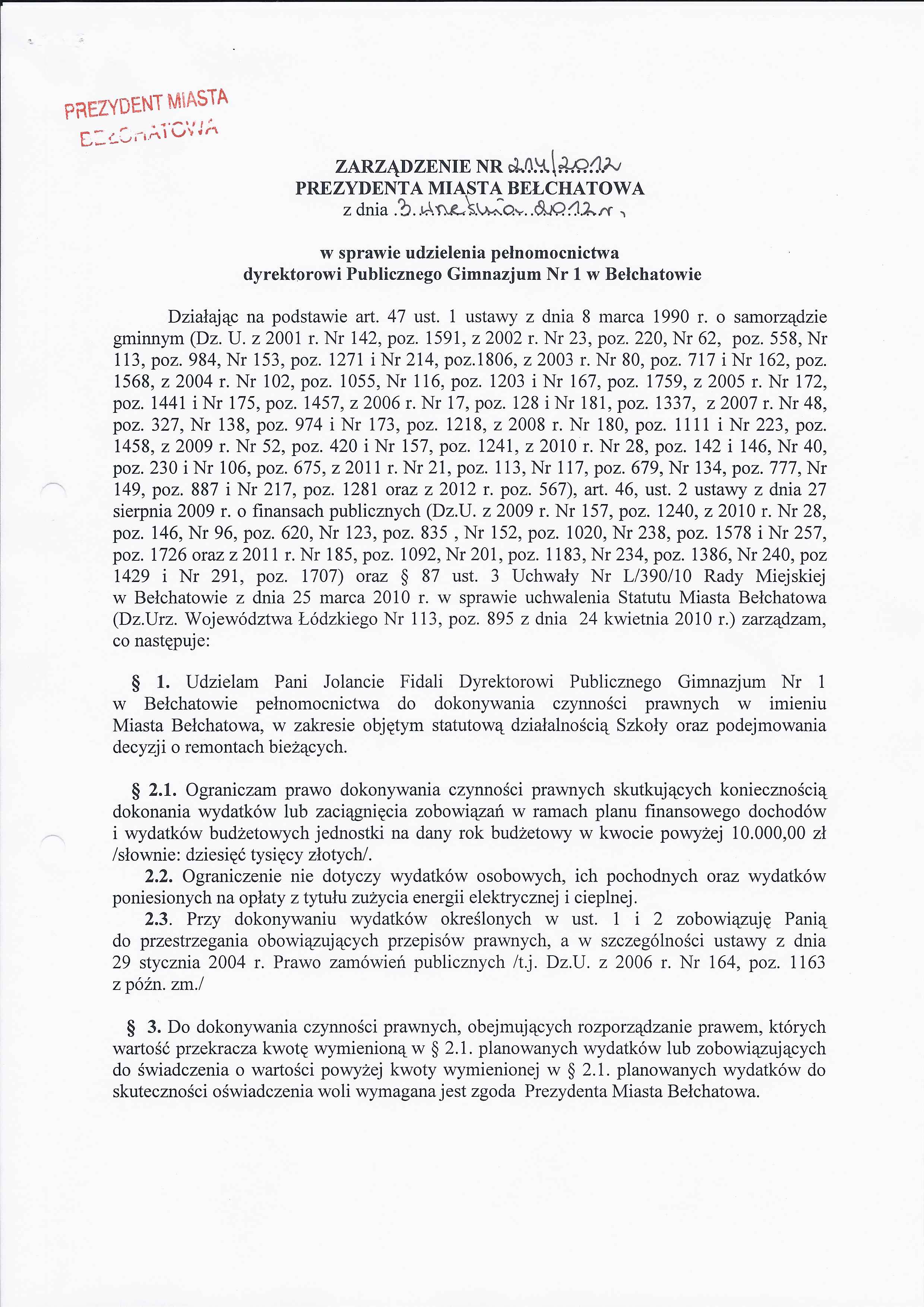Zarządzenie Nr 214 z dnia 3 września 2012 r. w/s udzielenia pełnomocnictwa dyrektorowi Publicznego Gimnazjum Nr 1 w Bełchatowie