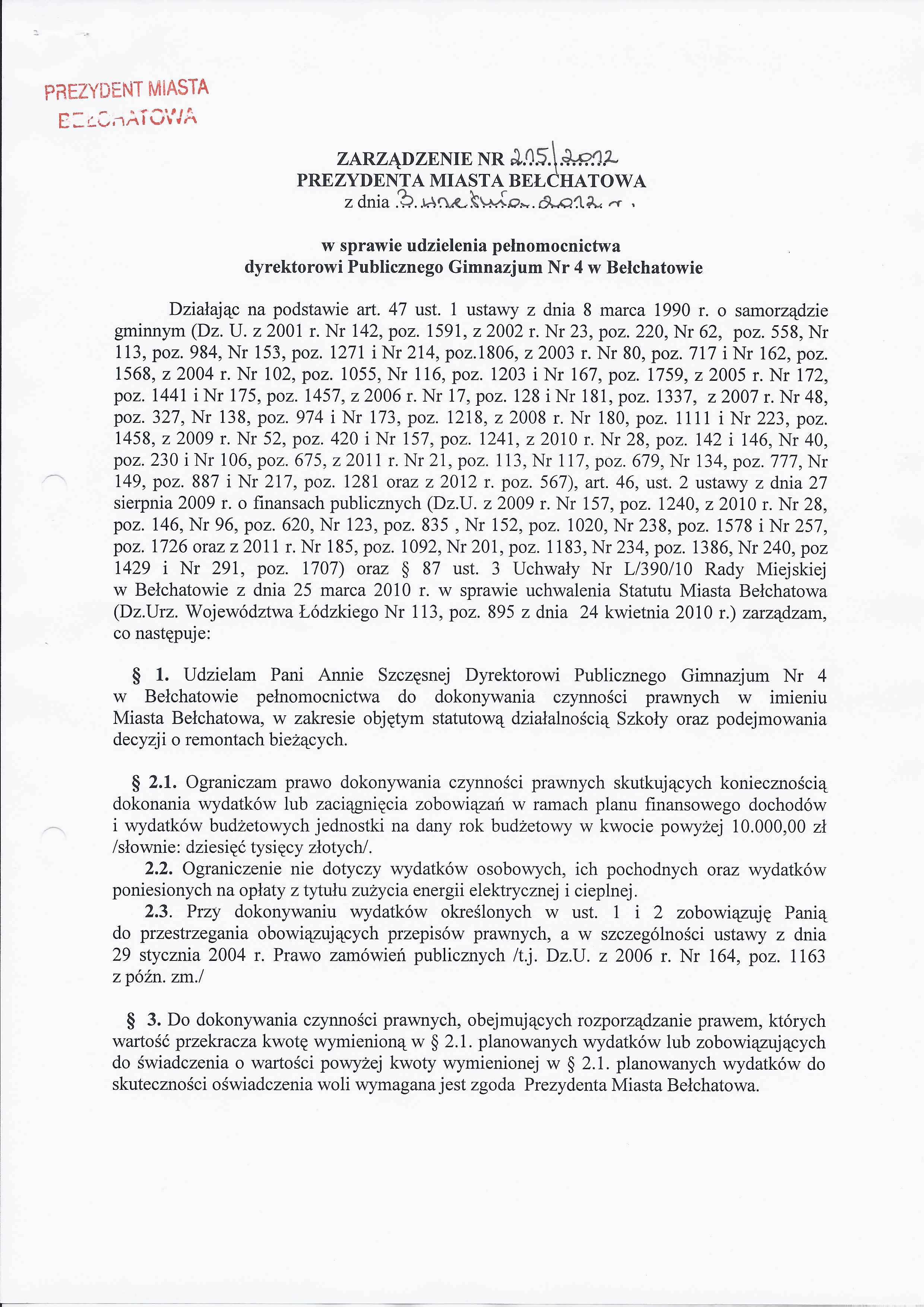 Zarządzenie Nr 215 z dnia 3 września 2012 r. w/s udzielenia pełnomocnictwa dyrektorowi Publicznego Gimnazjum Nr 4 w Bełchatowie