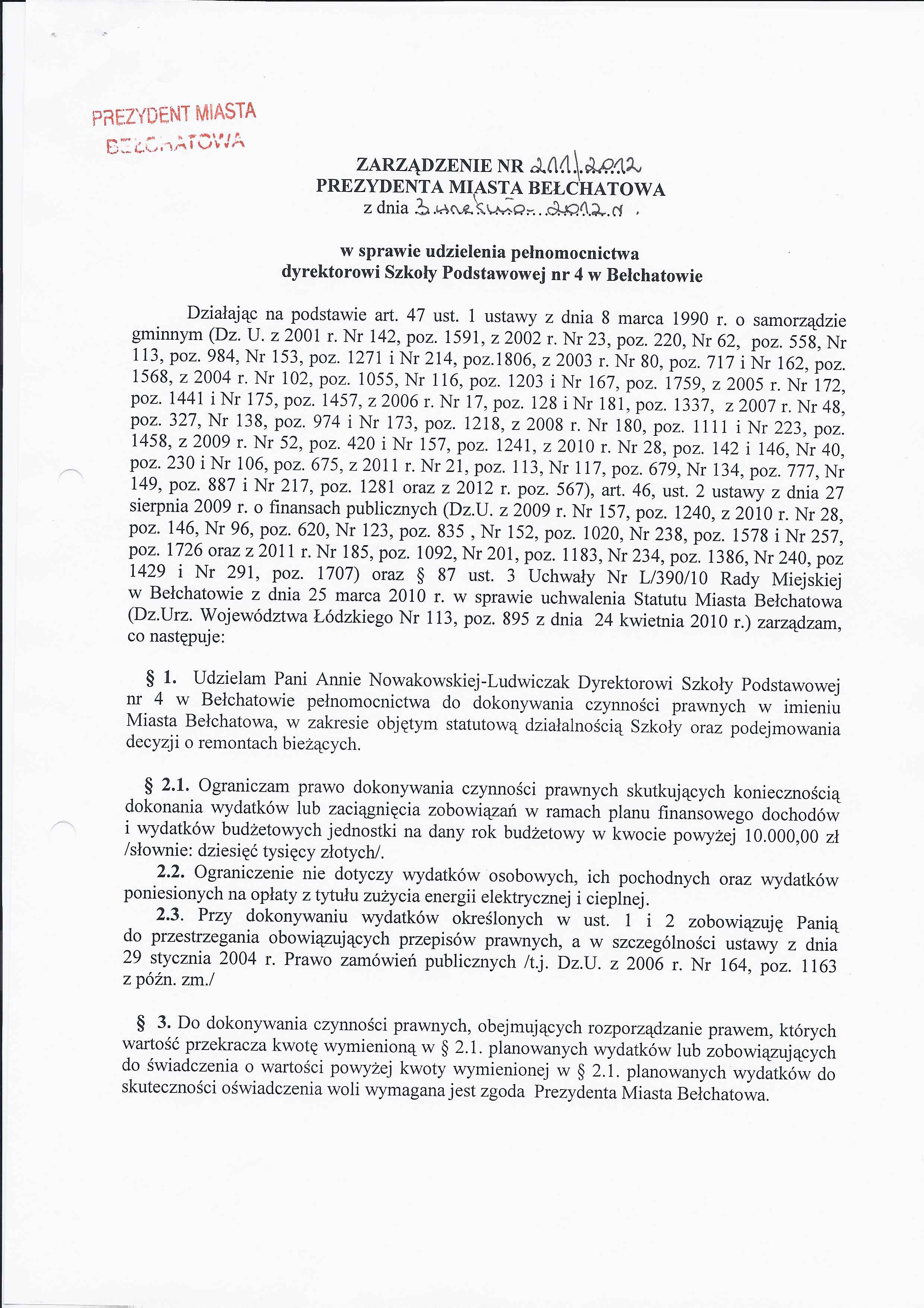Zarządzenie Nr 211 z dnia 3 września 2012 r. w/s udzielenia pełnomocnictwa dyrektorowi Szkoły Podstawowej nr 4 w Bełchatowie