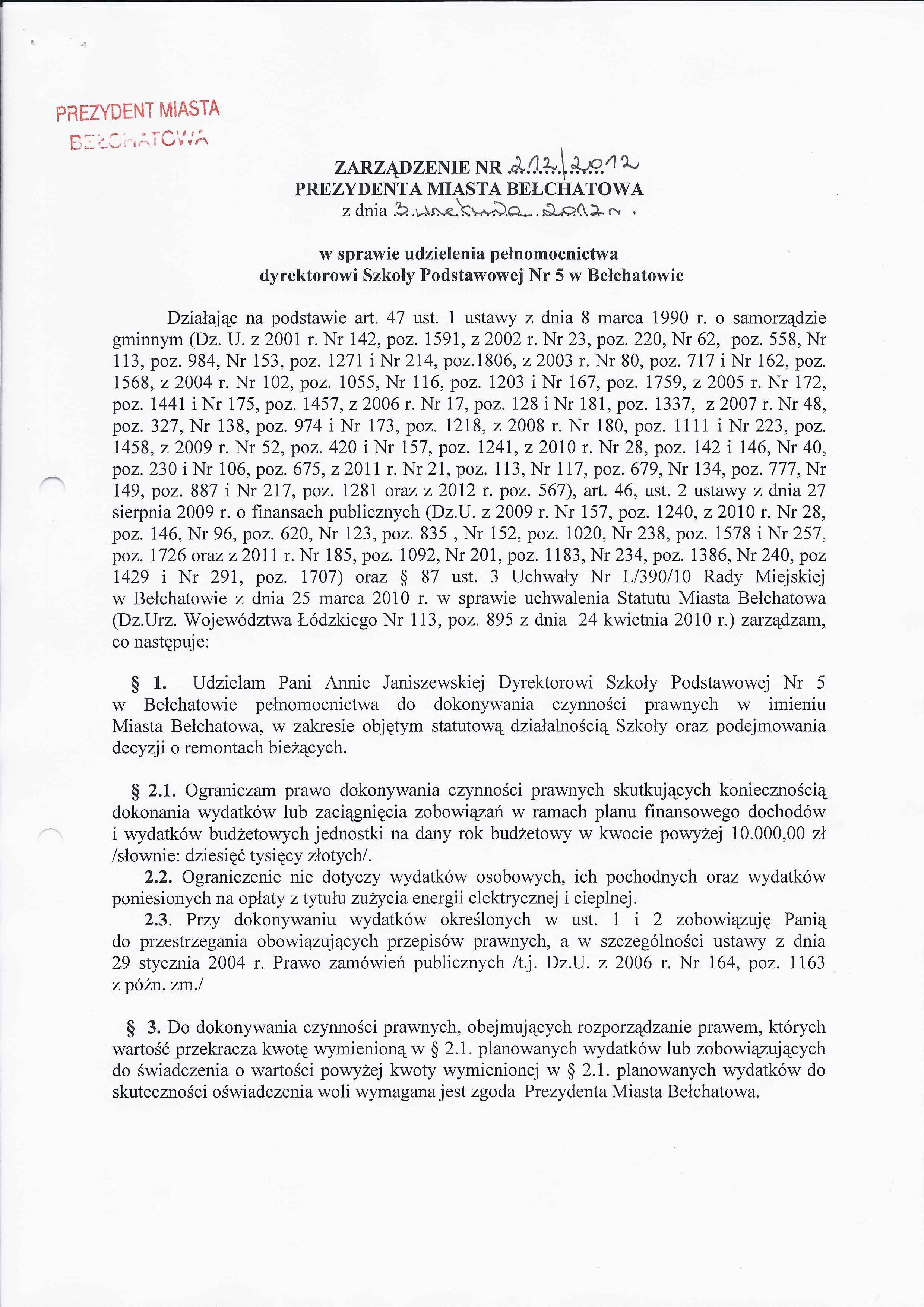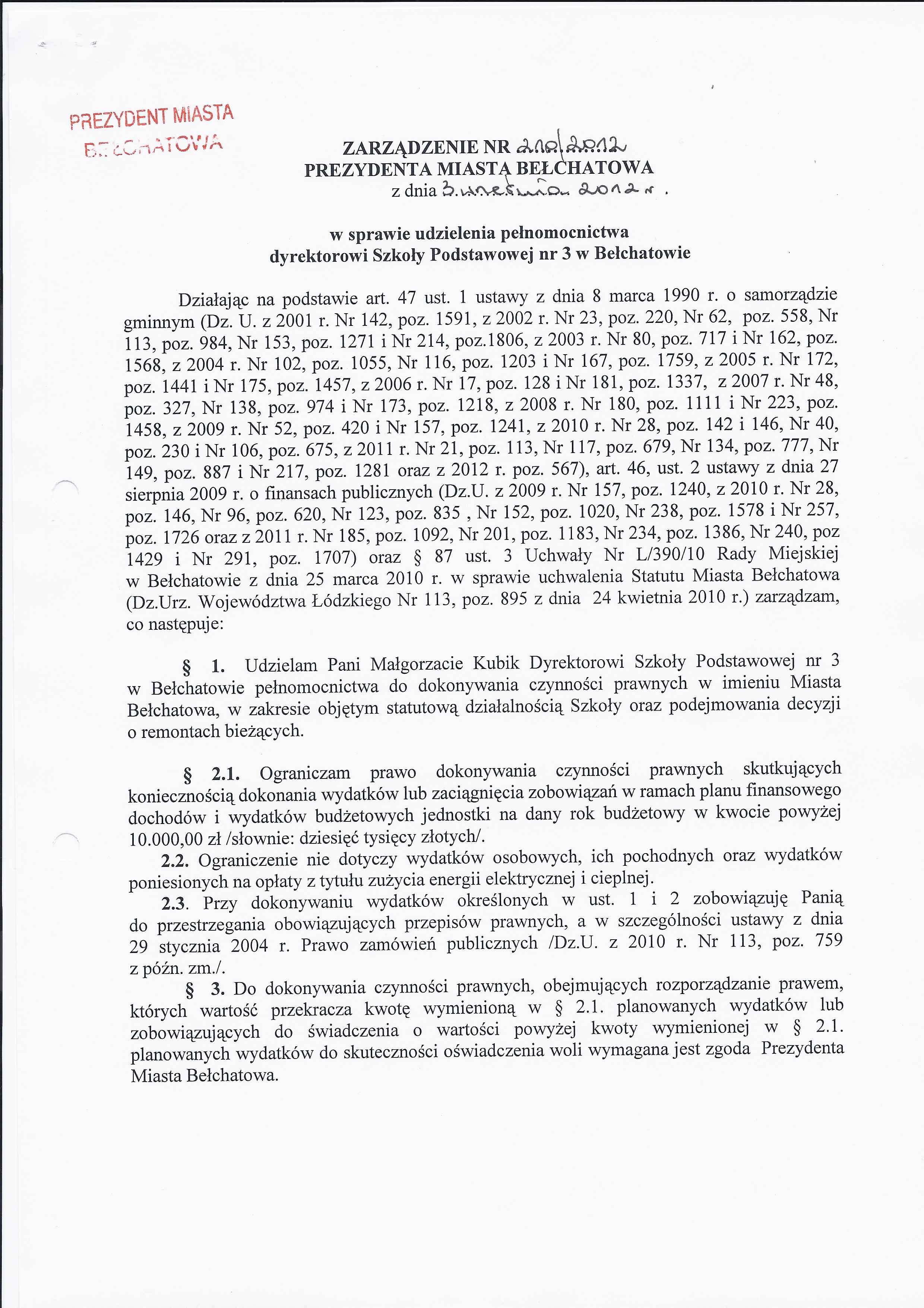 Zarządzenie Nr 210 z dnia 3 września 2012 r. w/s udzielenia pełnomocnictwa dyrektorowi Szkoły Podstawowej nr 3 w Bełchatowie