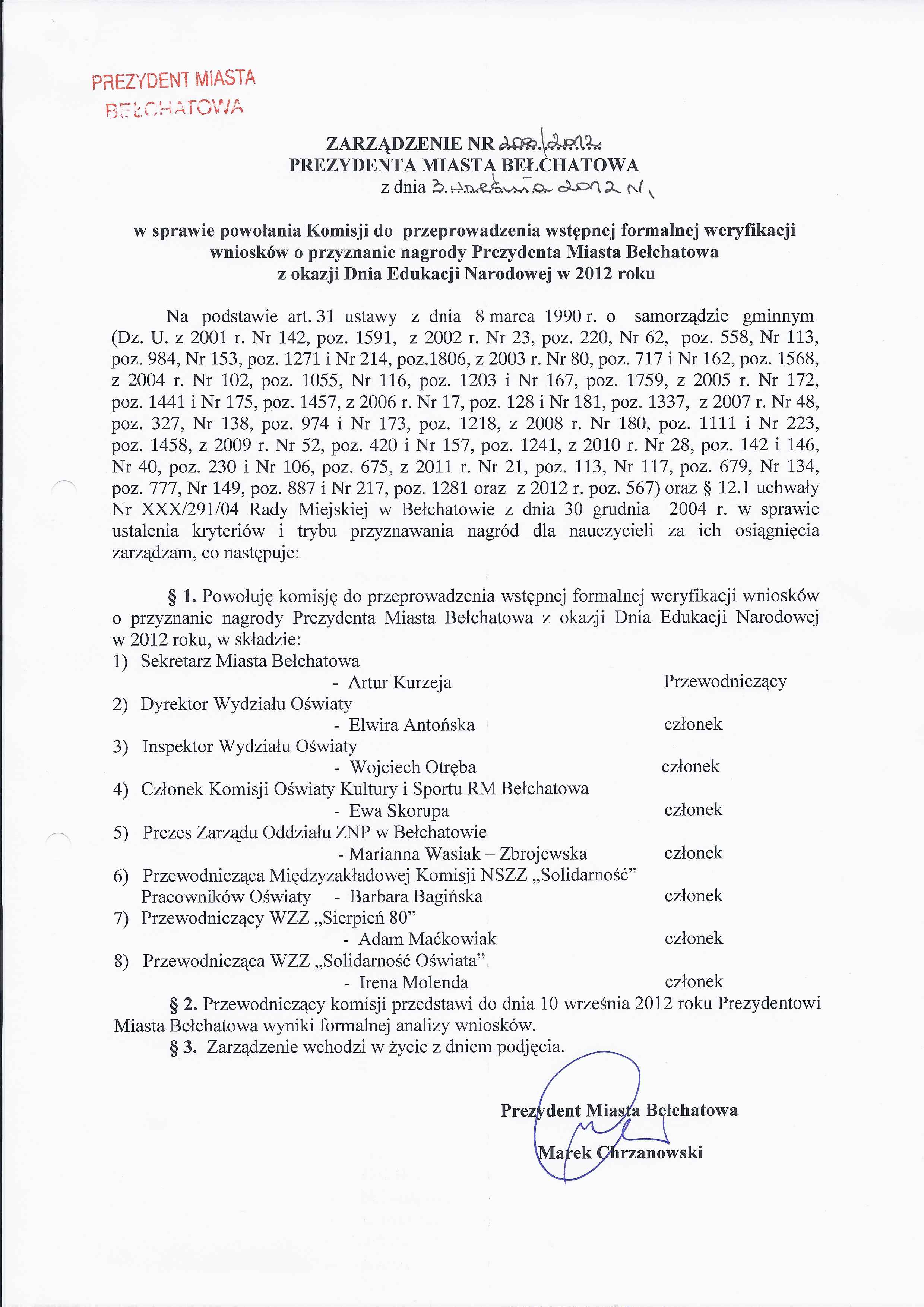 Zarządzenie Nr 208 z dnia 3 września 2012 r. w/s powołania Komisji do przeprowadzenia wstępnej formalnej weryfikacji wniosków o przyznanie nagrody Prezydenta Miasta Bełchatowa z okazji Dnia Edukacji Narodowej w 2012 roku